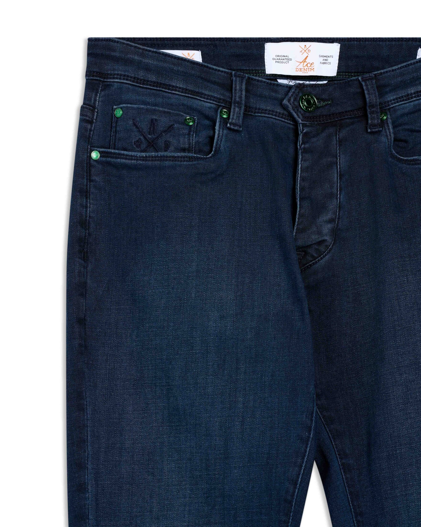 Jeans til herre fra Ace Denim. Laget av en delikat bomullskvalitet med stretch. Tidløs bukse i en smal passform, med klassisk 5-lommer og brodert logo på myntlommen. Prydet med stilige detaljer i grønt for en fullført look.
