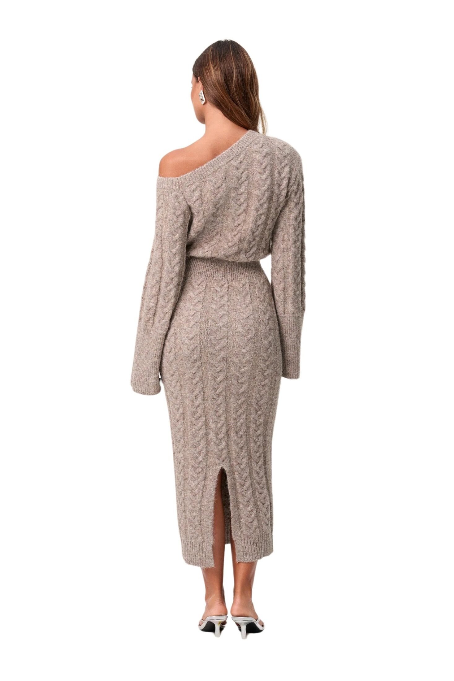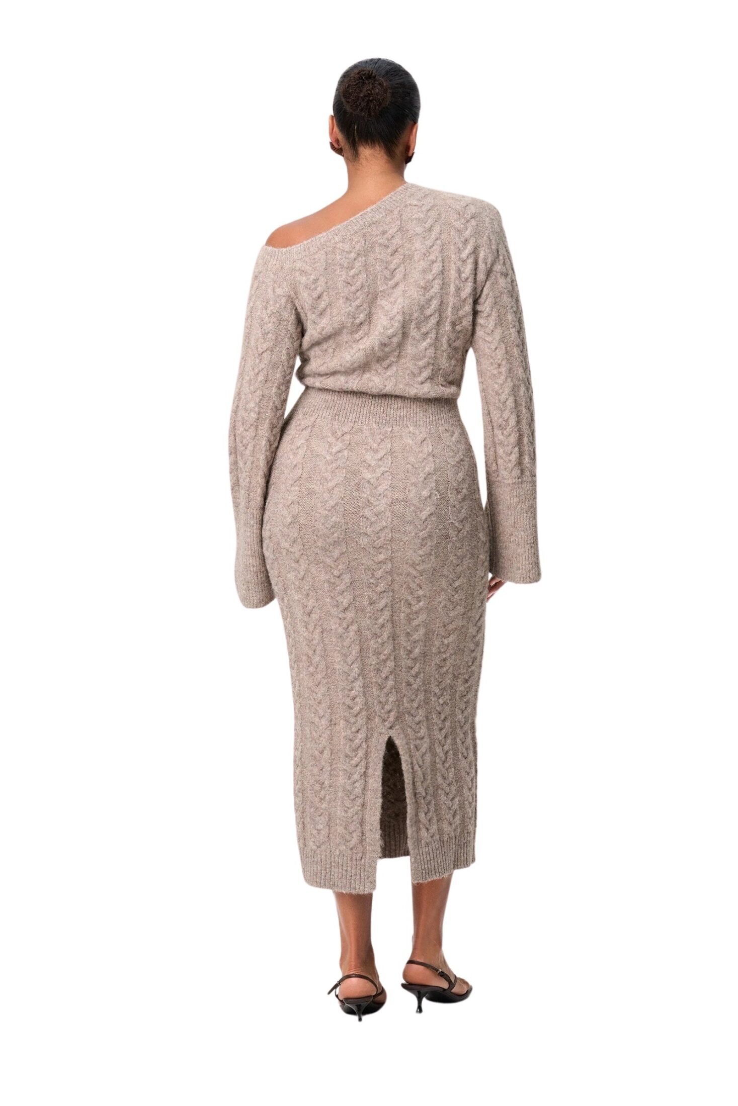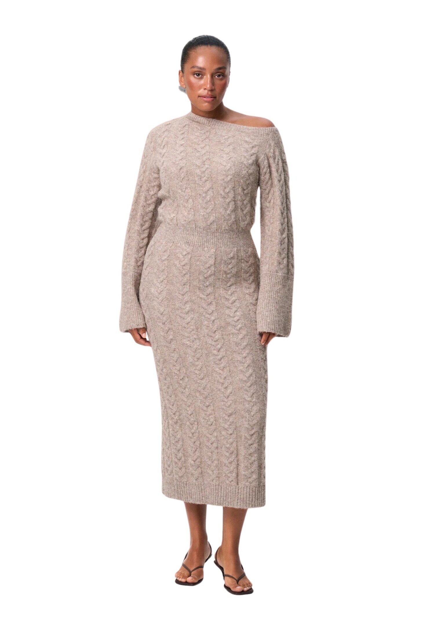 Nydelig strikket kjole fra Adoore med kabelstrikket design. Kjolen har en ettersittende passform med markert midje, vide ermer, og en off-shoulder utringning med skulderpute. Perfekt til både hverdagsbruk og fine anledninger.