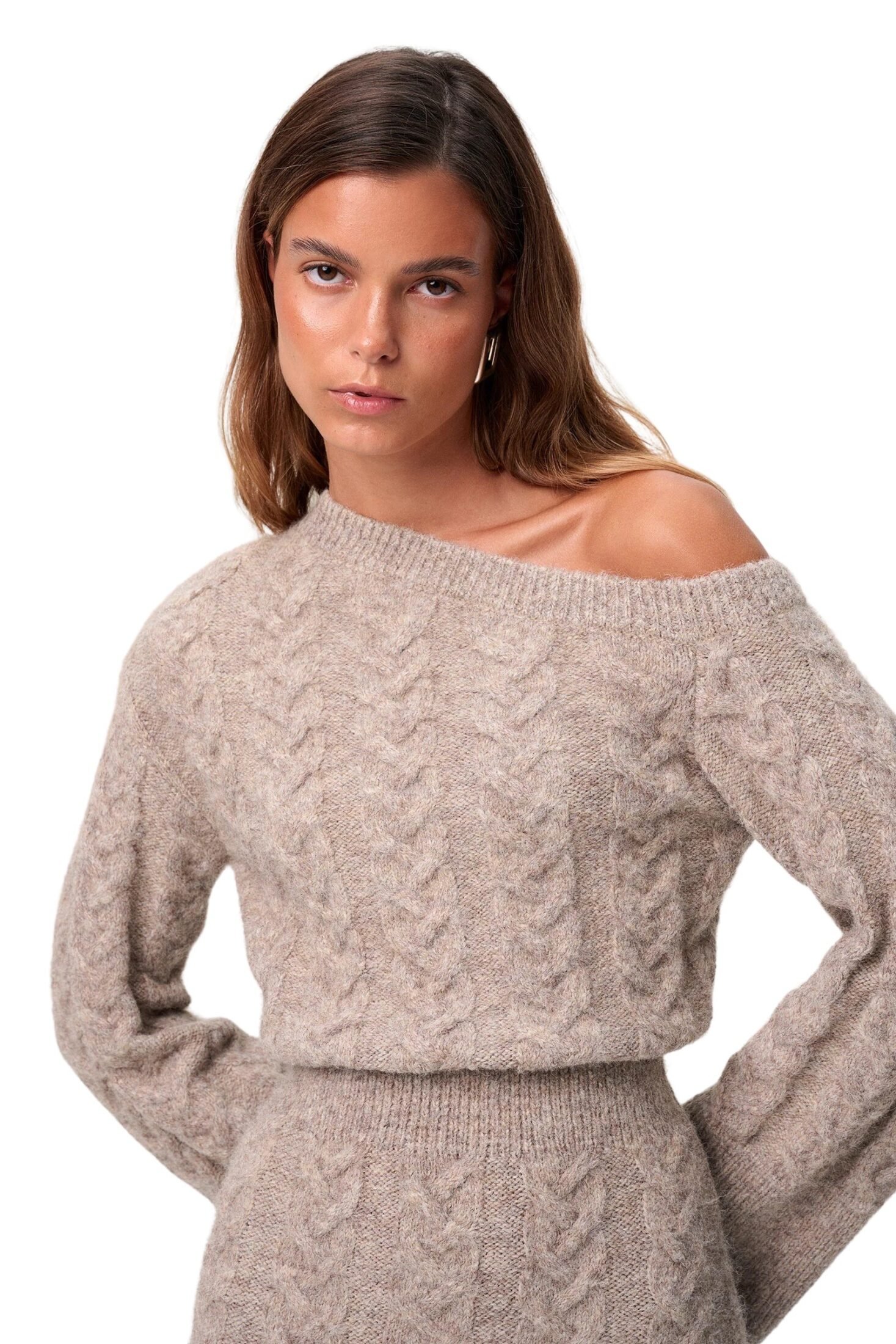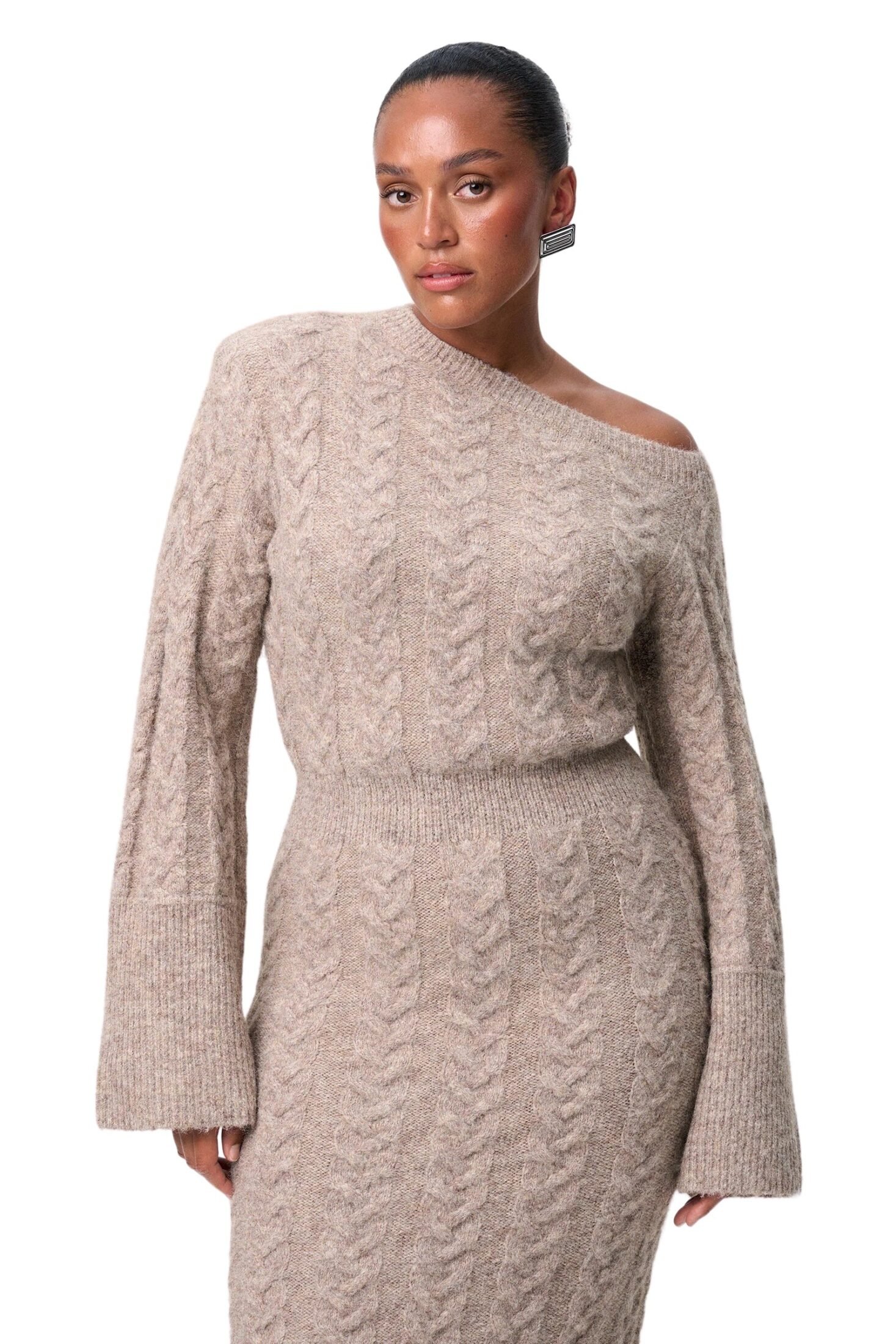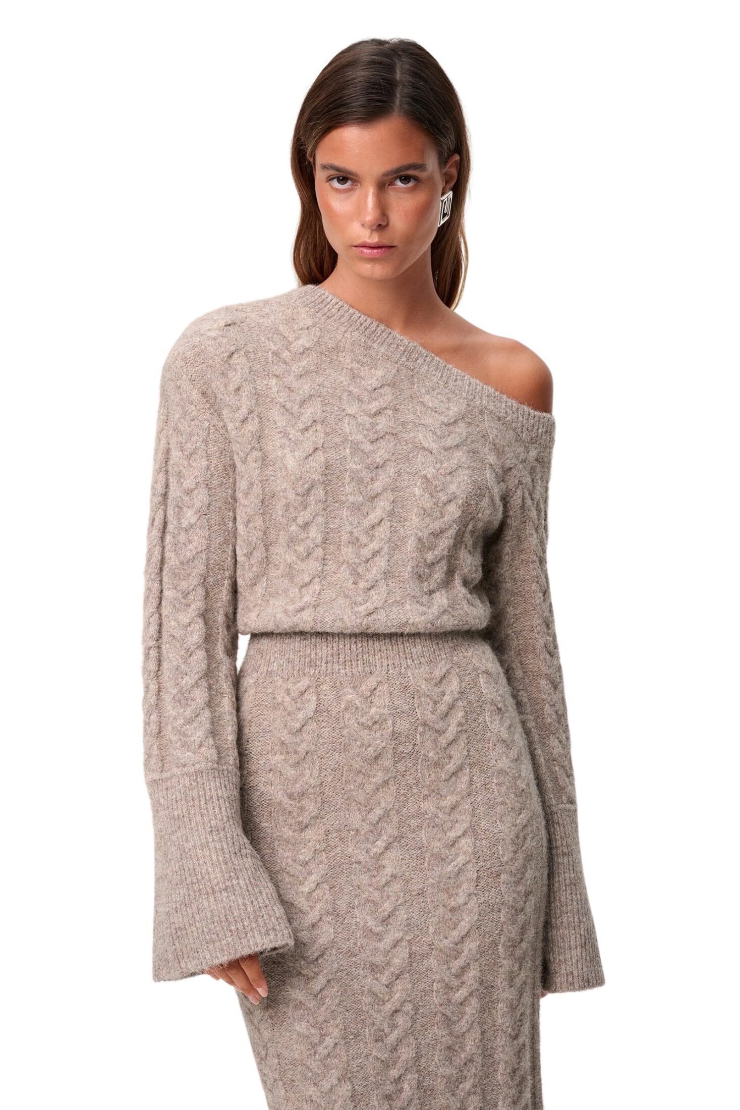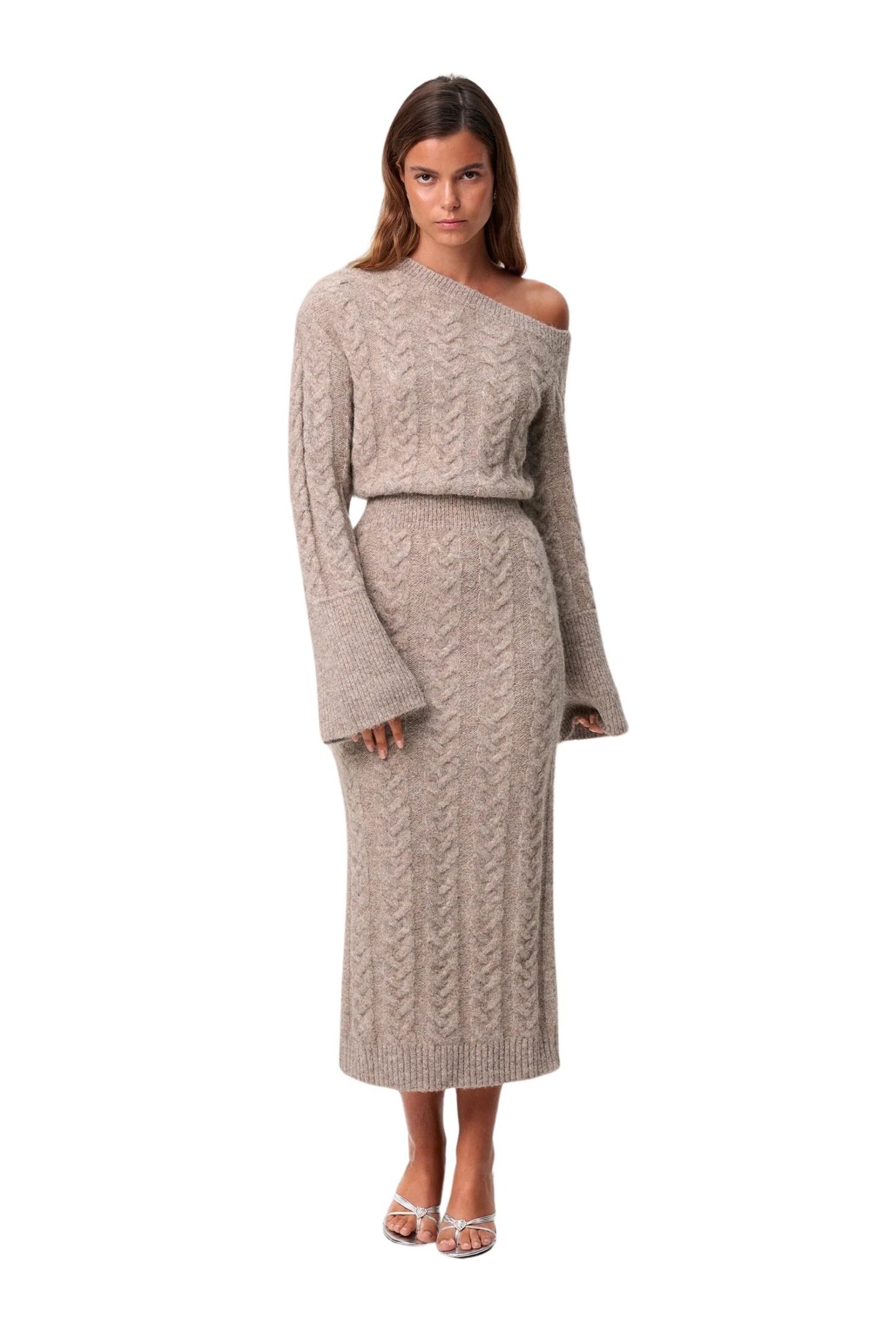 Nydelig strikket kjole fra Adoore med kabelstrikket design. Kjolen har en ettersittende passform med markert midje, vide ermer, og en off-shoulder utringning med skulderpute. Perfekt til både hverdagsbruk og fine anledninger.