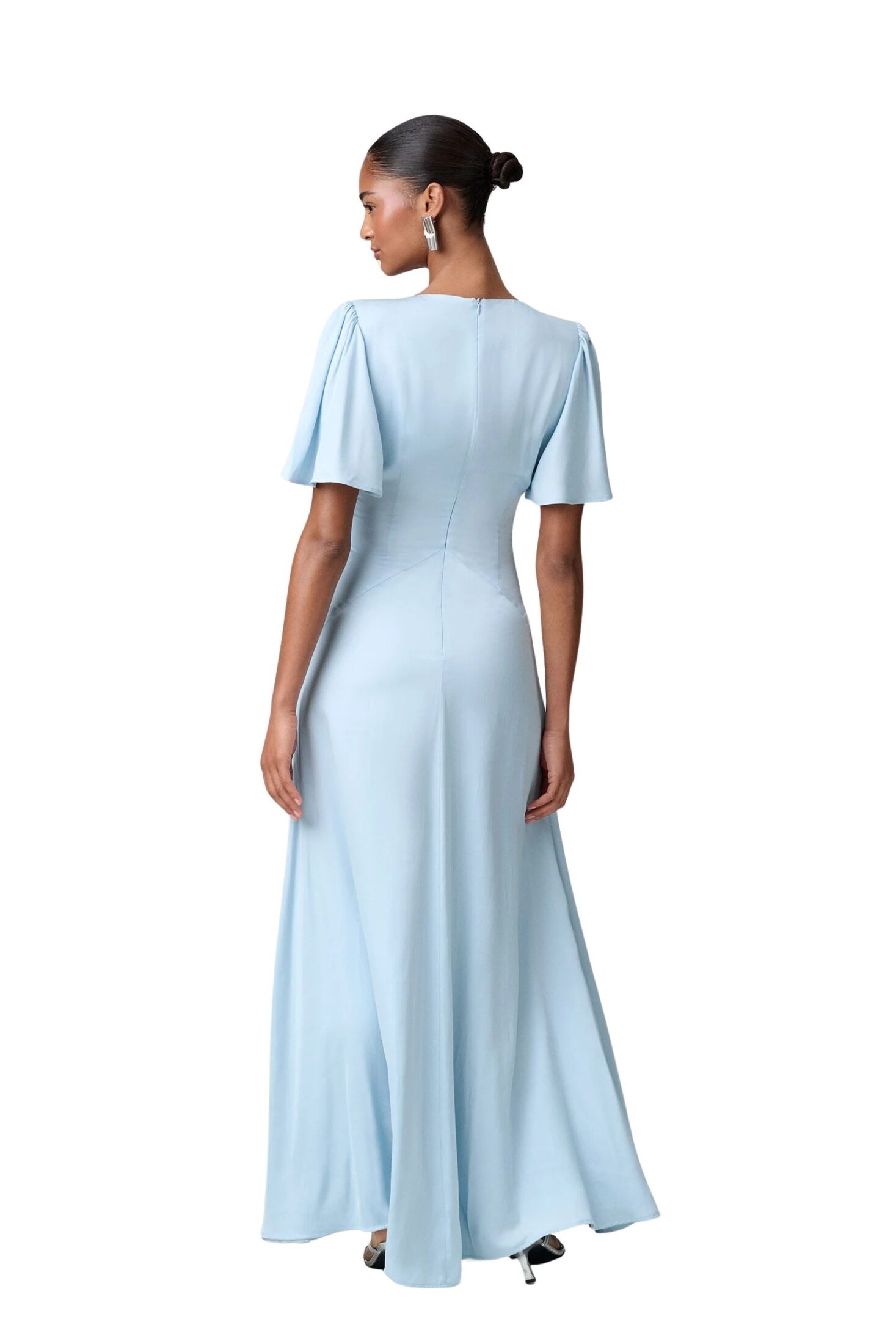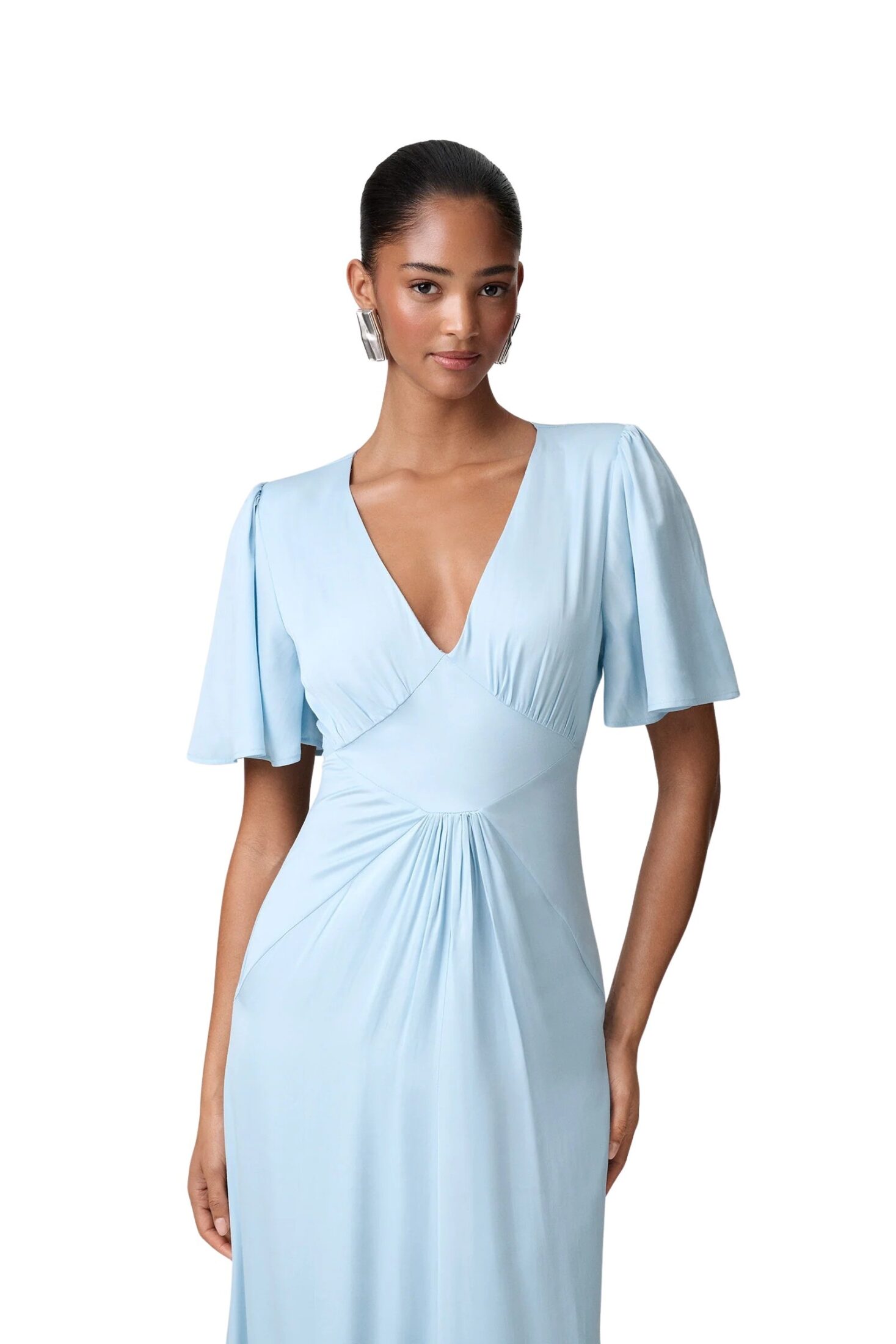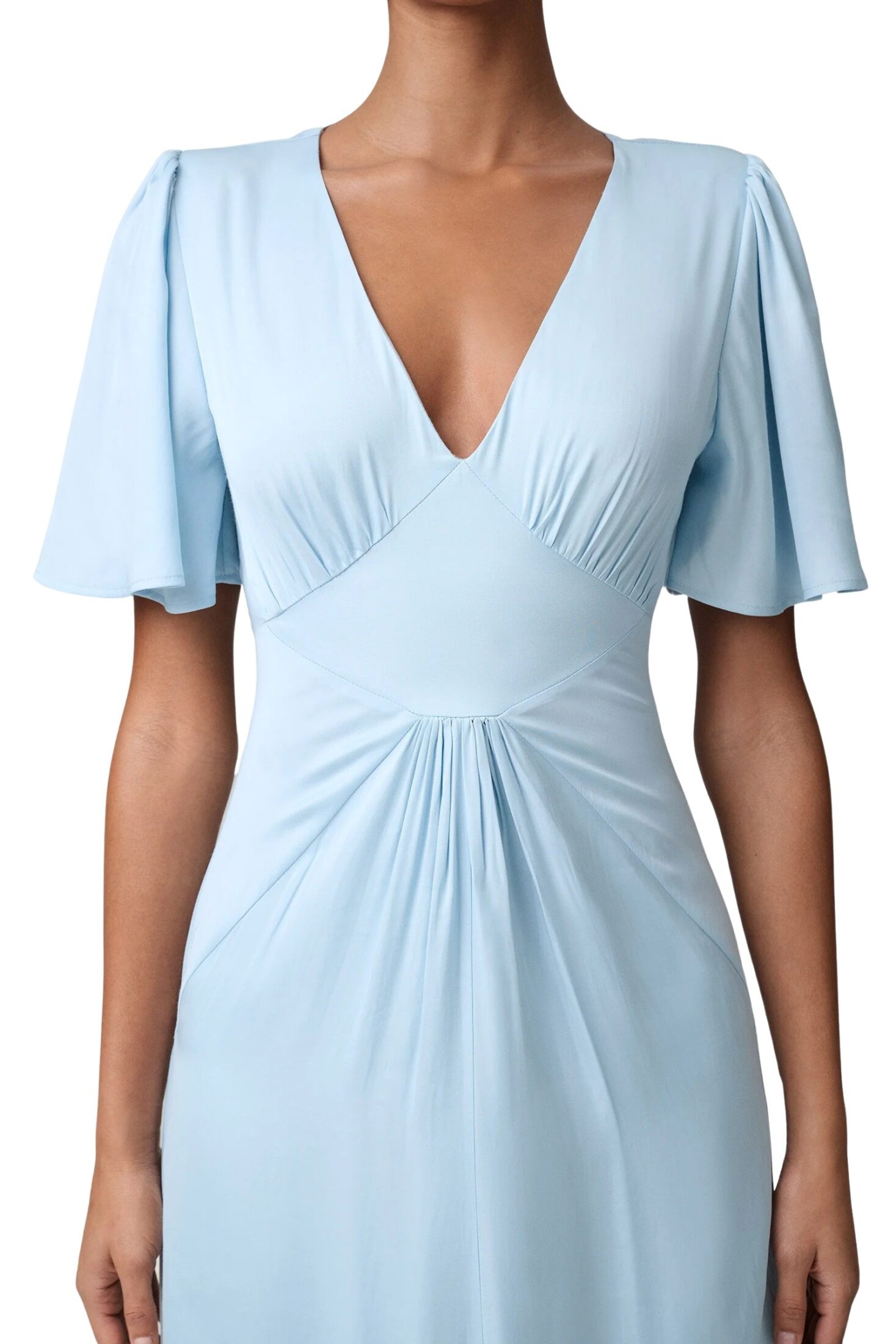 Bari Dress fra Adoore. En feminin kjole med myke rynkedetaljer og V-formet søm som fremhever midjen på en elegant måte. De korte, lette ermene og diskrete skulderputene gir kjolen et sofistikert uttrykk med fin balanse i silhuetten. Skjult glidelås bak sørger for en sømløs finish. Perfekt til bryllup, sommerfester og andre spesielle anledninger.