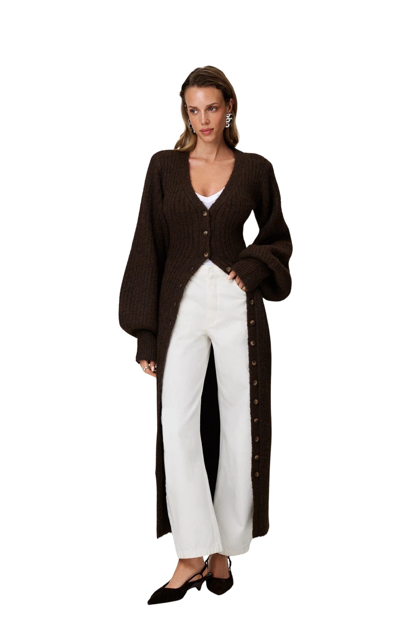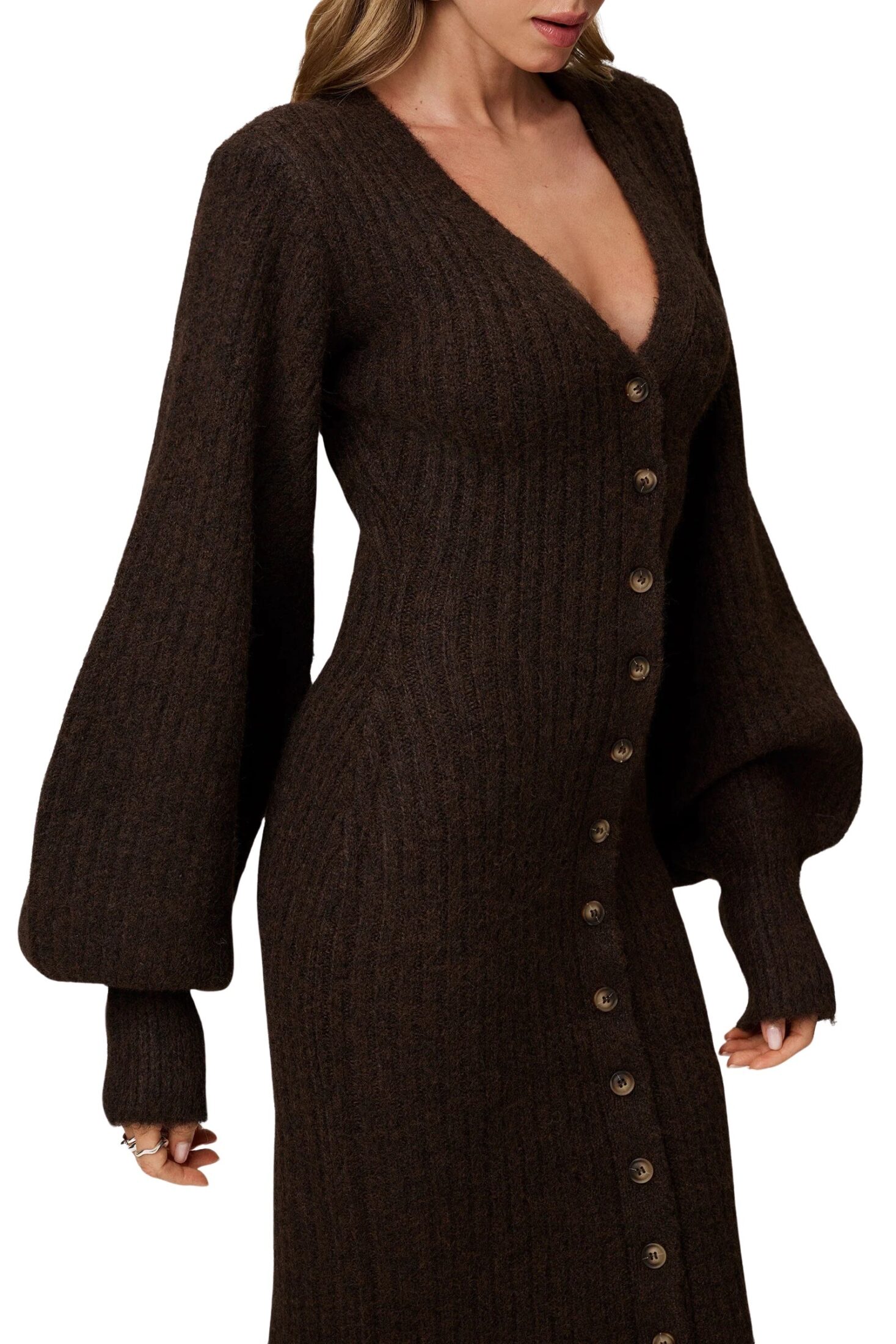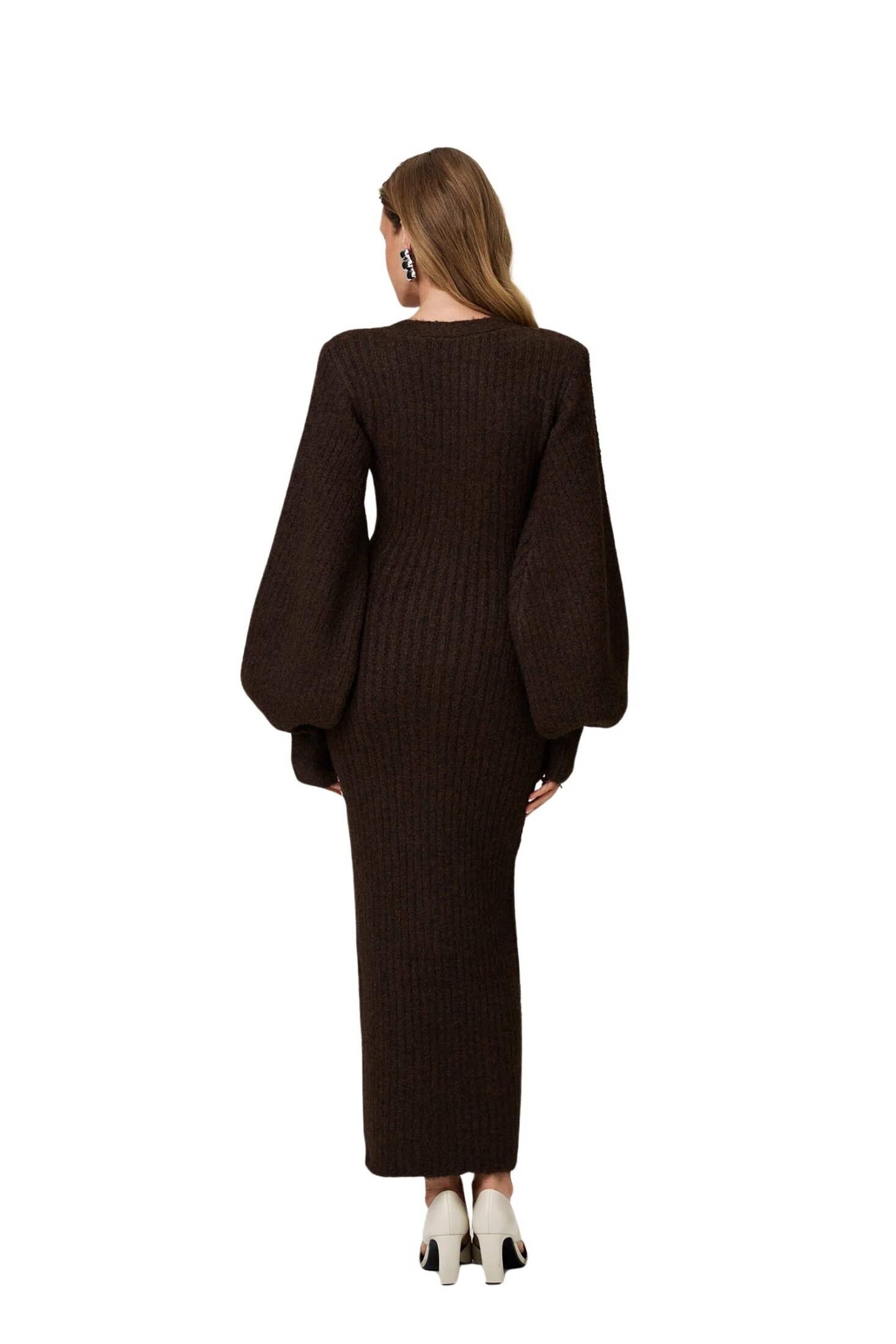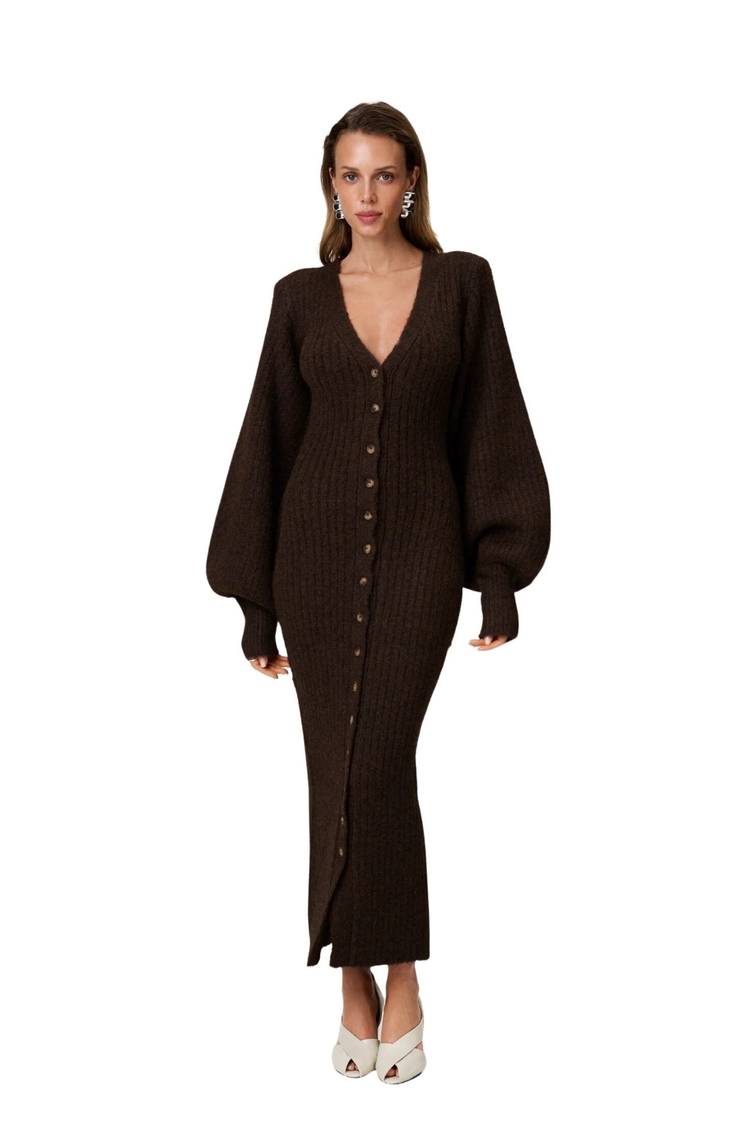 Maxikjole til dame fra Adoore. En timeglassformet kjole laget av et behagelig strikket stoff. Kjolen har knappelukking foran, V-hals og lange ballongermer med tettsittende mansjetter.