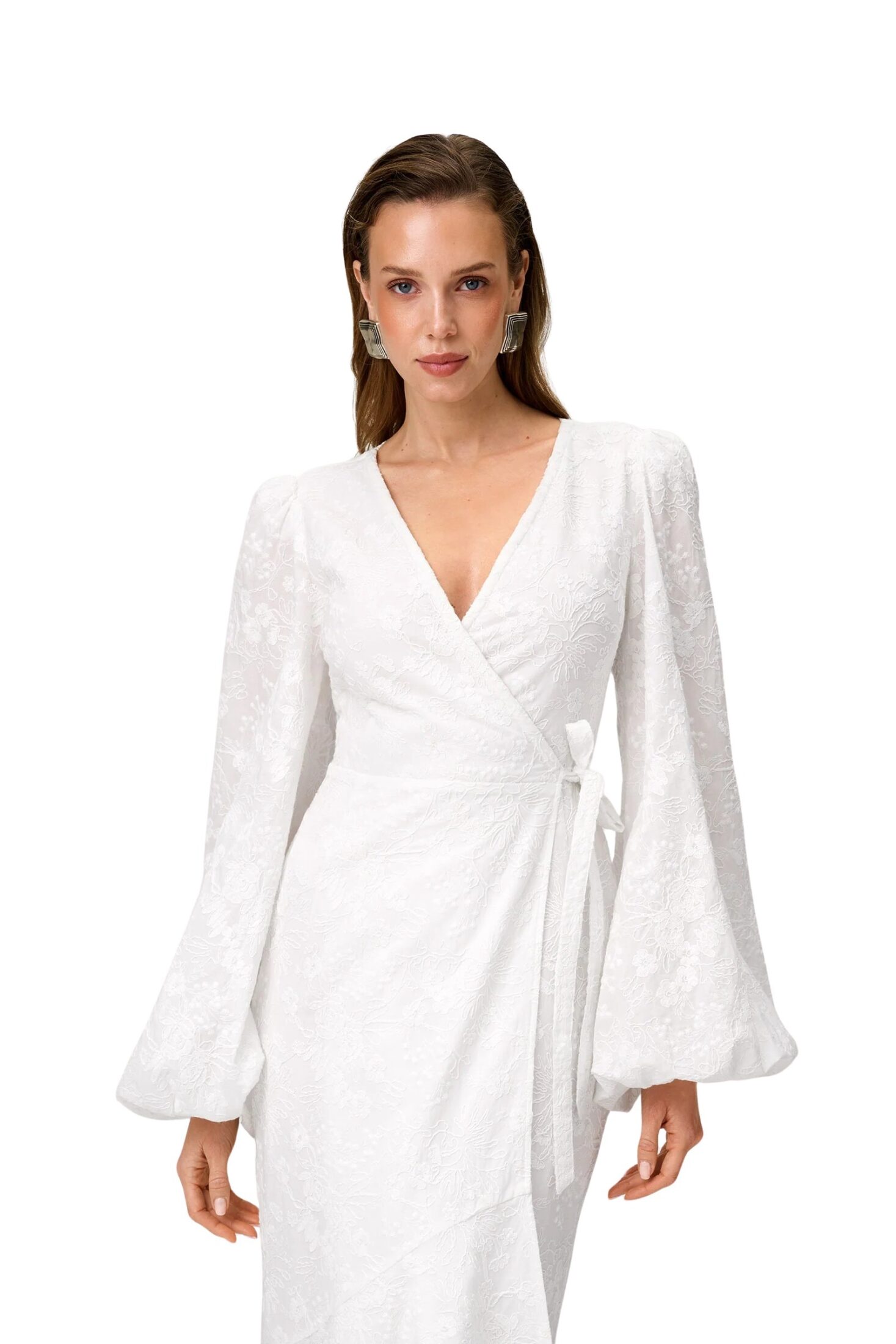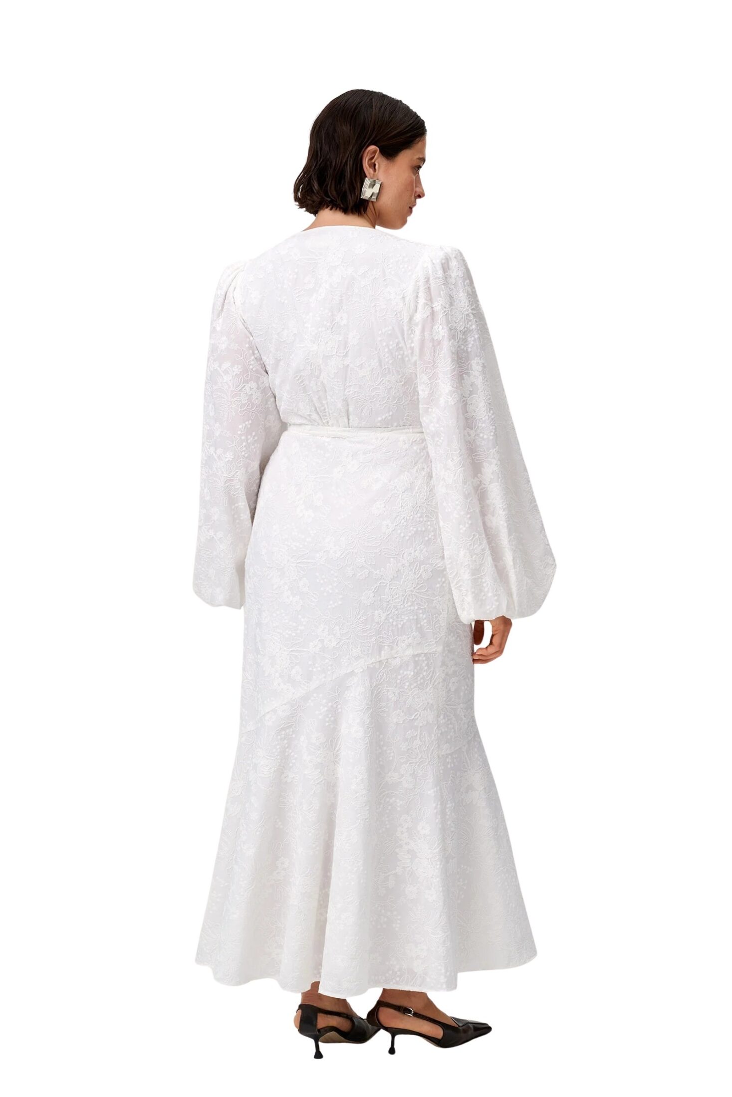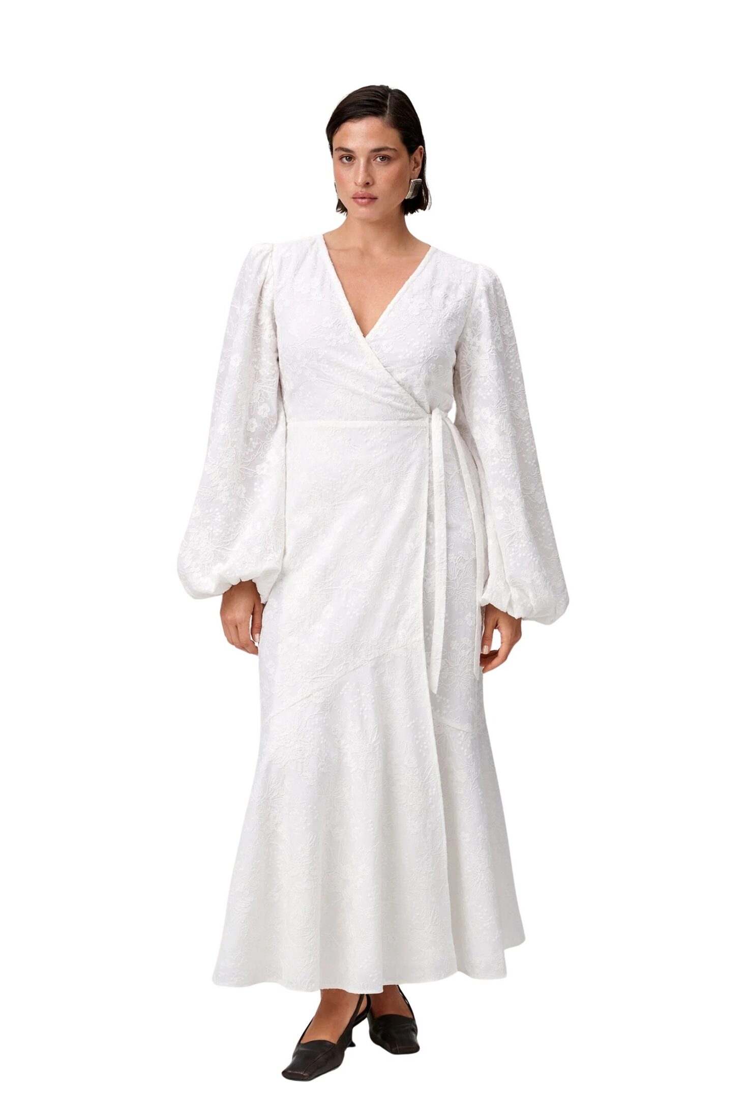 Portofino Maxi Dress fra Adoore i hvit broderi. Kjolen har en flatterende omslagsfasong som markerer midjen på en elegant måte. De voluminøse ermene gir et iøynefallende og sofistikert uttrykk. Helfôret kvalitet sikrer en komfortabel passform. Perfekt til både fest og spesielle anledninger.