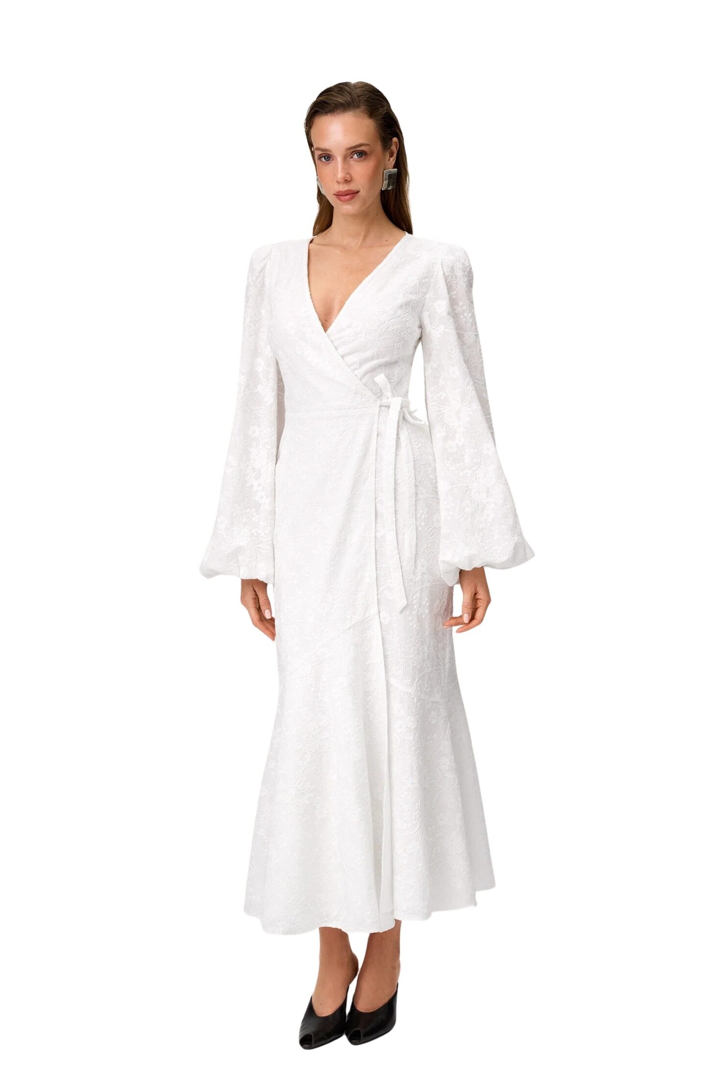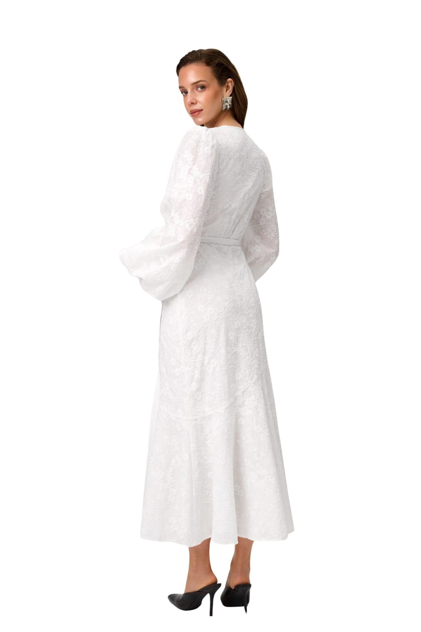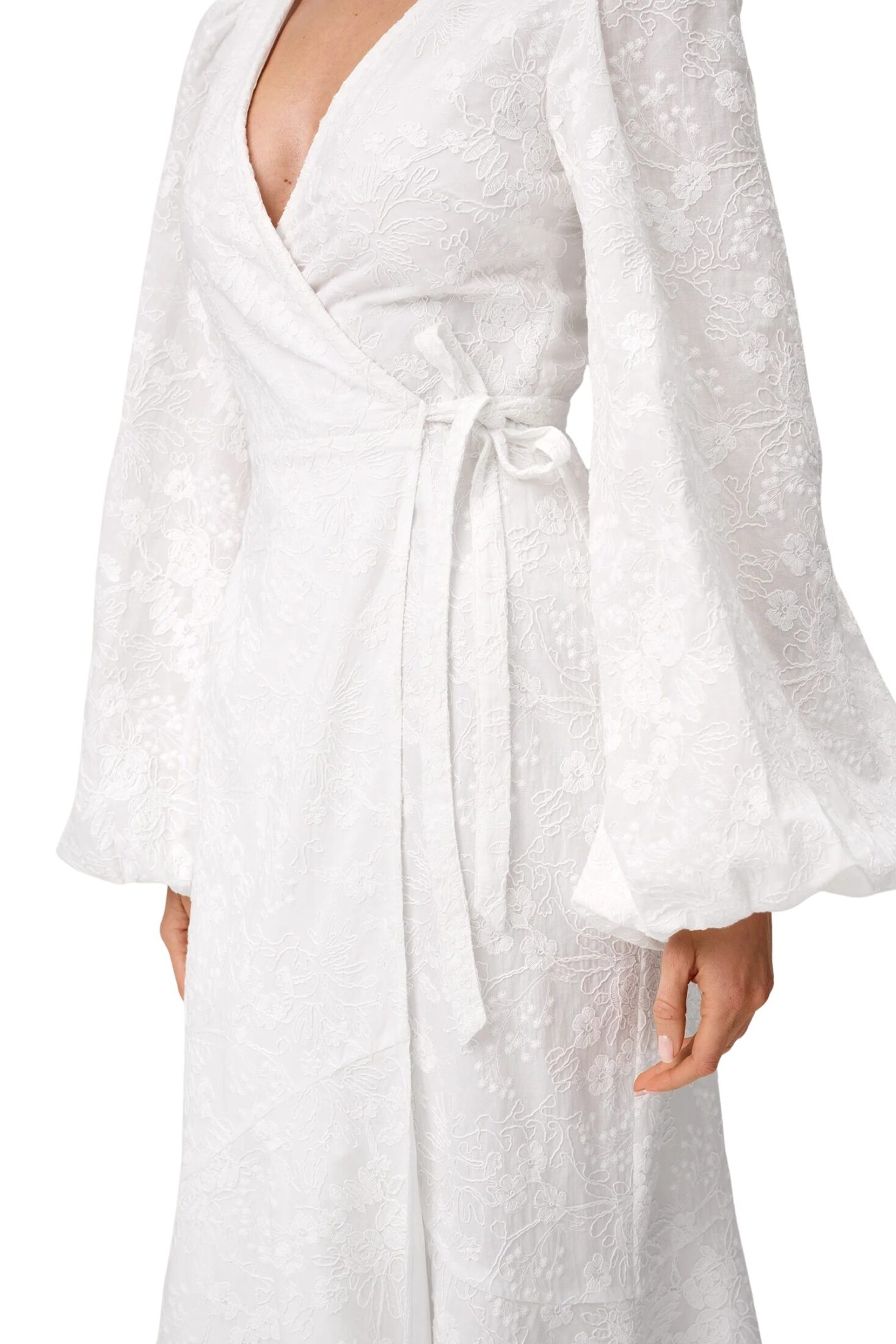 Portofino Maxi Dress fra Adoore i hvit broderi. Kjolen har en flatterende omslagsfasong som markerer midjen på en elegant måte. De voluminøse ermene gir et iøynefallende og sofistikert uttrykk. Helfôret kvalitet sikrer en komfortabel passform. Perfekt til både fest og spesielle anledninger.