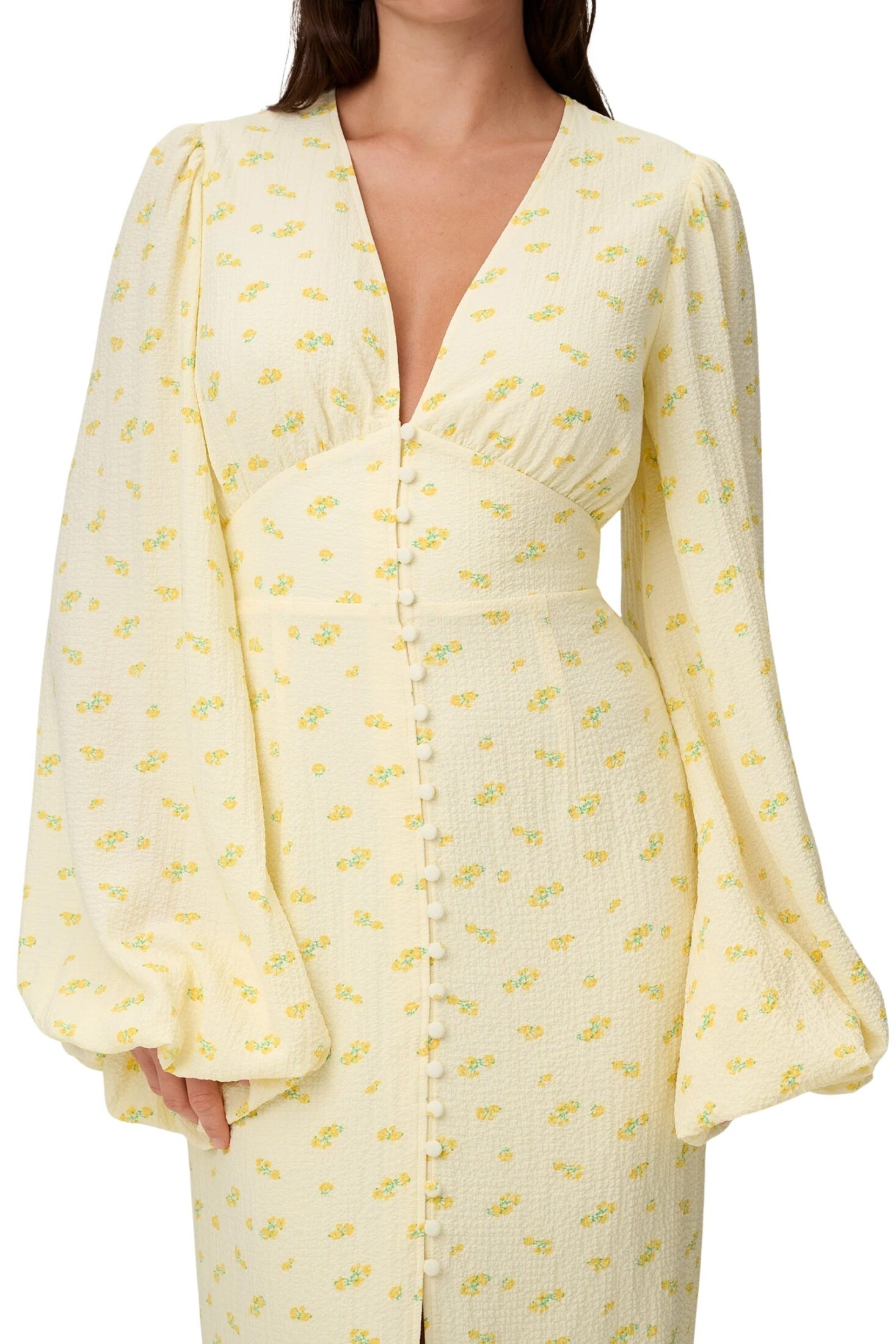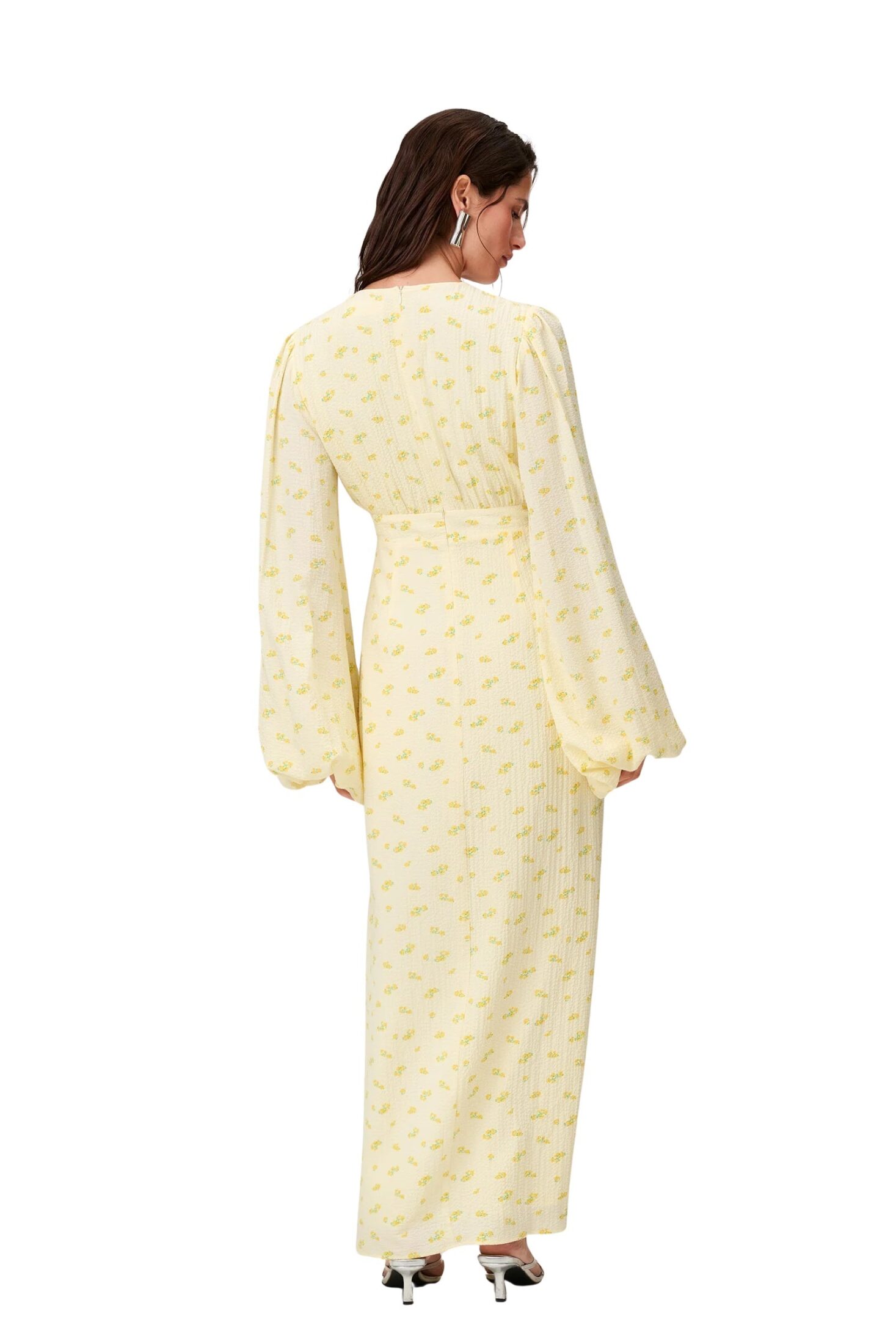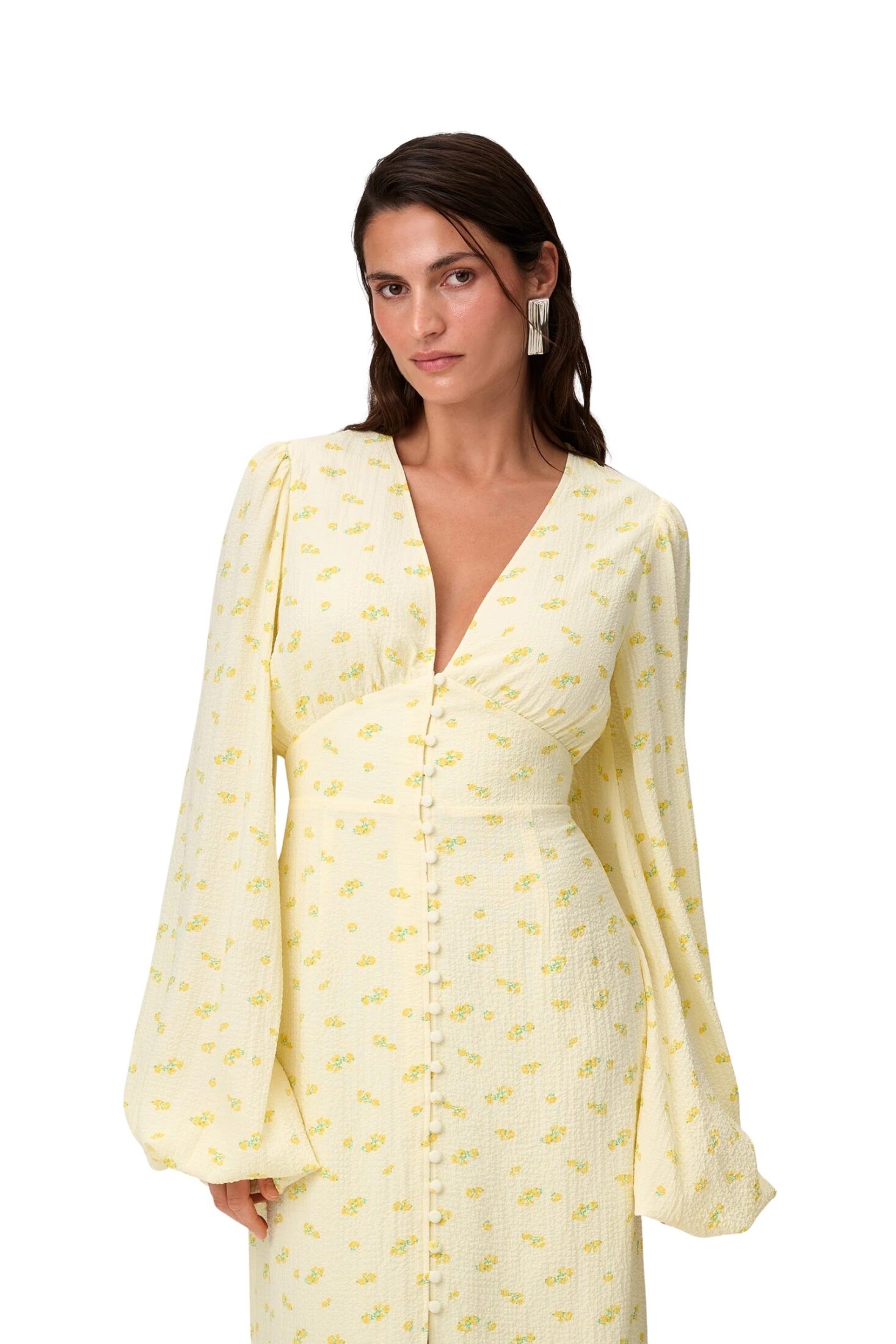 Positano Dress fra Adoore i pastelgul. En feminin silhuett med V-utringning, dekorative knapper i front og en elegant splitt som gir bevegelse. De lange, voluminøse ermene tilfører et sofistikert preg, mens den helfôrede kvaliteten sikrer komfort. Skjult glidelås bak gir en sømløs finish. Perfekt til sesongens festlige anledninger.