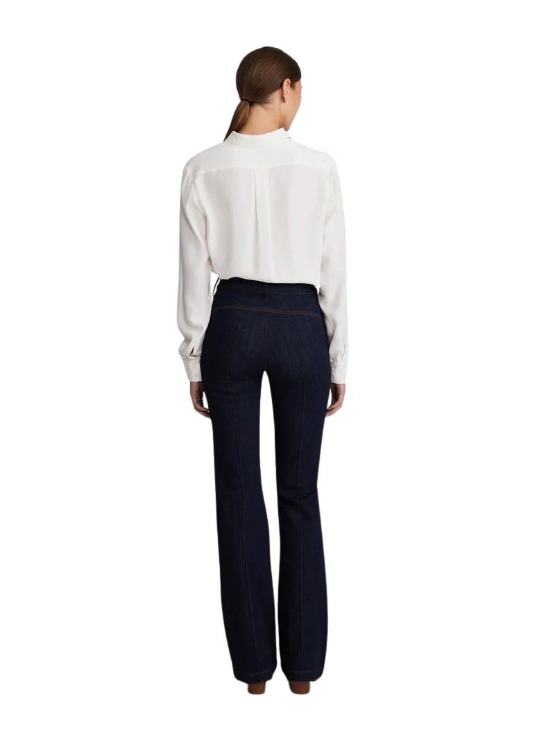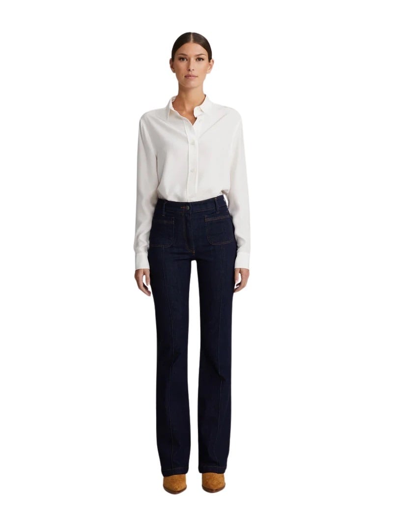 Klassiske jeans til dame fra Andiata i bomullsdenim med lett stretch. Modellen har normal midje, utsvingte ben, påsydde lommer og søm-detaljer bak. Et tidløst plagg som kombinerer komfort med en elegant silhuett.