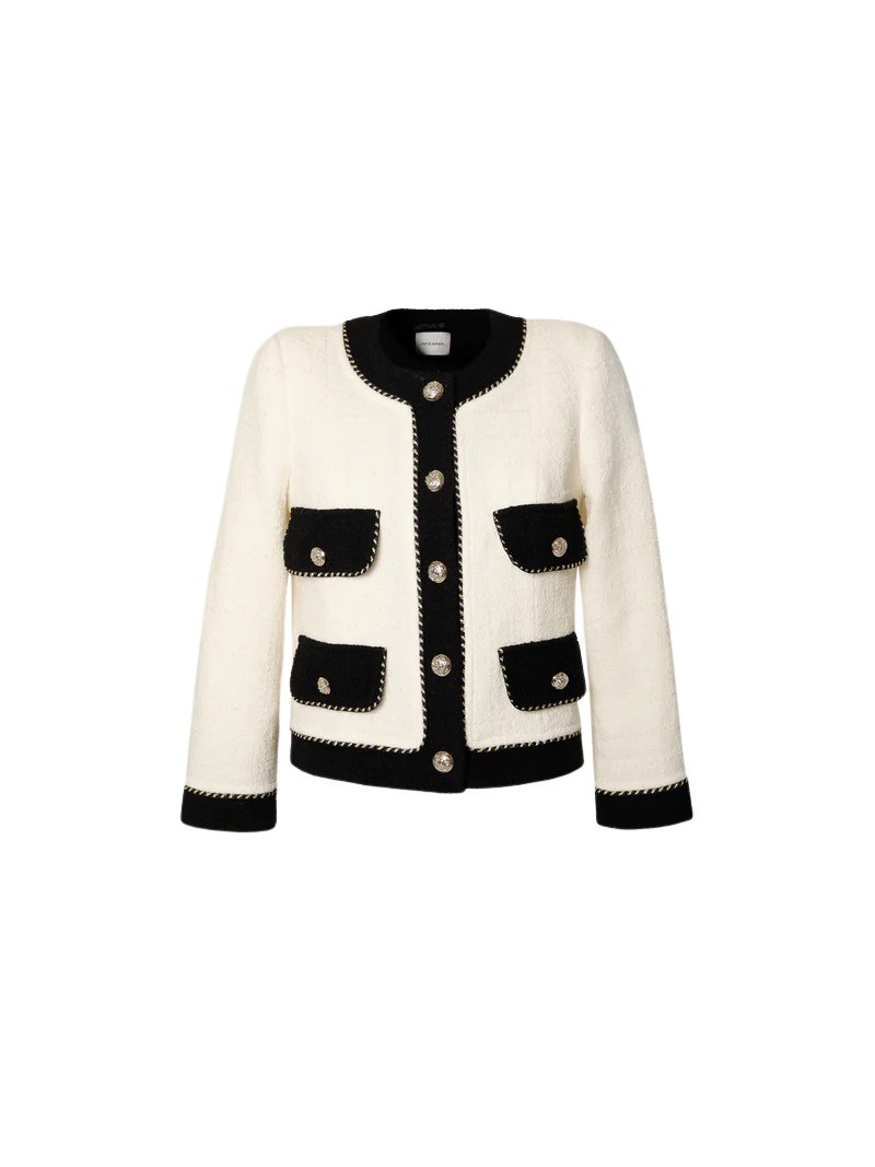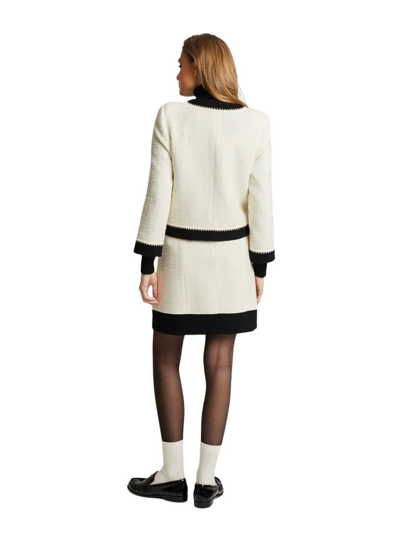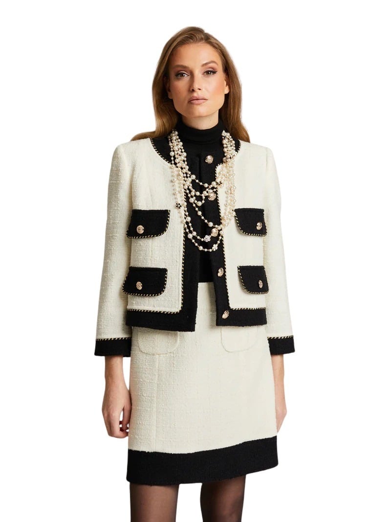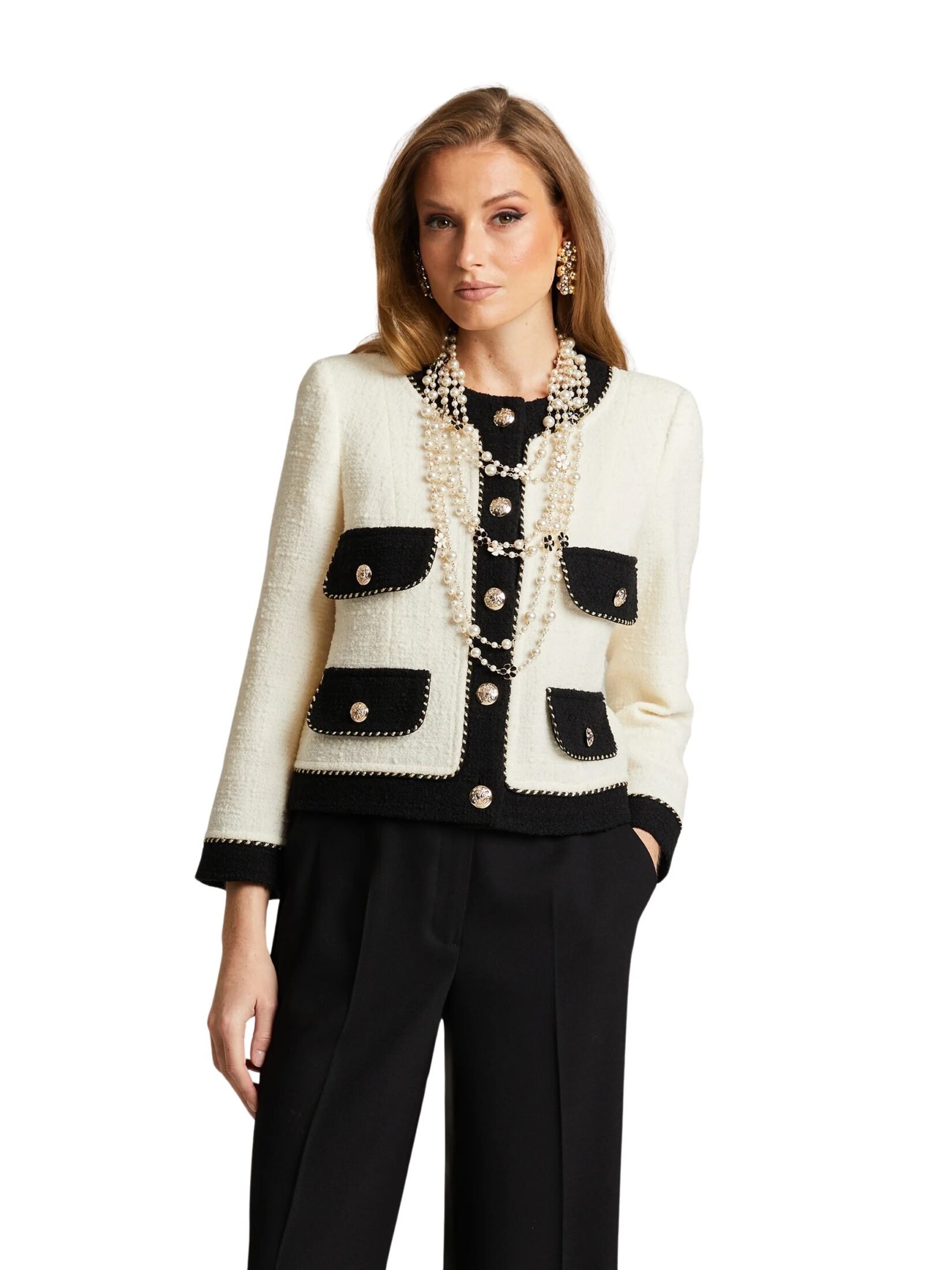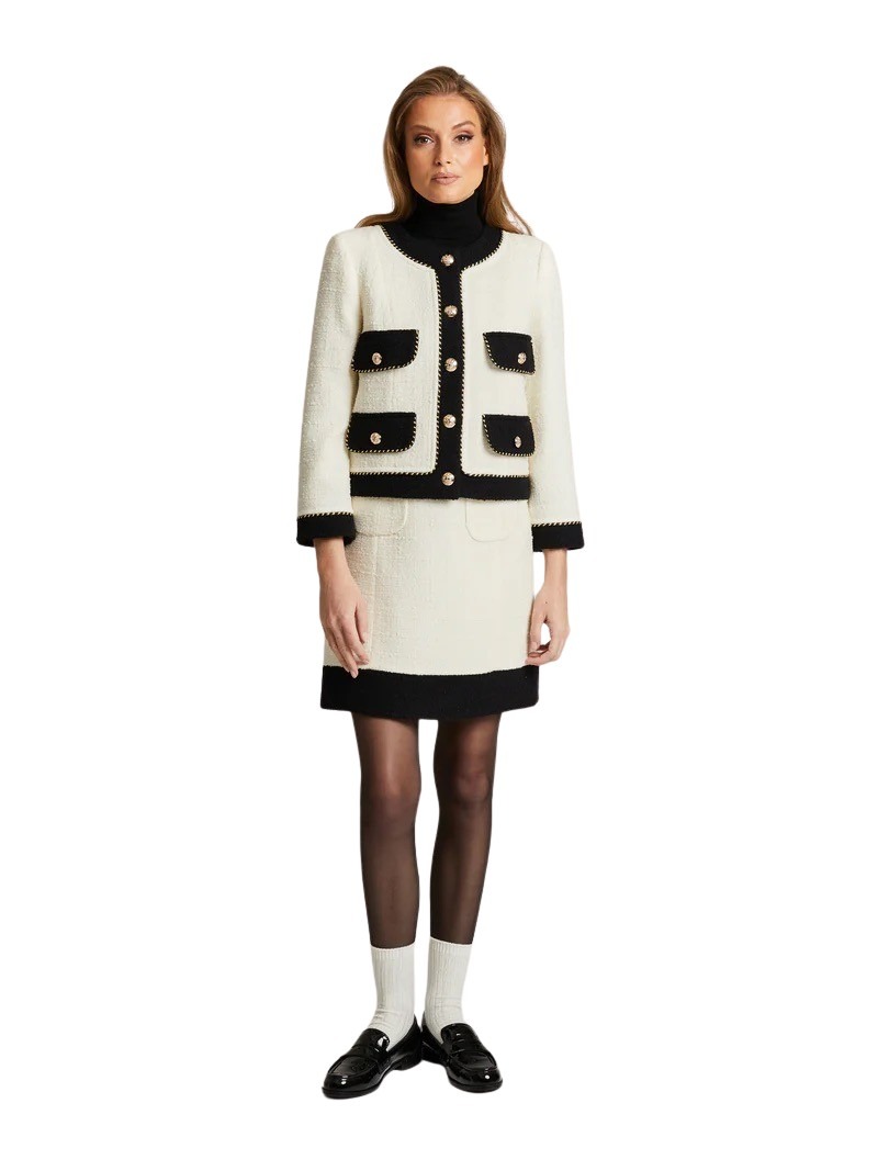 Bouclé blazer til dame fra Andiata i eksklusiv italiensk ullblanding. Modellen har en rett silhuett, 3/4-lange ermer, fire dekorative klafflommer og gullfargede knapper. En helfôret blazer som gir et elegant og sofistikert uttrykk, perfekt å kombinere med Luci Bouclé Skirt for et komplett sett.