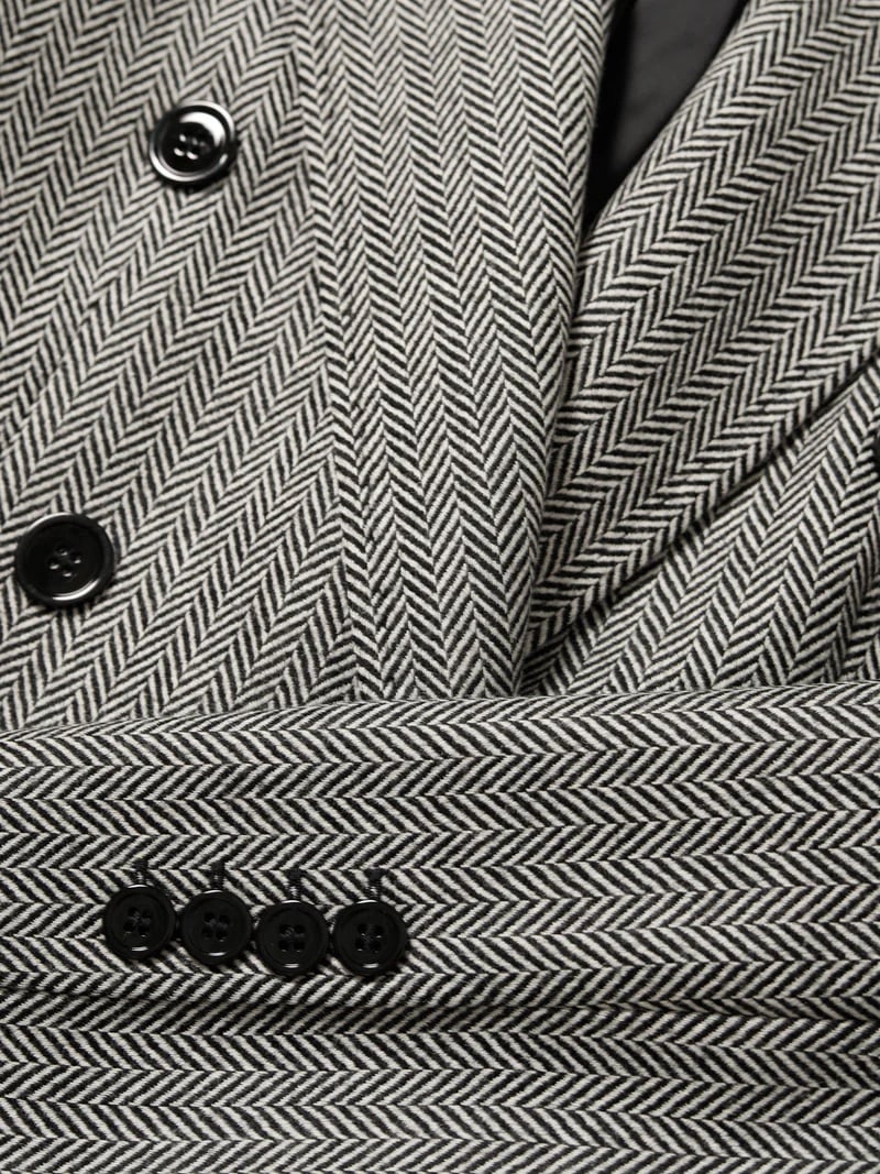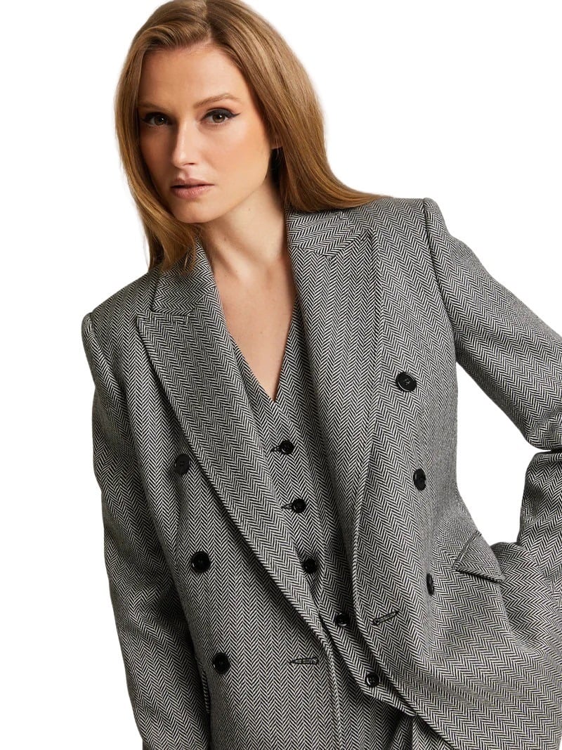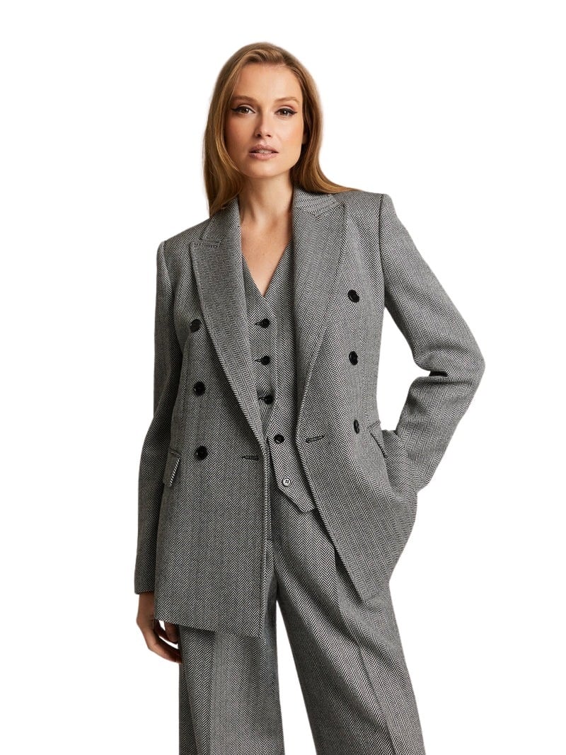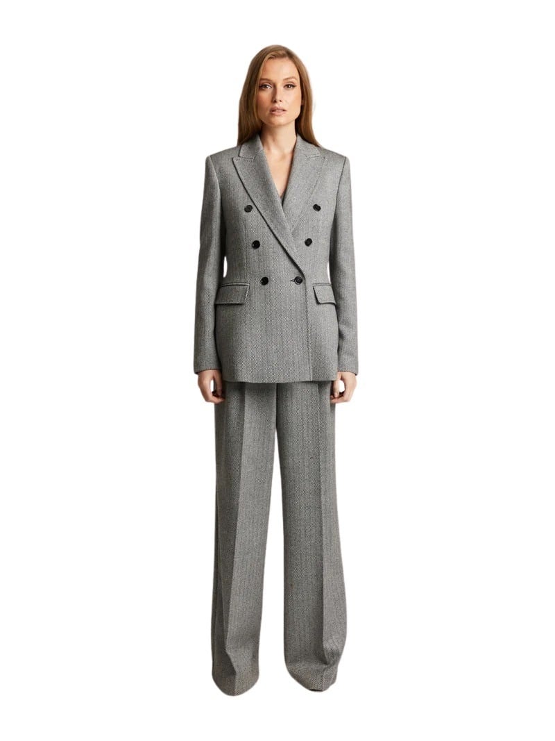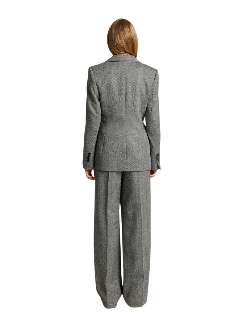 Dobbeltspent blazer til dame fra Andiata, sydd i italiensk ull med klassisk fiskebeinsmønster. Modellen har normal passform, klafflommer og ekte perlemorsknapper. Kragen er detaljert med håndsydde sting. Perfekt sammen med Gytta Trousers for et sofistikert uttrykk.