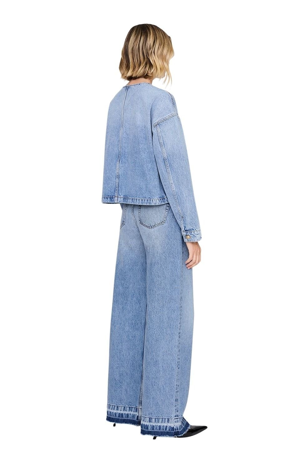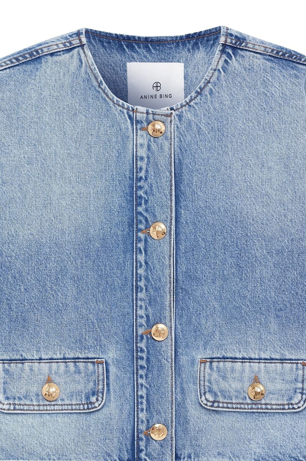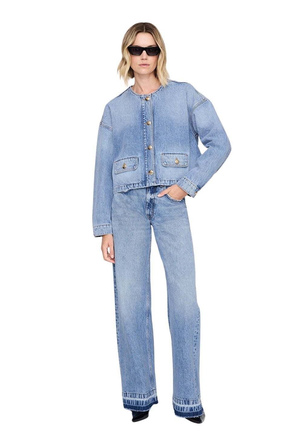 Blanche Jacket fra Anine Bing. En kort denimjakke med en moderne, avslappet silhuett. Designet i lys blå vask med dekorative gullknapper og praktiske frontlommer som gir et raffinert preg. Perfekt å style til matchende denim eller over en enkel topp for en gjennomført look.