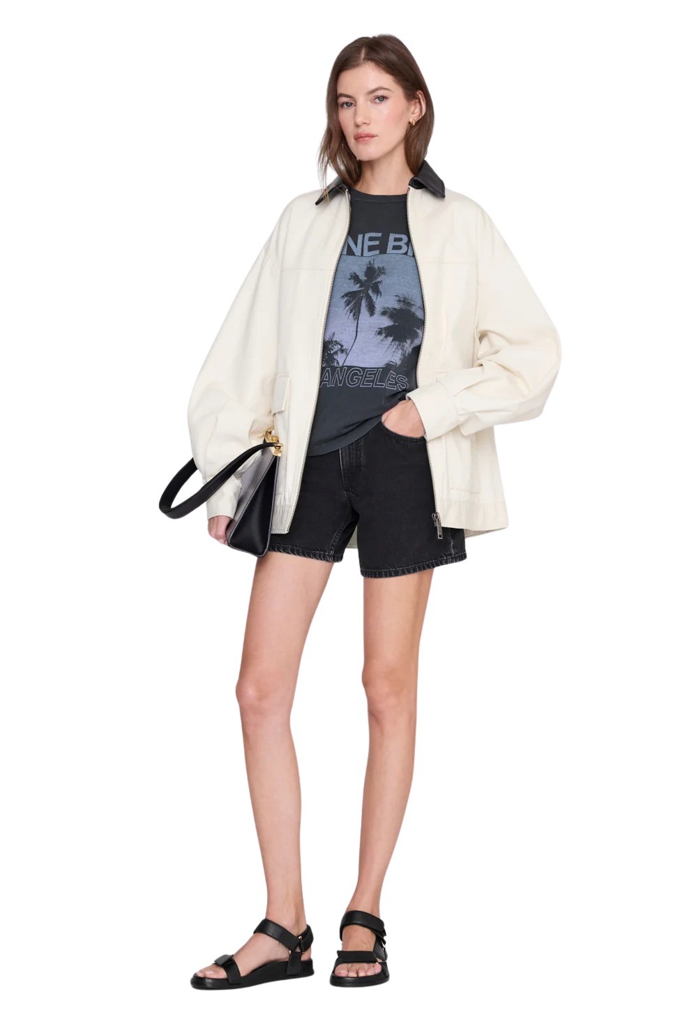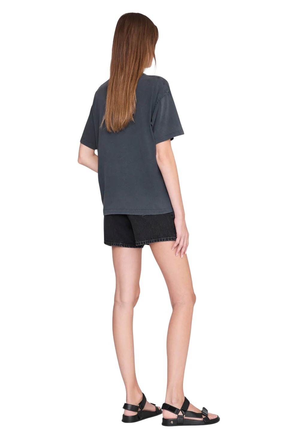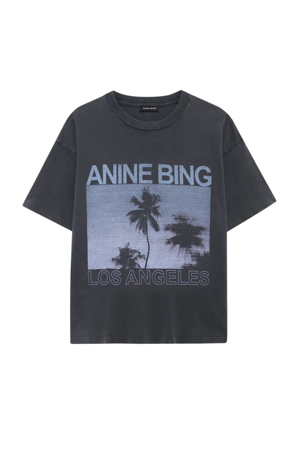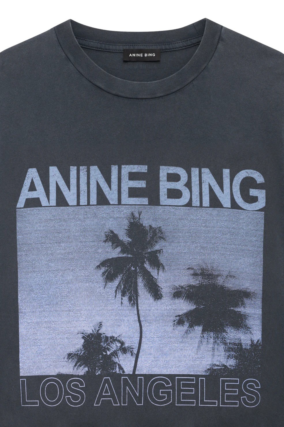 Cade Tee Palms fra Anine Bing. Laget i lett bomullsjersey med en myk, vasket grå finish. T-skjorten har en løs, boxy passform som gir et avslappet uttrykk. Et grafisk palmetrykk med Anine Bing-logo og «Los Angeles» på fronten gir et uanstrengt, vestkyst-inspirert preg.
