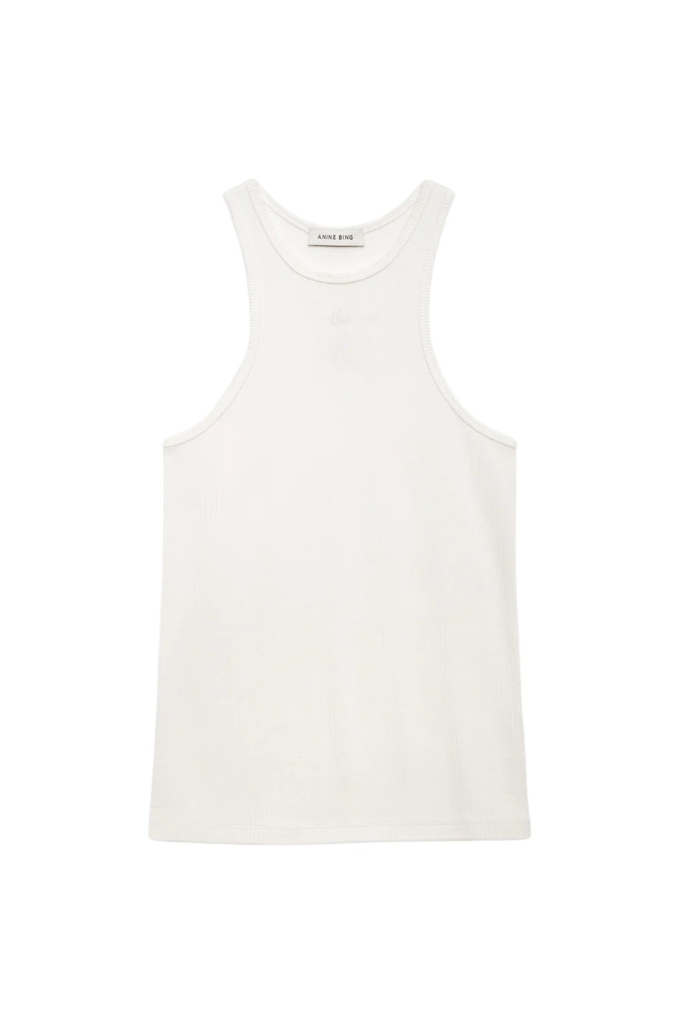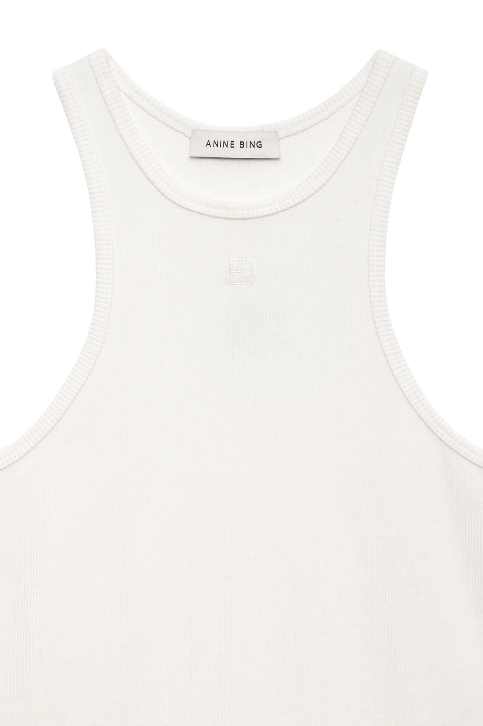 Cole Tank fra Anine Bing. En minimalistisk singlet med ribbestruktur som gir et rent og sofistikert uttrykk. Laget i en myk, elastisk strikk som former seg lett etter kroppen og har klassisk rund hals. En ton-i-ton brodert monogramlogo på brystet gir en diskret signaturdetalj.