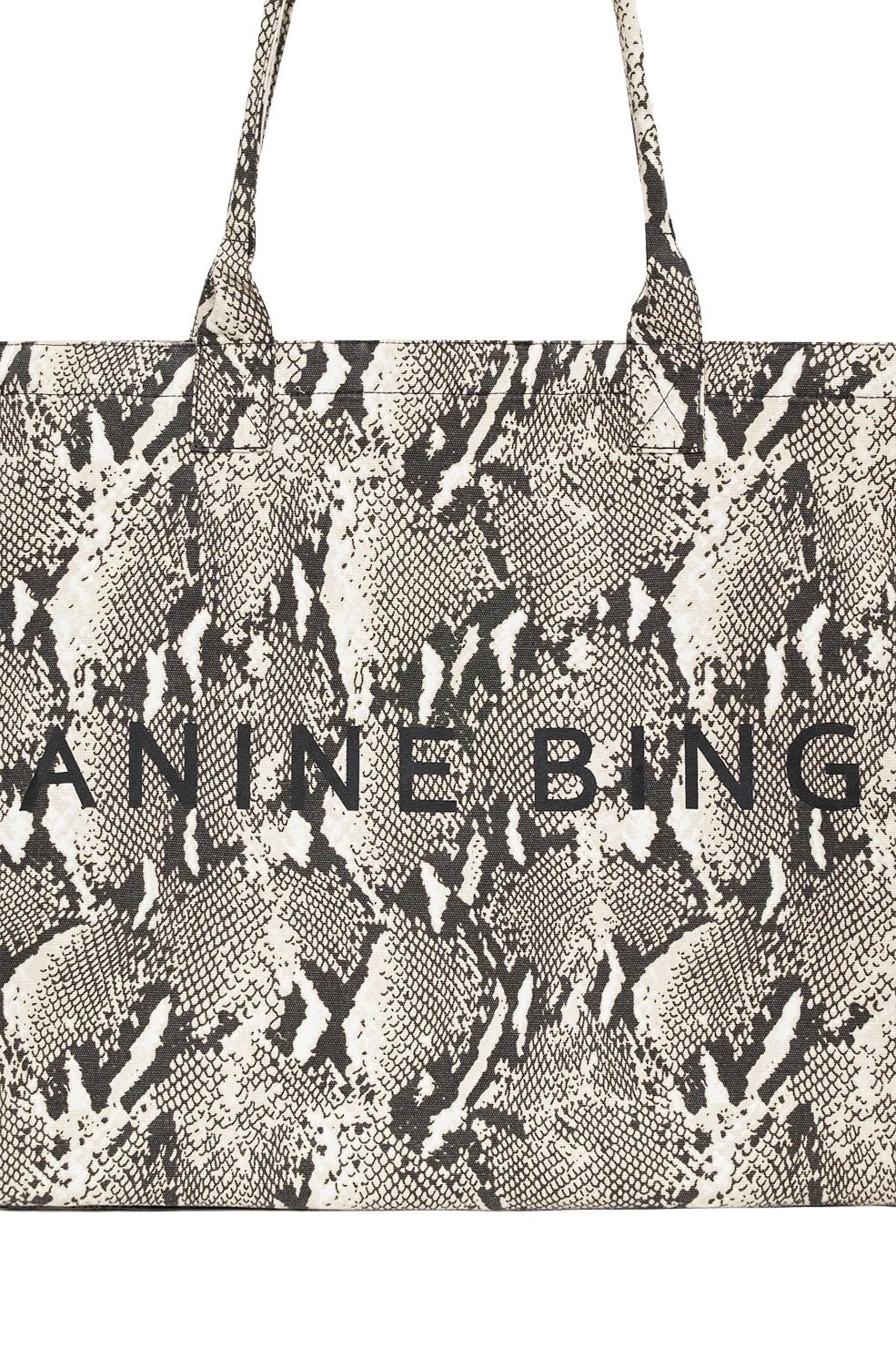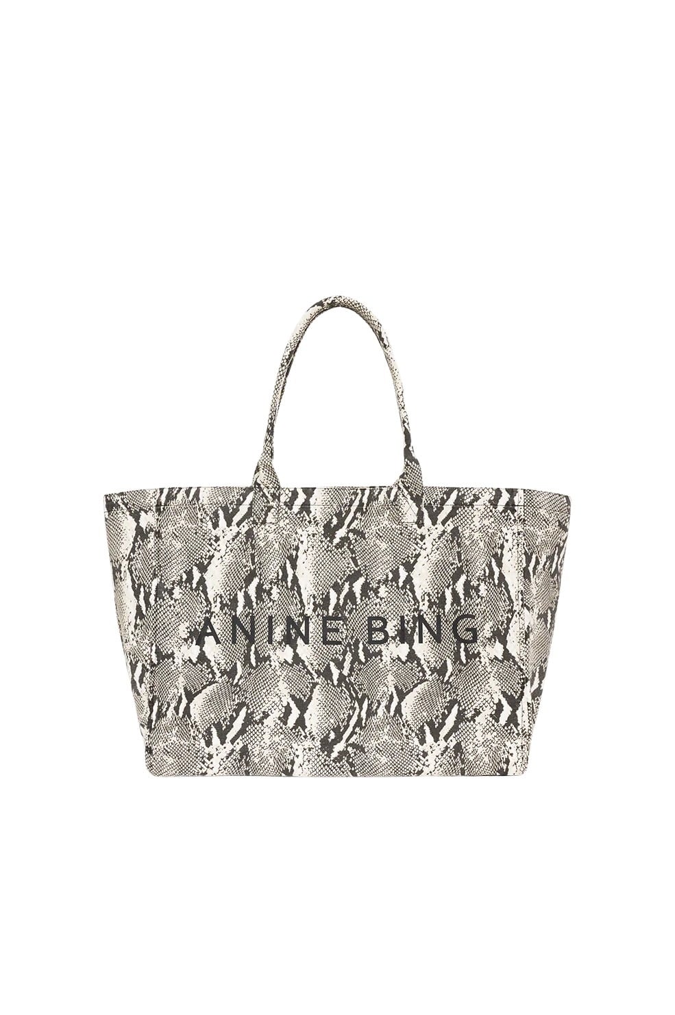 Leo Canvas Tote fra Anine Bing. En romslig totebag med et markant pytoninspirert print og sort ANINE BING-logo i front. Laget i slitesterk canvas og har god plass til alt du trenger i hverdagen. Perfekt som både jobbveske, weekendbag eller et statement-tilbehør.