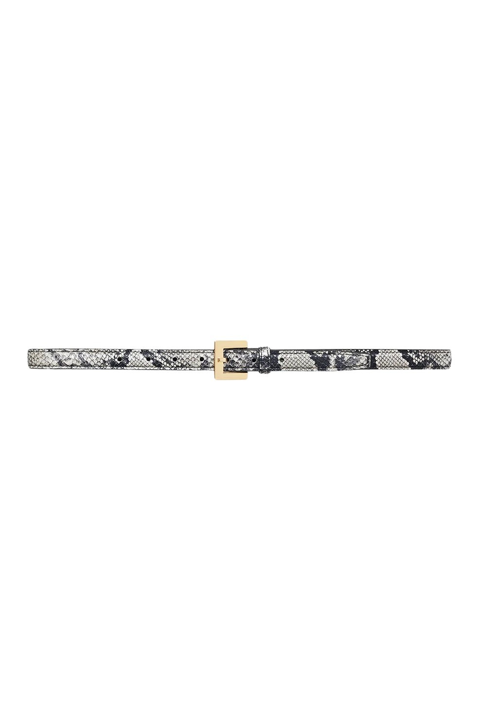 Nicola Belt fra Anine Bing. Et smalt belte laget av 100% kuskinn med et markant slangepreget mønster i sort og hvitt. Det har en elegant, gullfarget spenne som gir et sofistikert uttrykk. Perfekt for å løfte både jeans, dressbukser og kjoler med en edgy detalj.