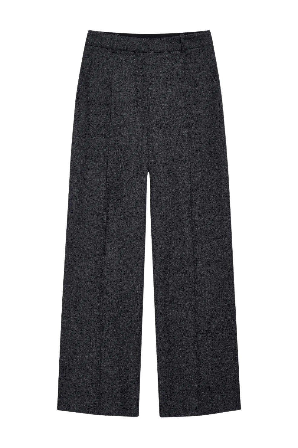Dressbukse til dame fra Anine Bing. En tradisjonell skreddersydd silhuett laget av et mellomvekt, teksturert ullstoff i dyp brunt. Middels høy midje med vide ben og lang innersøm.