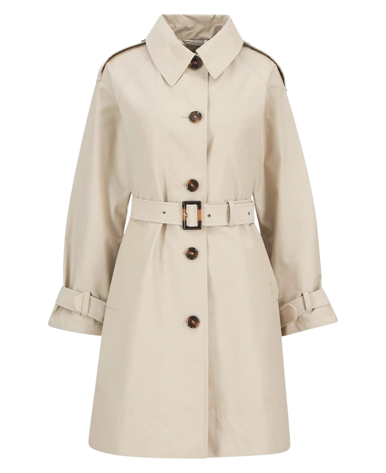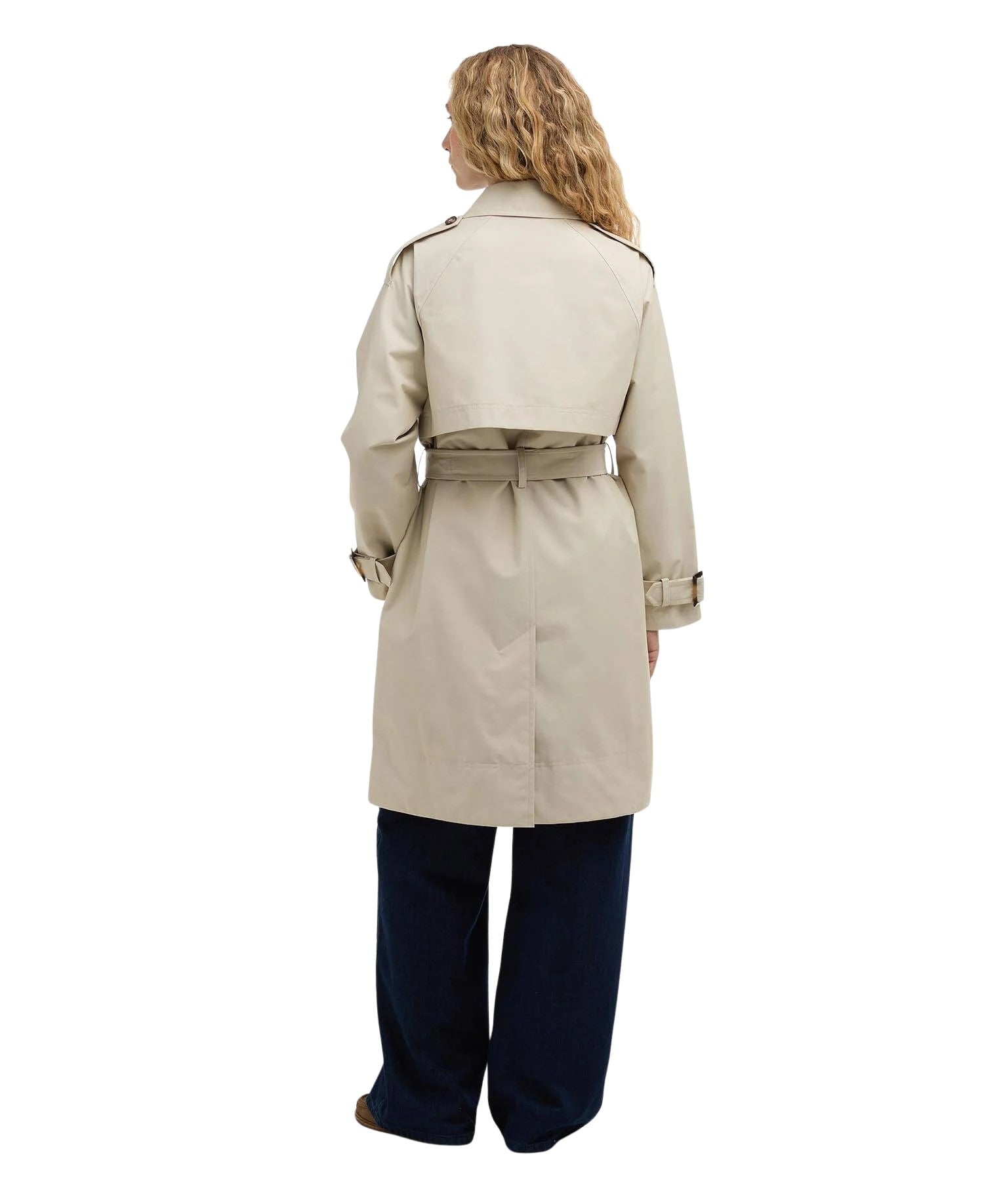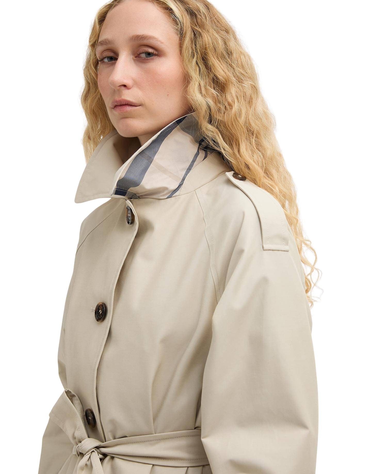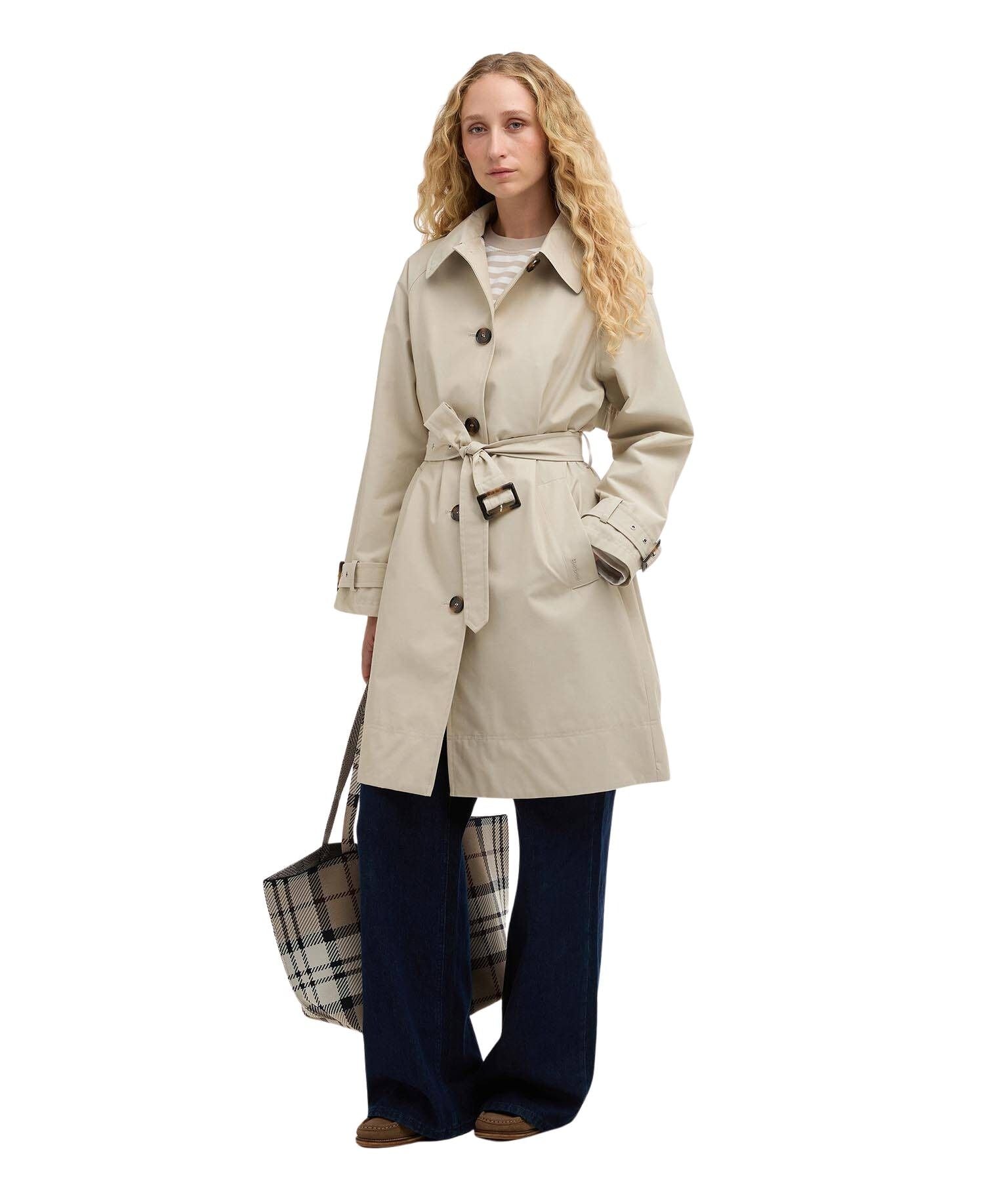 Trenchcoat til dame fra Barbour i vannavstøtende, matt kvalitet. Jakken har klassiske detaljer som belte i livet, raglanermer og brede skulderklaffer, kombinert med en feminin silhuett og funksjonell beskyttelse mot lett regn.