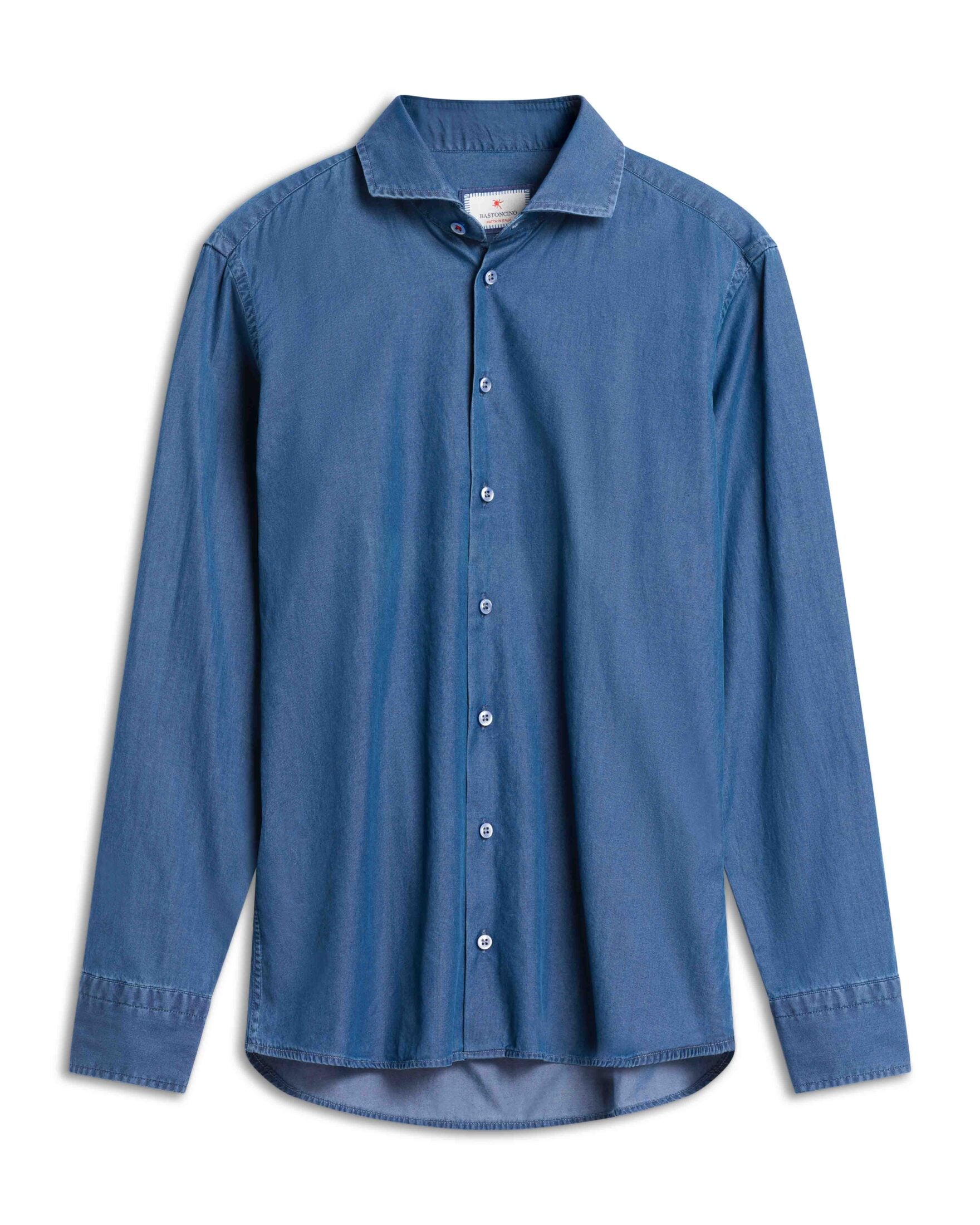Skjorte til herre fra Bastoncino. Laget i en tynn, vasket denimkvalitet av myk bomull som gir en avslappet og raffinert stil. Den klassiske blåtonen gjør den enkel å kombinere med både chinos og dressbukser. Perfekt balanse mellom komfort og italiensk eleganse.