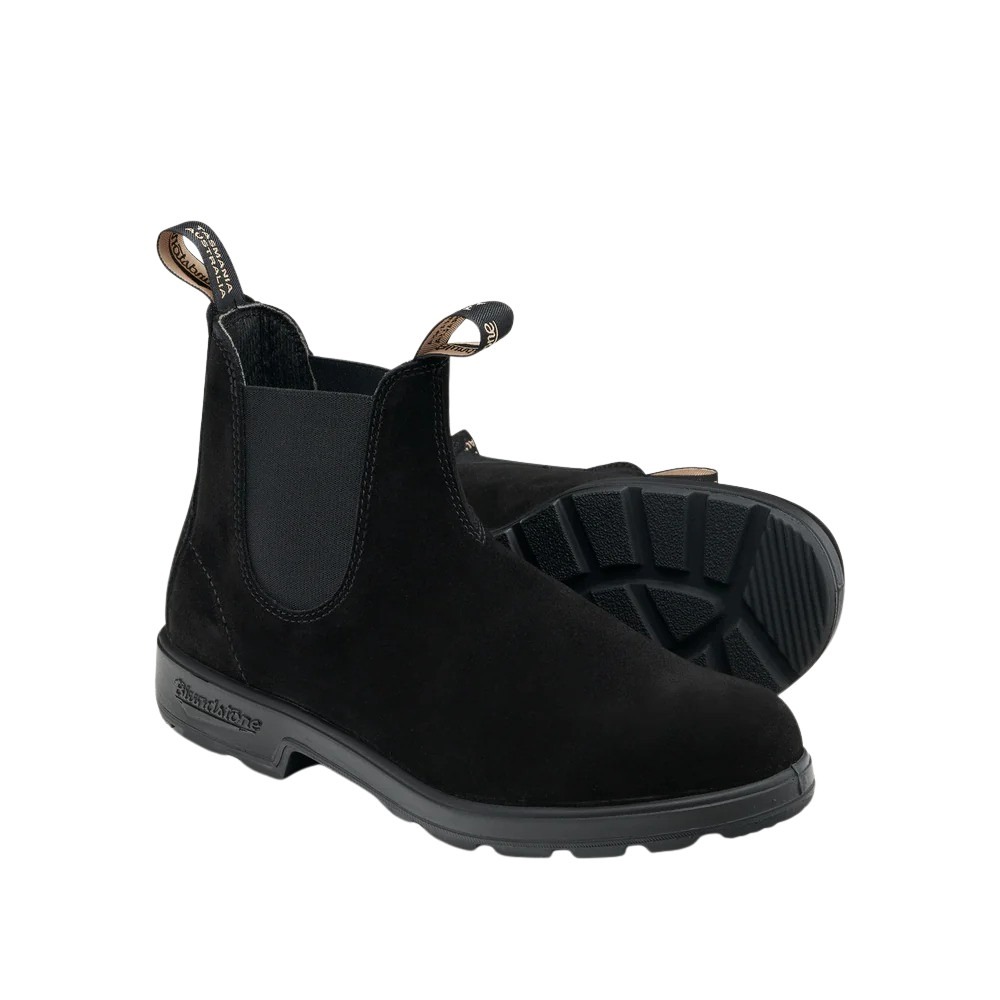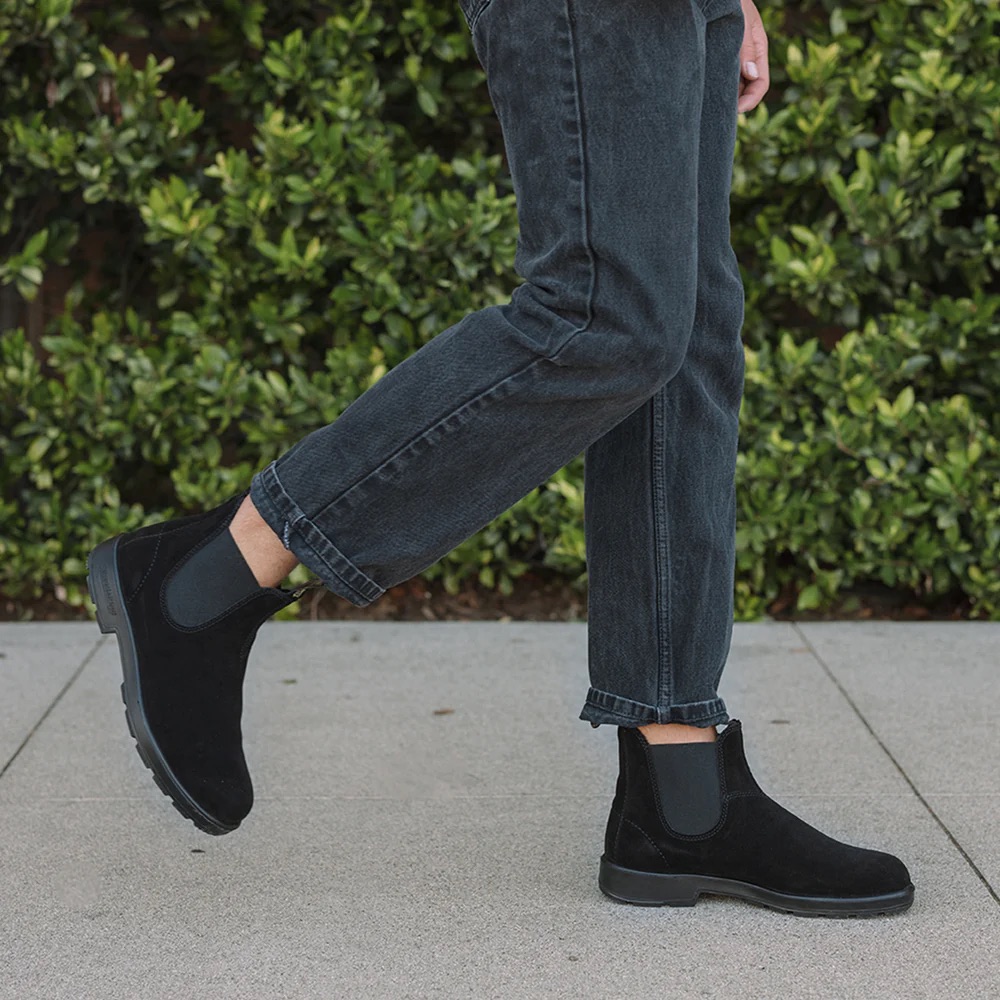 Chelsea boots til herre fra Blundstone i vannavstøtende, sort semsket skinn. Klassisk silhuett med elastiske paneler, komfortfôr og robust såle med XRD®-demping i hælen. Perfekt til hverdagsbruk, uansett vær.