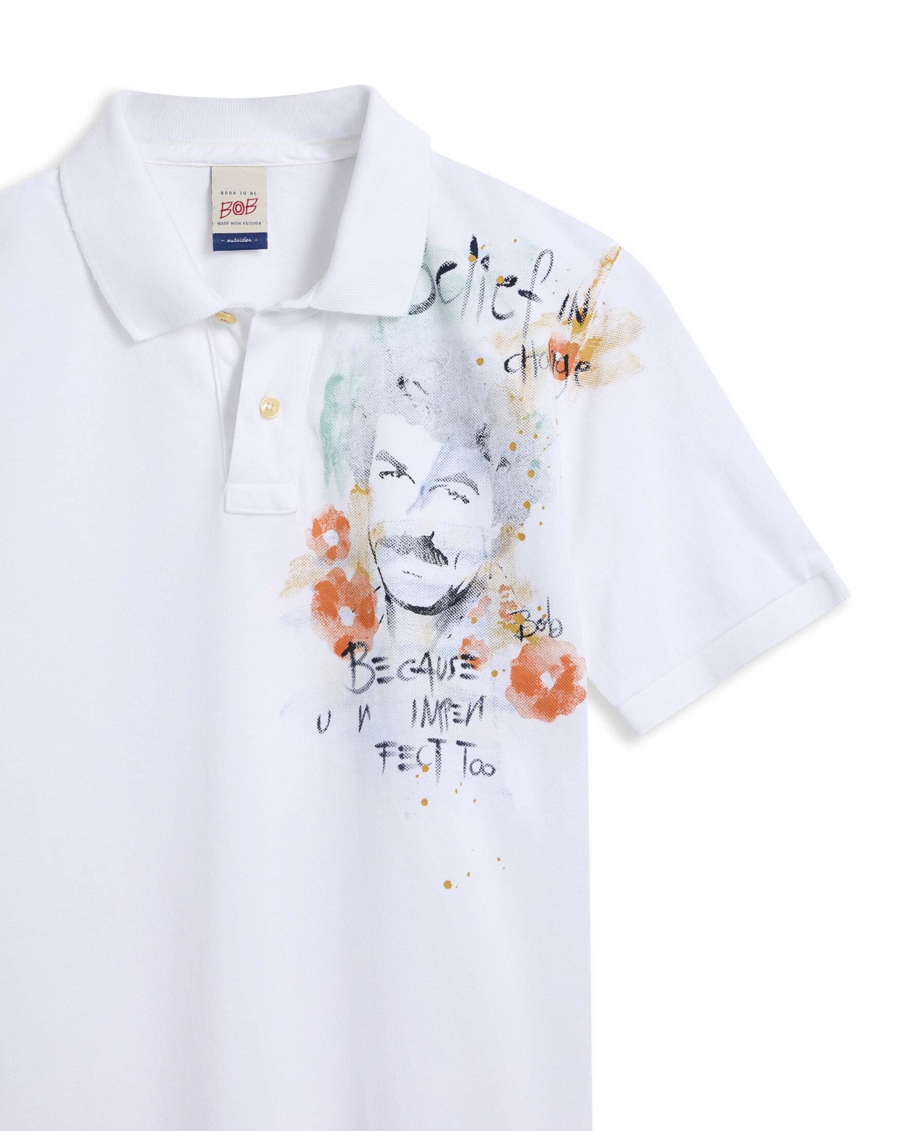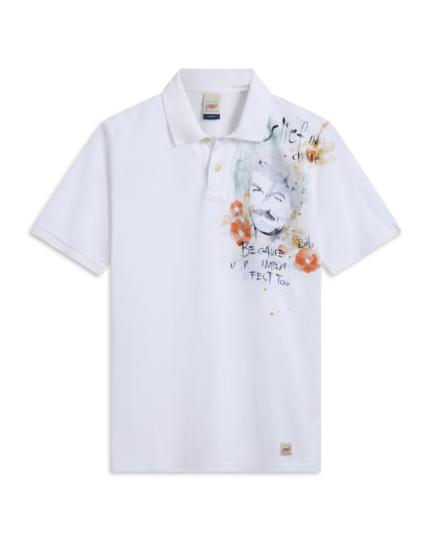 Piqué til herre fra BOB. Laget av myk bomull som gir en komfortabel og pustende følelse. Den rene hvite basen fremheves av et kunstnerisk, malt motiv med fargerike detaljer som gir plagget et uttrykksfullt og unikt preg. Perfekt for deg som ønsker å tilføre antrekket et kreativt og personlig særpreg.