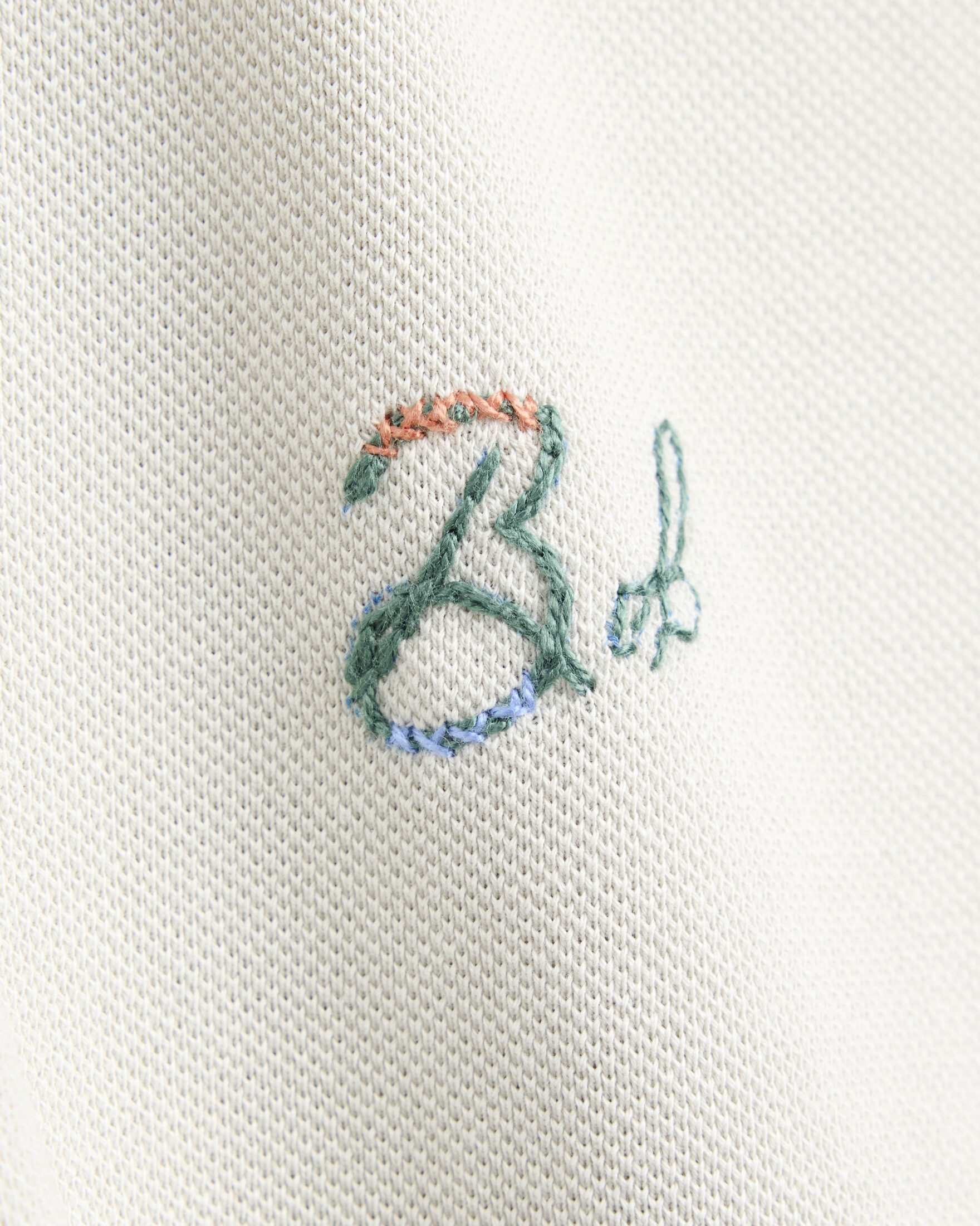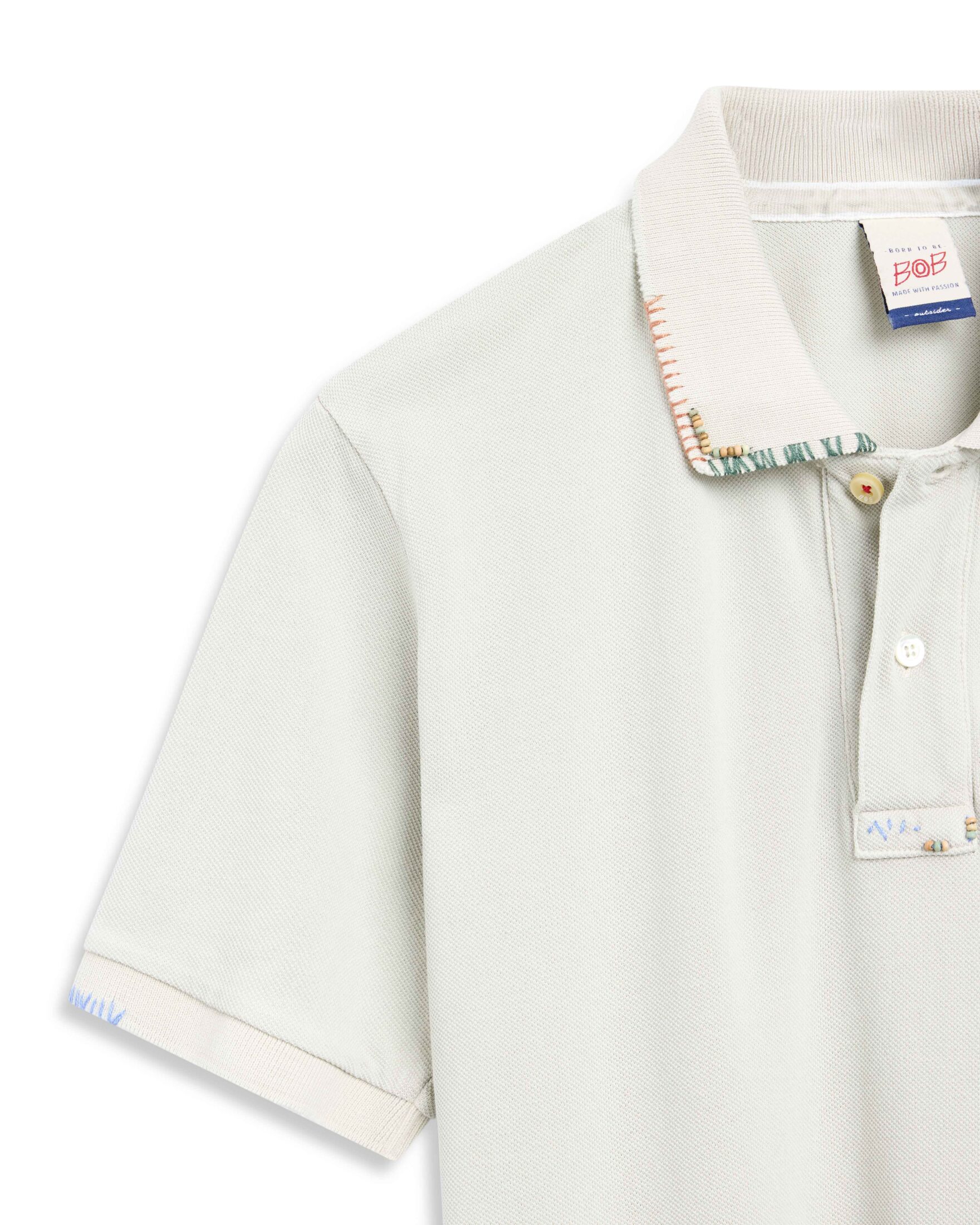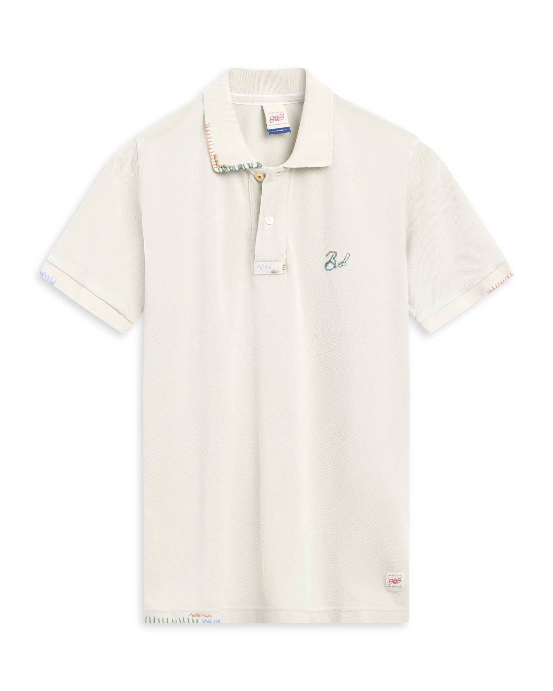 Piqué til herre fra BOB. Laget av myk bomull som gir en komfortabel og lett følelse. Den kremhvite fargen kombineres med subtile kontrastdetaljer og fine sømmer som gir et gjennomført og raffinert uttrykk. Et allsidig plagg som passer perfekt til både jeans og lyse sommerbukser.