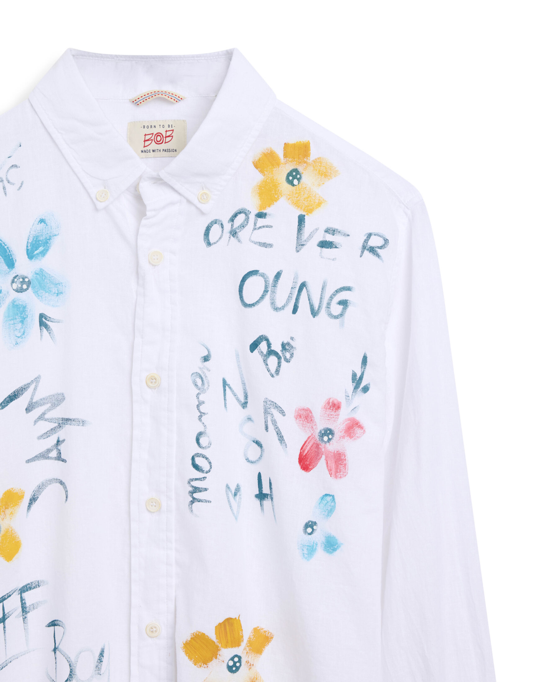 Skjorte til herre fra BOB. Laget av bomull som gir en lett og behagelig følelse. Hvit base dekorert med håndmalte grafiske elementer og fargerike blomster som gir et lekent og kunstnerisk uttrykk. Et statement-plagg som tilfører antrekket personlighet og kreativitet.