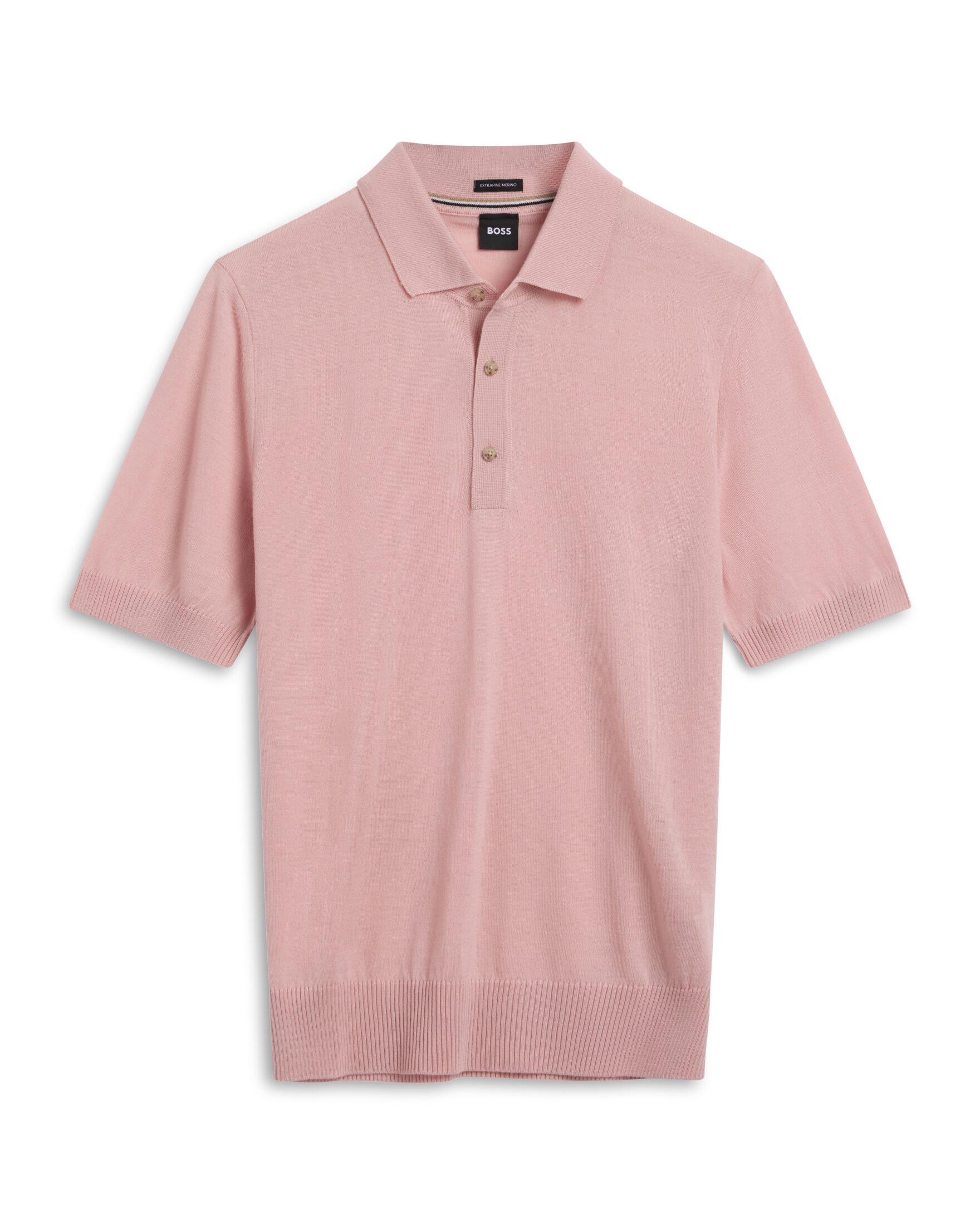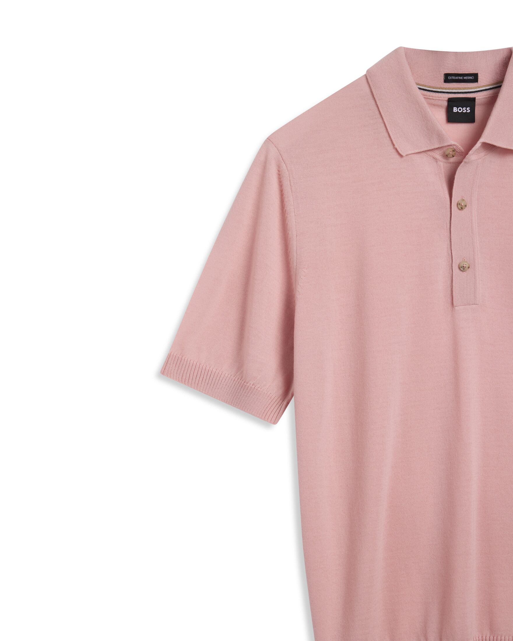 Piqué til herre fra BOSS. Strikket i ren merinoull som gir naturlig pusteevne og komfort. Modellen har polokrage og korte ermer som gir et avslappet, men velkledd uttrykk til sommergarderoben.