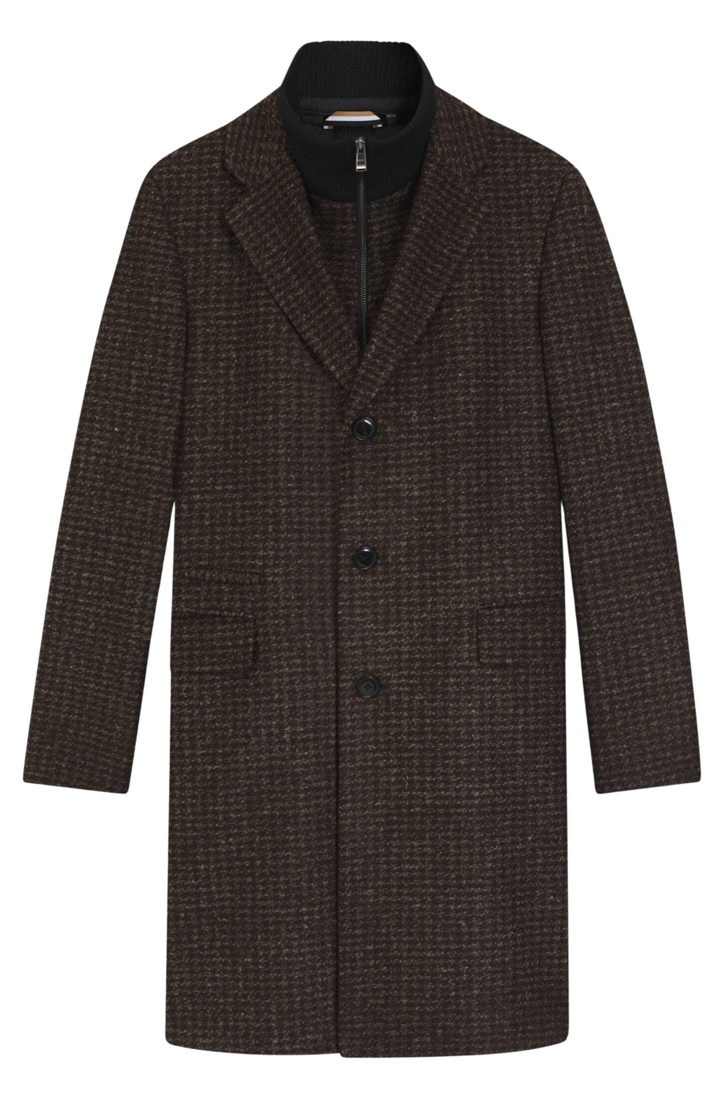 Frakk til herre fra Boss. Stilren frakk i en moderne smal passform og et avtagbart innerstykke for ekstra varme og fleksibilitet. Laget i en eksklusiv ullblanding med et subtilt mønster som gir et raffinert uttrykk. Perfekt for den moderne mannen som ønsker både funksjon og eleganse i vintergarderoben.