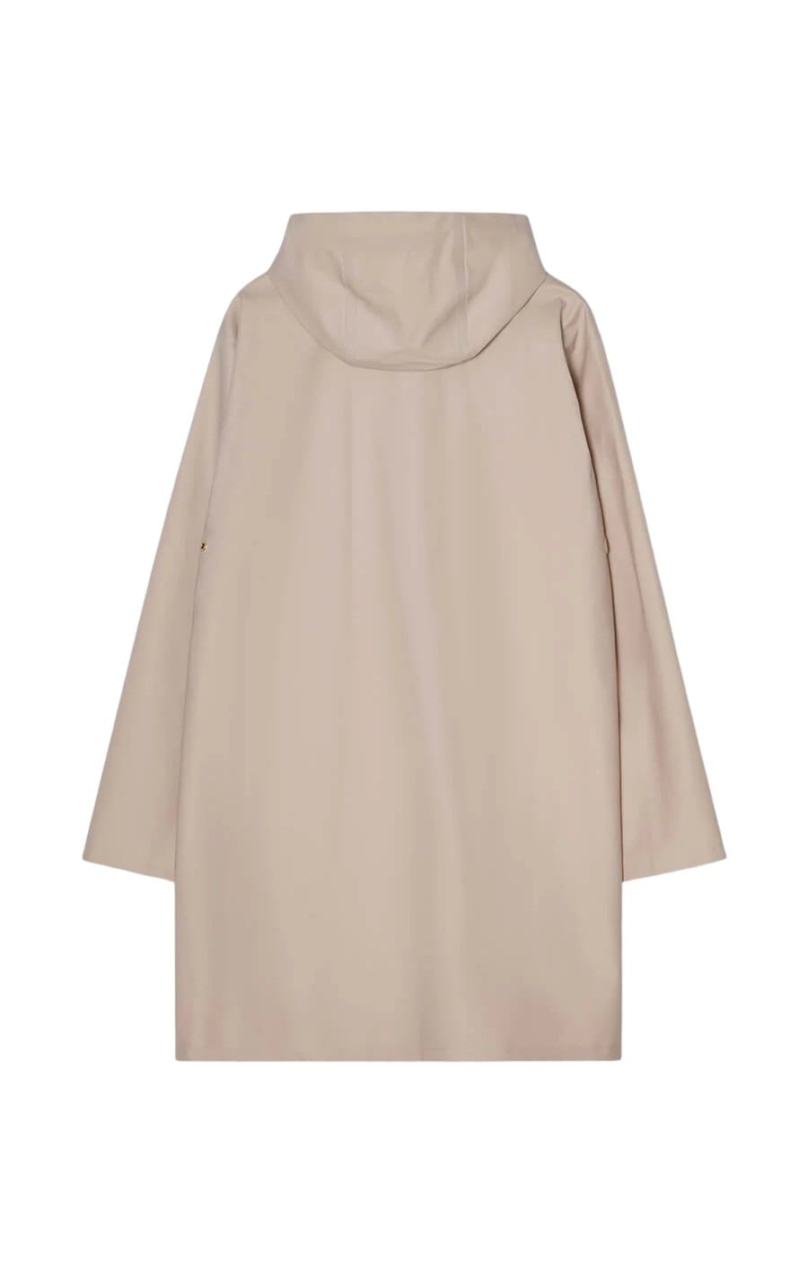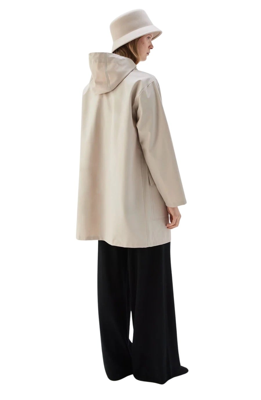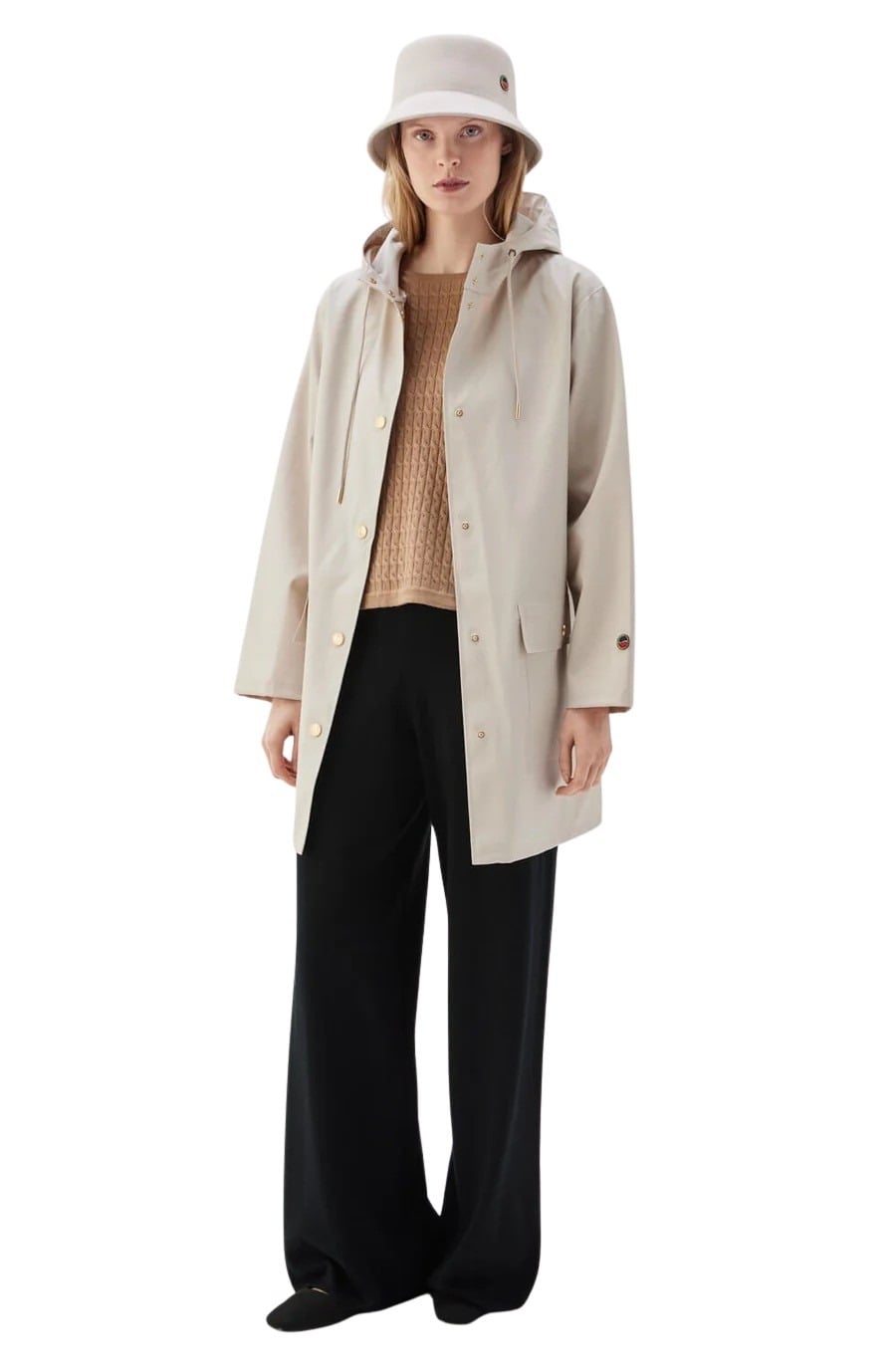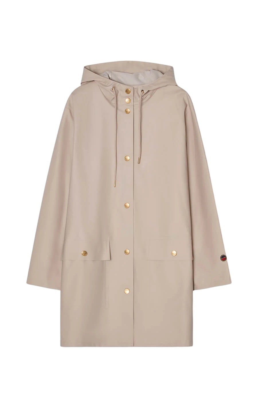Regnjakke til dame fra Busnel. Den ultimate regnjakken som holder deg tørr på regnværsdager. Jakken har sveisede sømmer, en rett silhuett, hette med snøring, maljer i armhulene og store påsydde klafflommer. Detaljert med gullfargede trykknapper foran og på lommene.