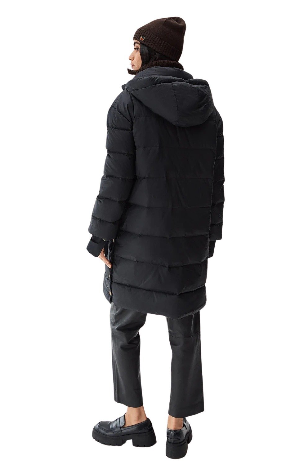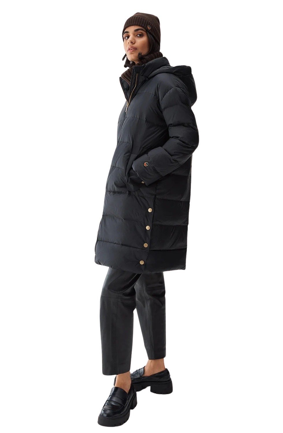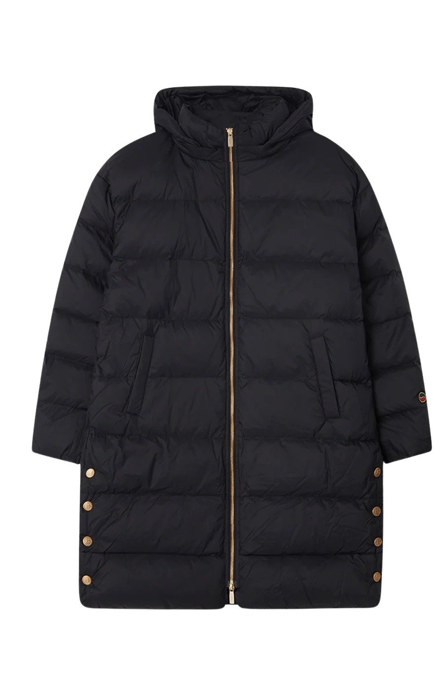 Nydelig dunjakke til dame fra Busnel, laget i vanntett materiale. Jakken har et klassisk uttrykk med gulltonede detaljer og en oversized passform, som er perfekt over tykke gensere på kalde dager.