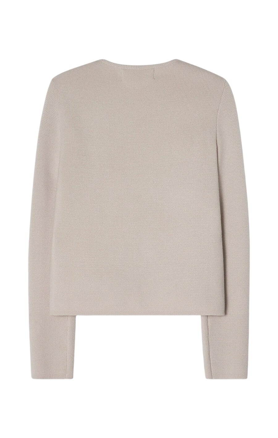 Jakke til dame fra Busnel. En hybrid mellom en lett dunjakke og en ullcardigan. Jakken har dunfylt front av nylon, mens bakside og ermer er i en strikket merinoullkvalitet. Knappelukking foran og passepoilerte lommer med gullfargede trykknapper. En stilfull jakke som holder deg varm og stilfull i høst og vinter.