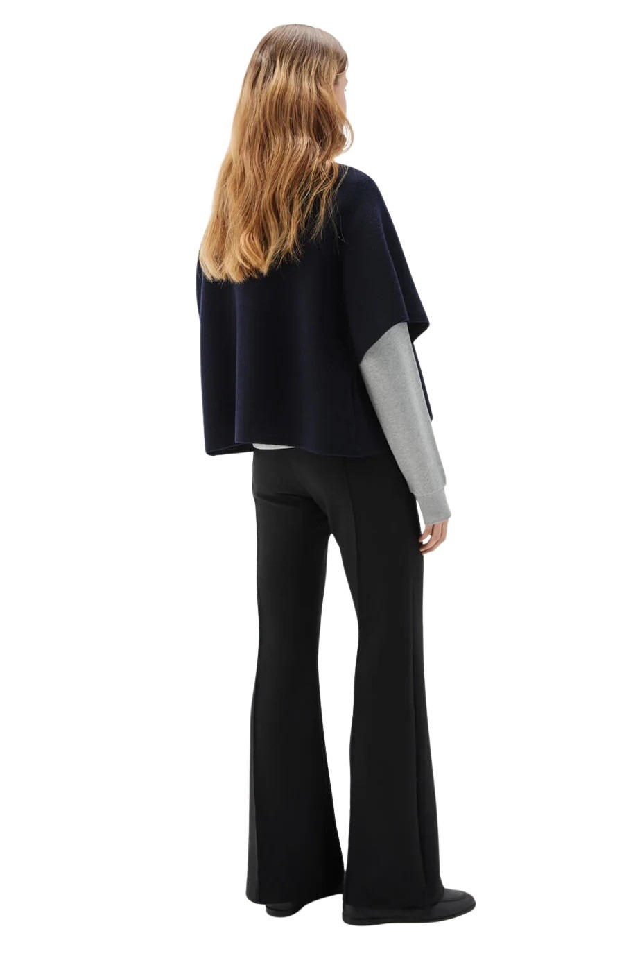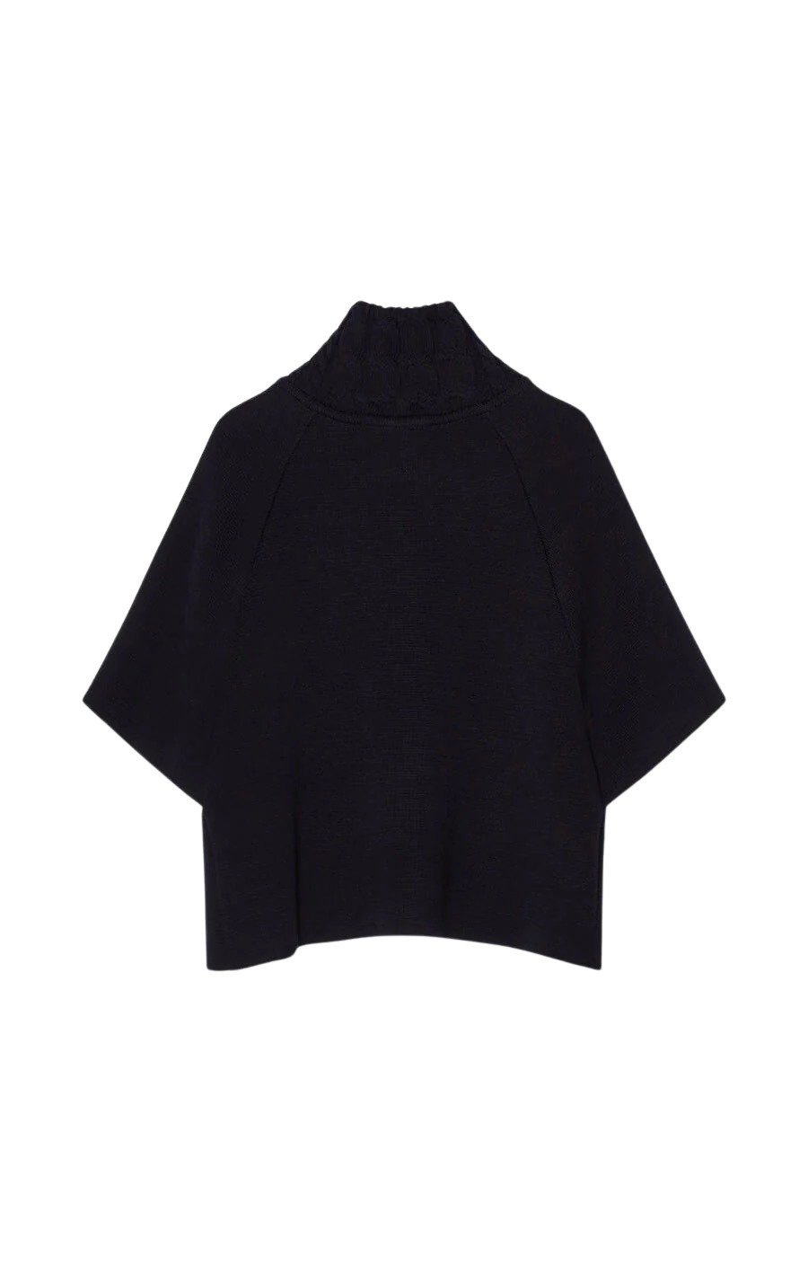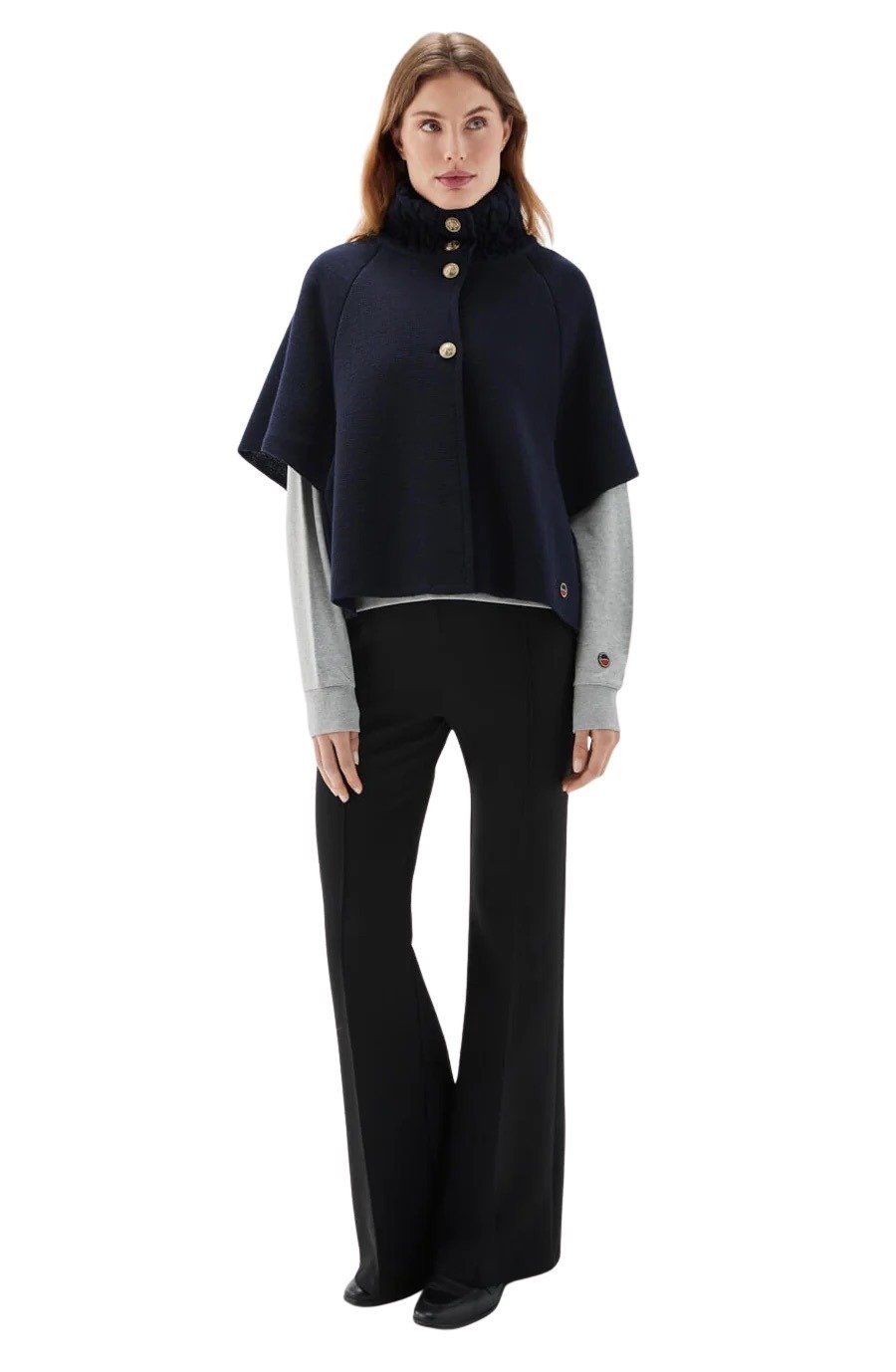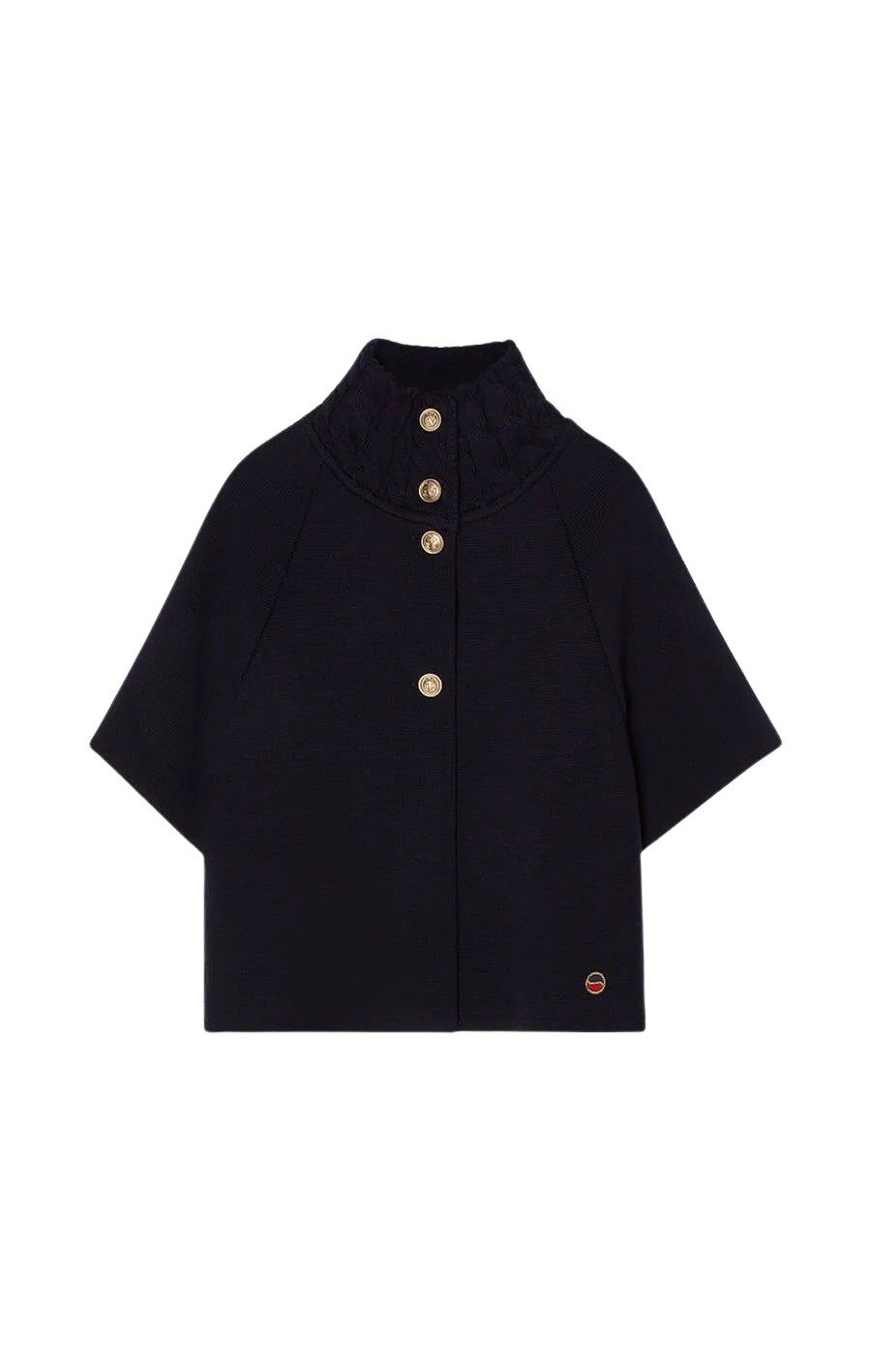Kappe til dame fra Busnel. En hybrid mellom en strikket kappe og en cardigan. Laget i Frankrike i ull av høy kvalitet, med en firkantet form som sitter på hoftene. Høy krage med kabelstrikket struktur, myke raglanermer og lukking foran, avsluttet med gylne knapper.