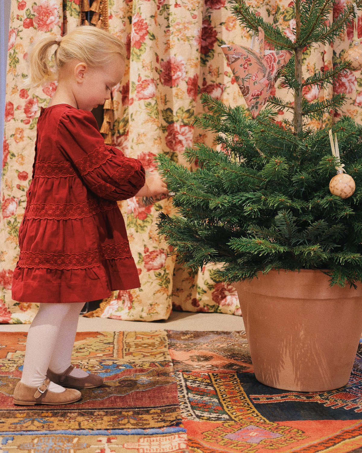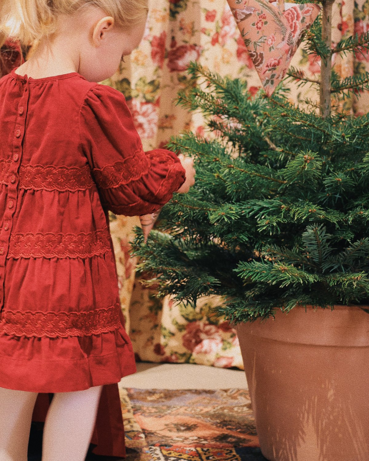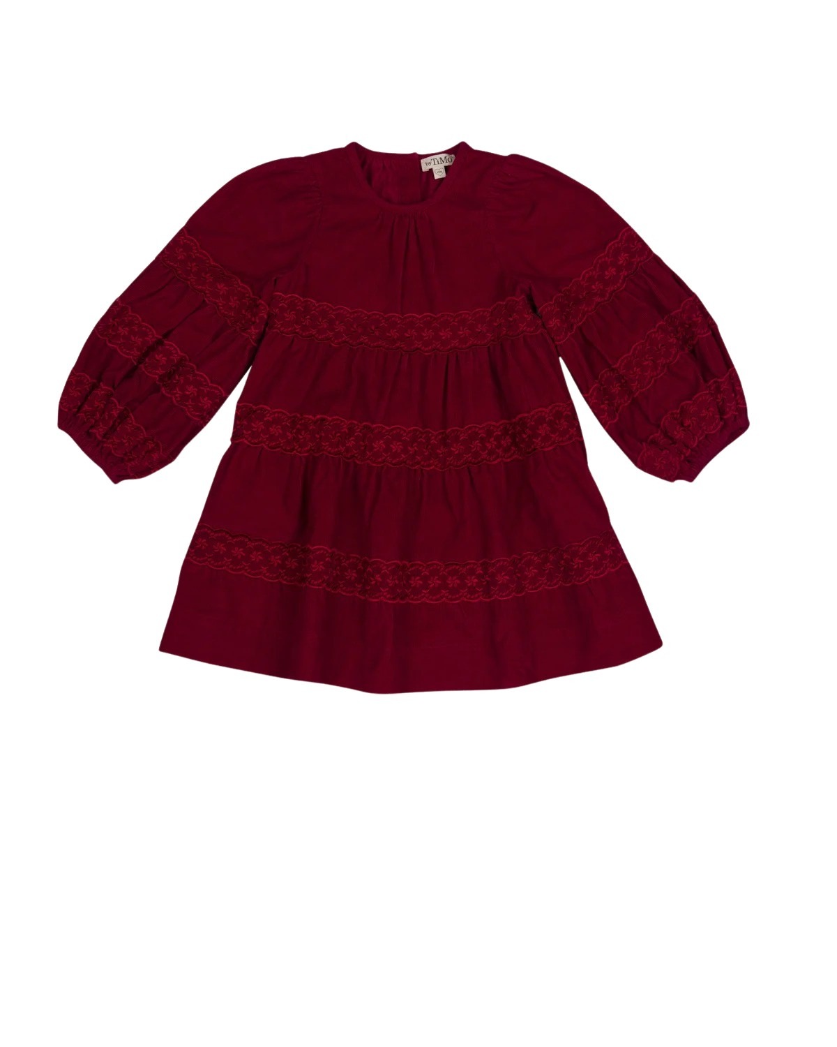 Kjole til jenter fra byTiMo i rød kord. Kjolen er laget i 100% GOTS-sertifisert bomull med myk finish.