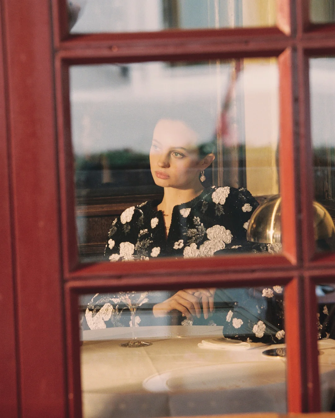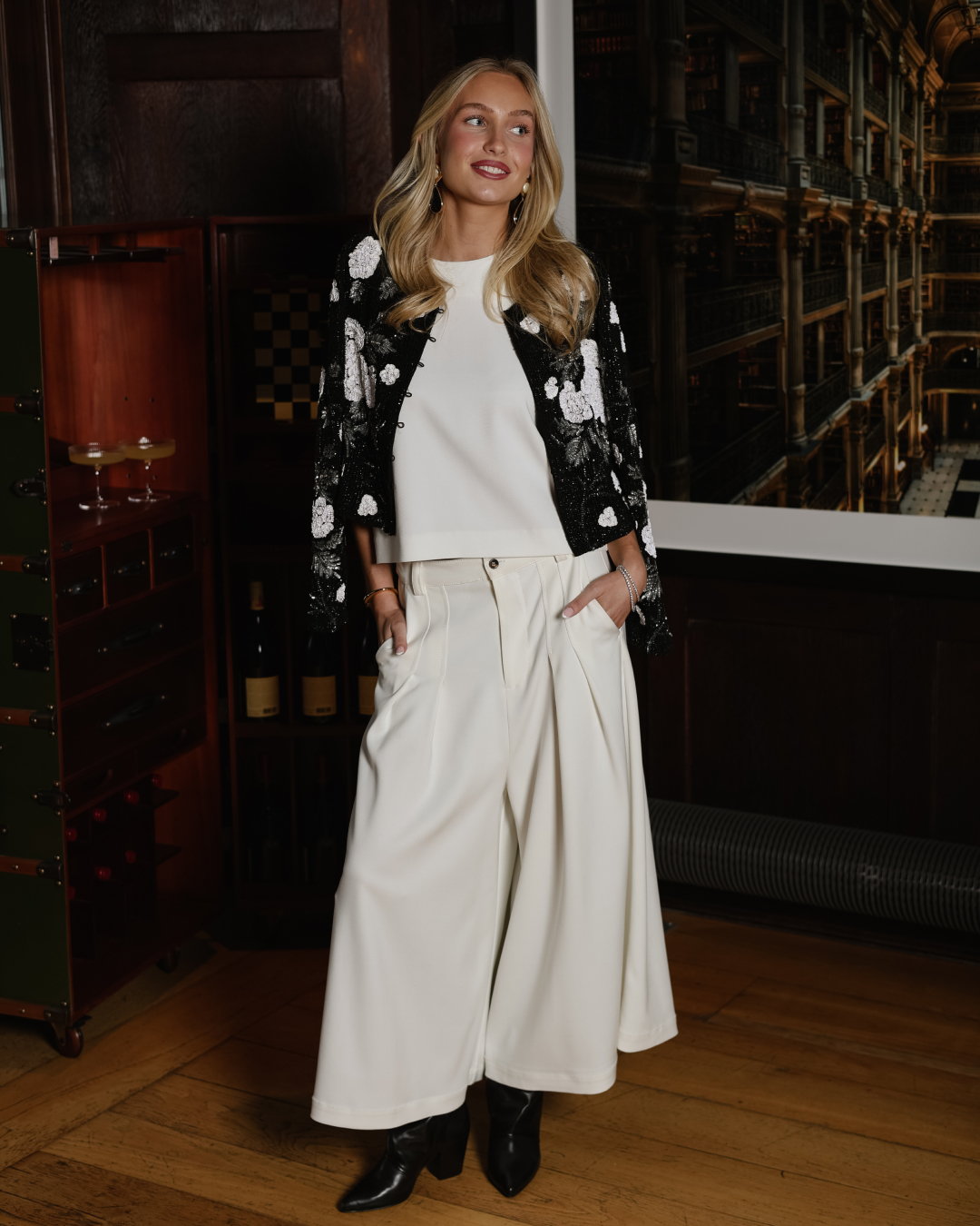 Jakke til dame fra ByTiMo. Elegant jakke laget av håndsydd paljettbroderi. Jakken har en kort, rett passform, rund hals, lange ermer og skjult hektelukking.