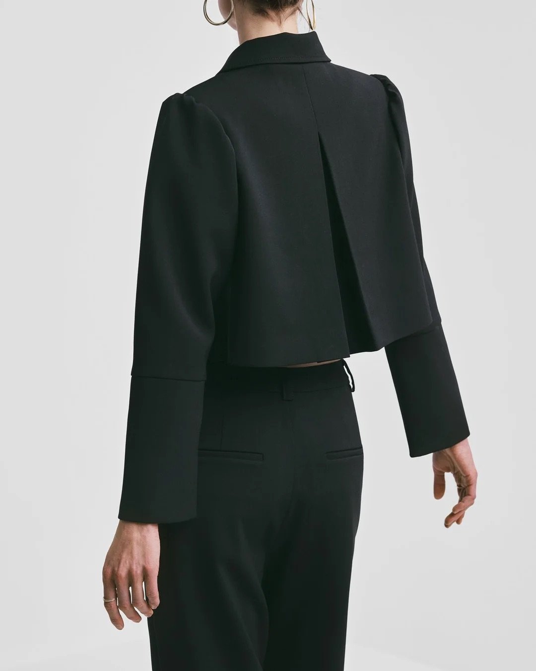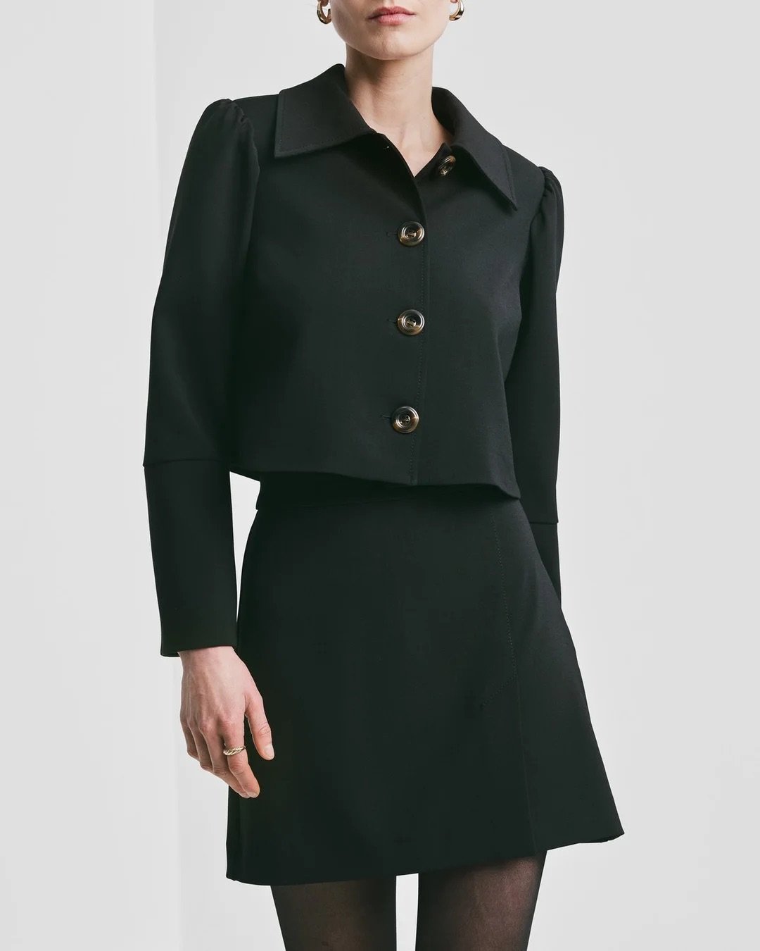 Jakke til dame fra byTiMo i en strukturert og luksuriøs kvalitet. Designet i en rett, kort passform med puffede skuldre, krage og knappelukking foran. En feminin jakke som passer perfekt over kjoler til fest eller hverdags.