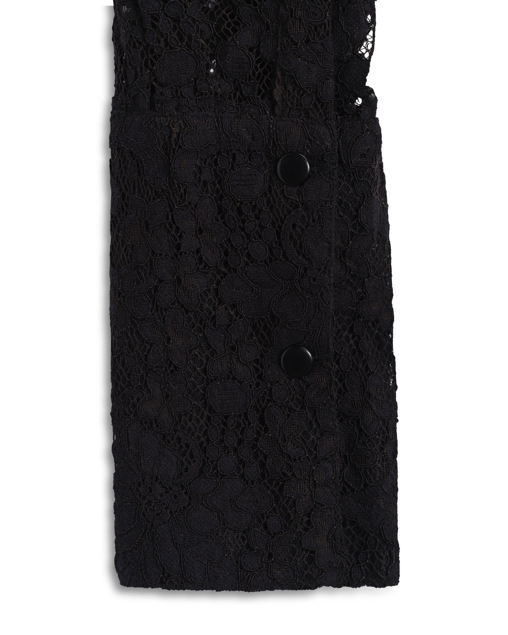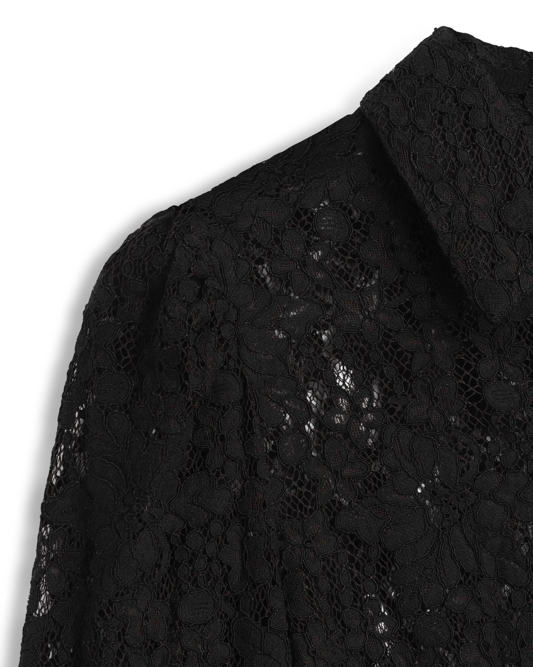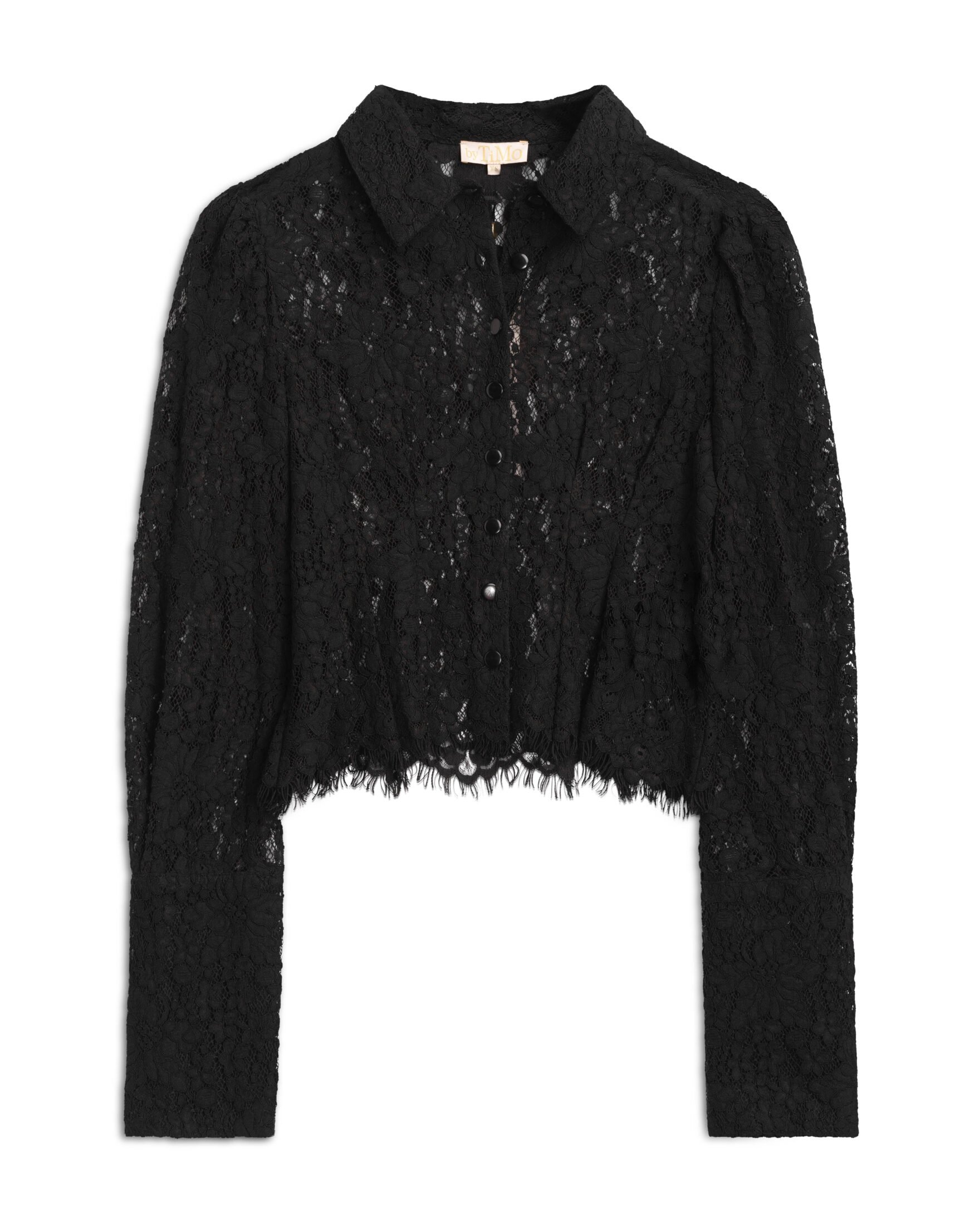 Skjorte til dame fra ByTiMo. Skåret i en delikat, gjennomsiktig og strukturert blondekvalitet. Tettsittende silhuett og litt cropped lengde. Den har lange ermer med puffede skuldre og brede mansjetter, krage og knapper foran.