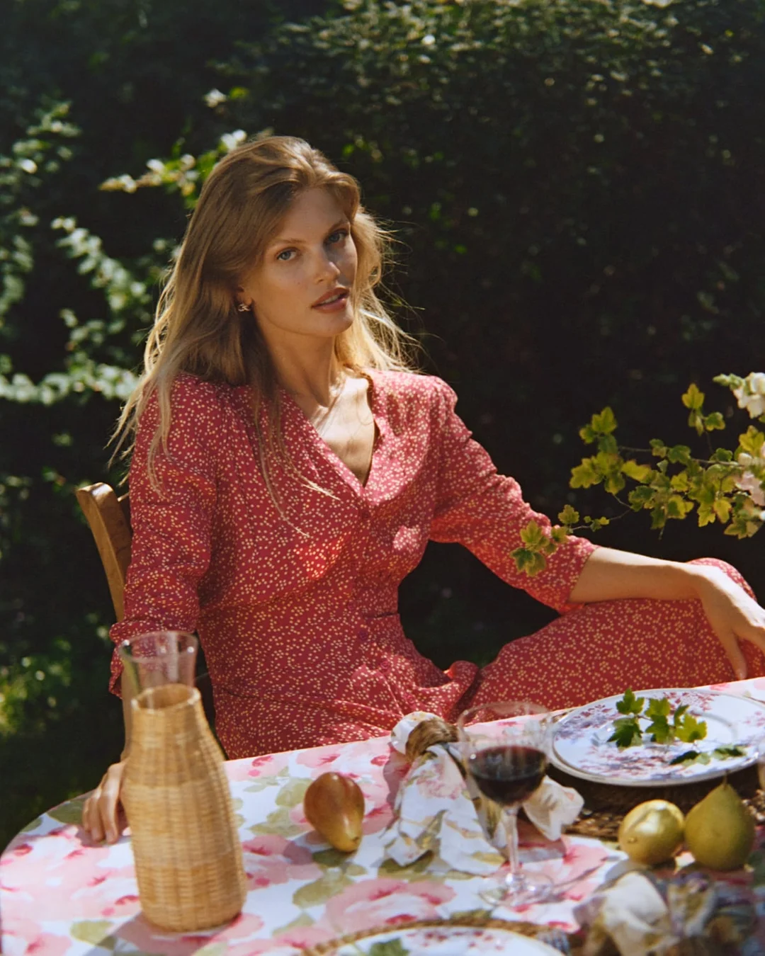 Spring Button-Down Dress fra ByTiMo. En feminin maxikjole i lett og flytende FSC-sertifisert viskose med et delikat prikket jacquardmønster. Den har en flatterende passform med markert midje og smocking bak, V-utringning og knapper hele veien i front. Trekvartlange ermer med rynkedetaljer og lett puffede skuldre gir kjolen et elegant og romantisk uttrykk.