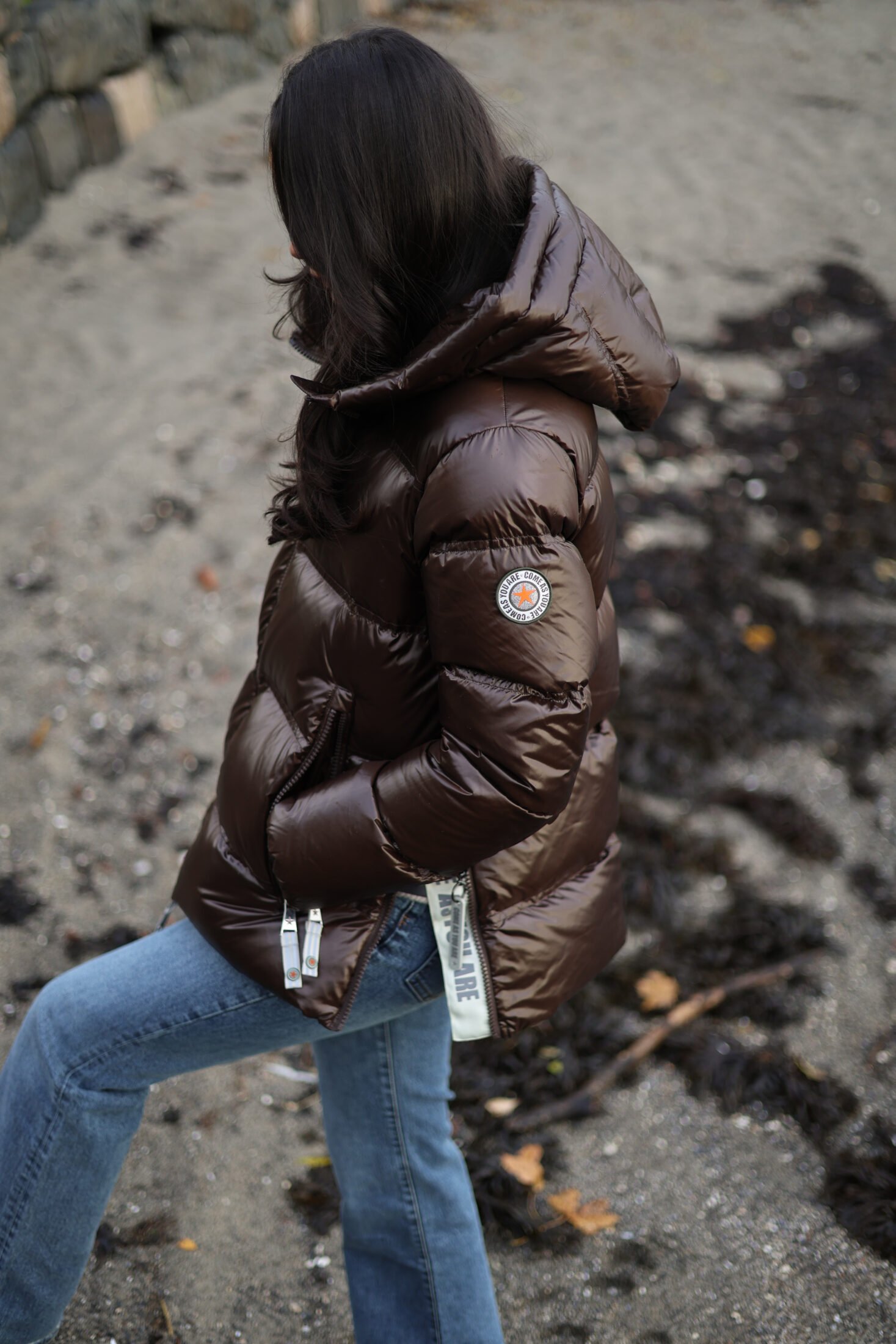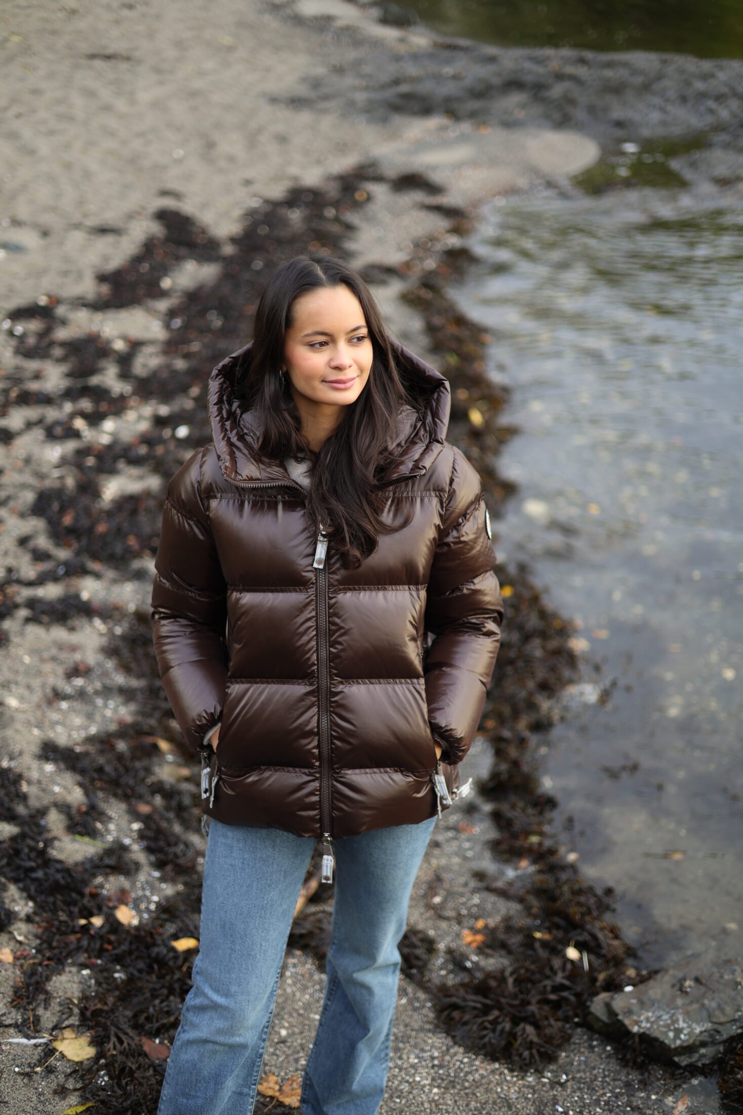 Erika fra C.A.Y.A. er en luksuriøs og varm dunjakke laget for kalde dager. Produsert i skinnende, slitesterk nylon og vattert med en fyldig blanding av dun og fjær som gir optimal isolasjon uten å føles tung. Jakken har en feminin og moderne passform, med stor hette, praktiske glidelåslommer og justerbar glidelås nederst på sidene. En perfekt kombinasjon av stil og komfort. Like fin i byen som på tur.