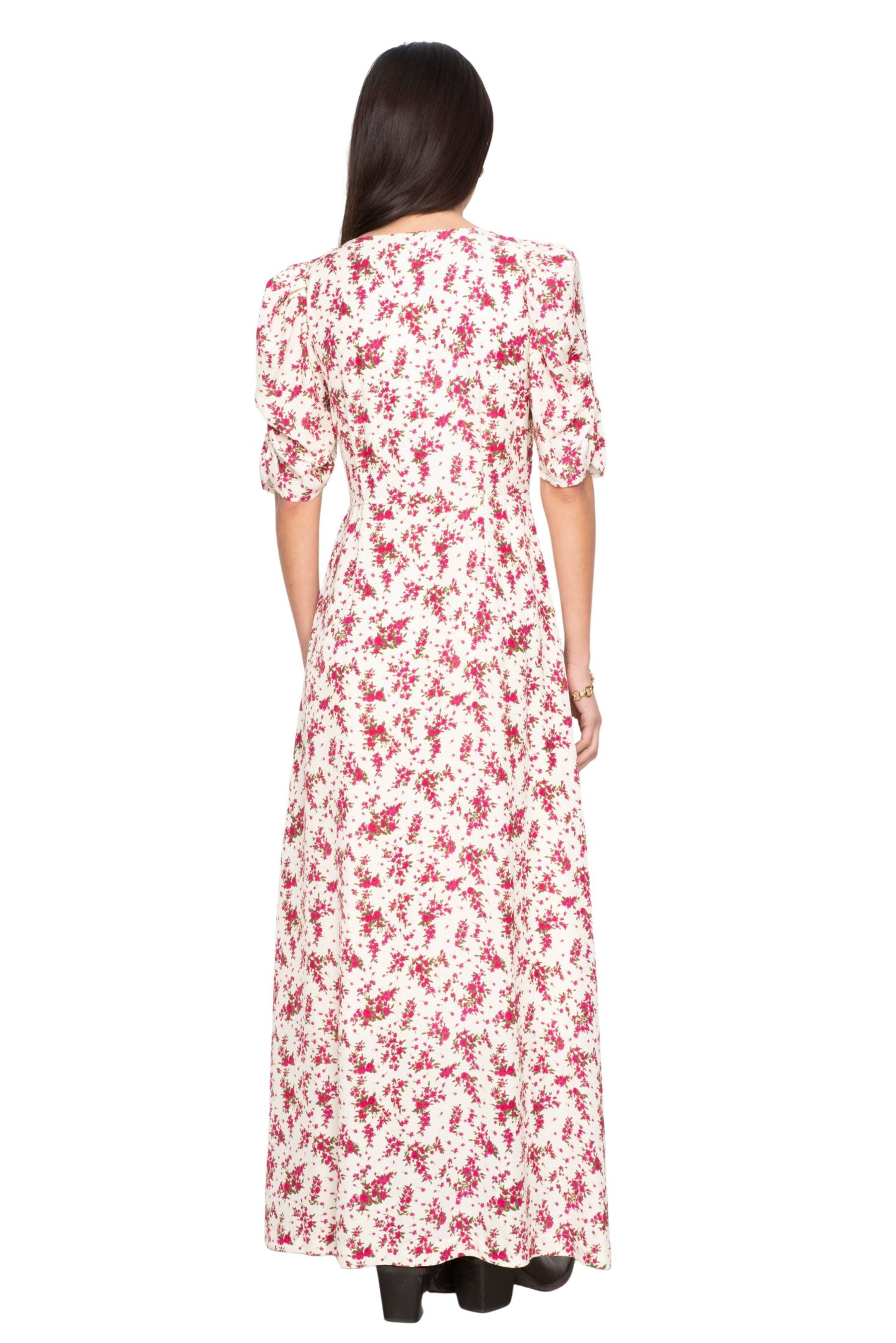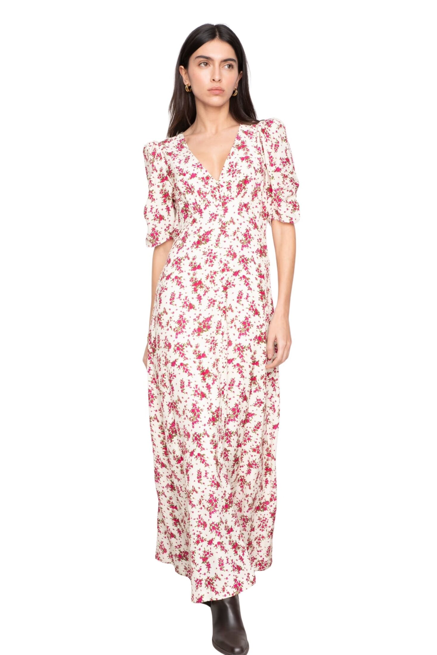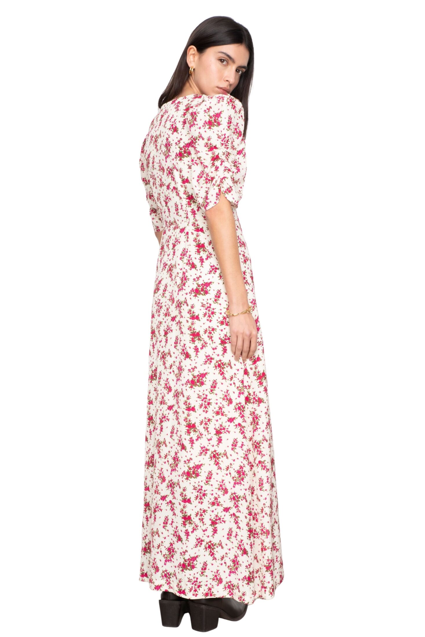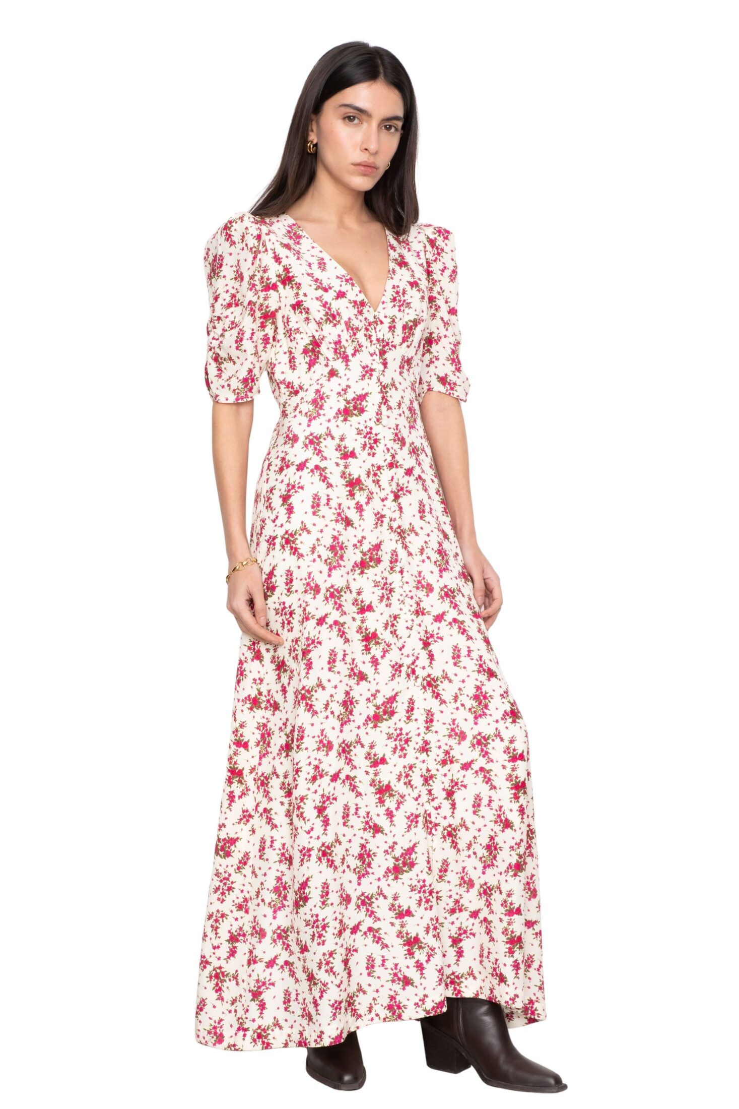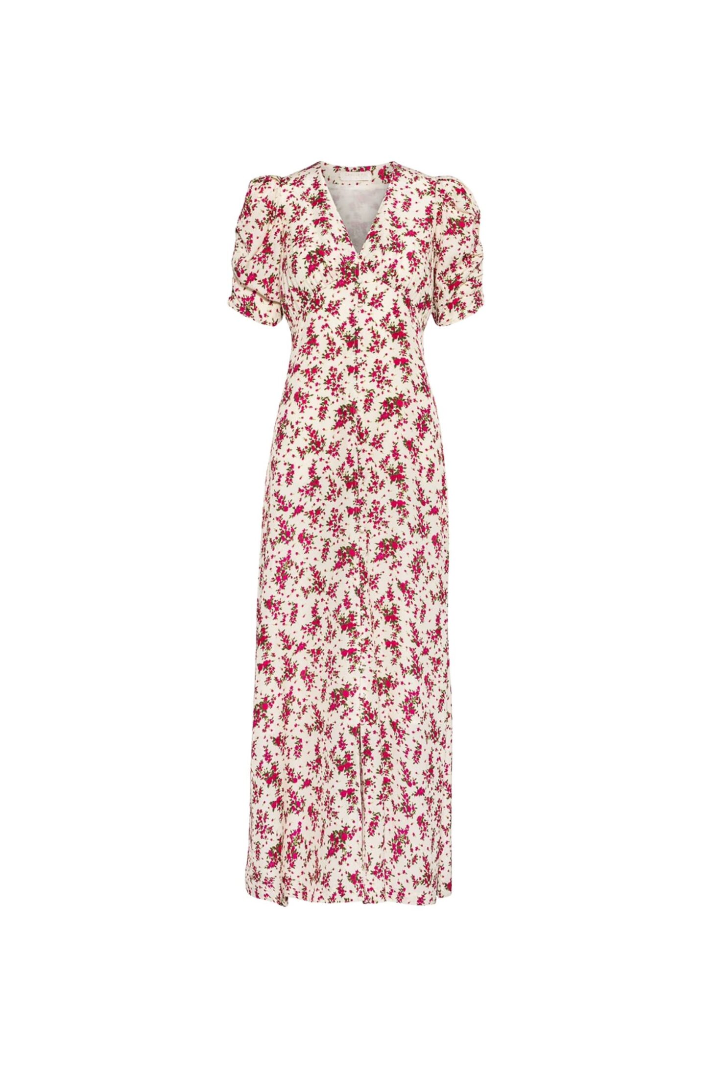 Aivy Dress fra Camilla Pihl. En tidløs maxikjole med flatterende V-utringning og myke korte ermer som gir et elegant, feminint uttrykk. Delikate knapper foran, hvor de nederste er funksjonelle, tilfører både bevegelse og fleksibilitet. En skjult glidelås i siden sørger for en sømløs passform. Perfekt til både hverdagsbruk og mer pyntede anledninger.
