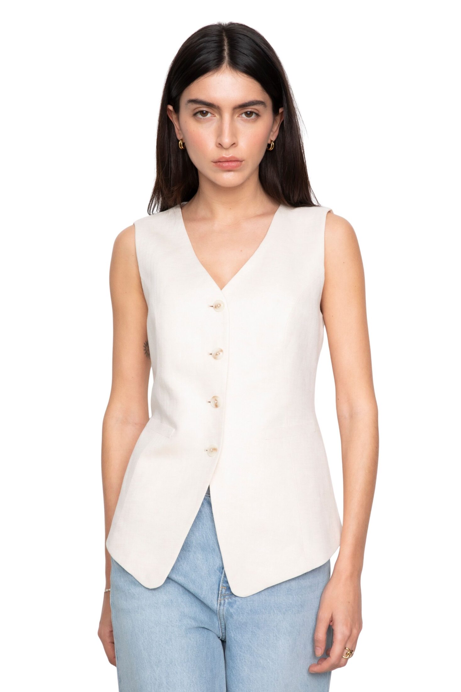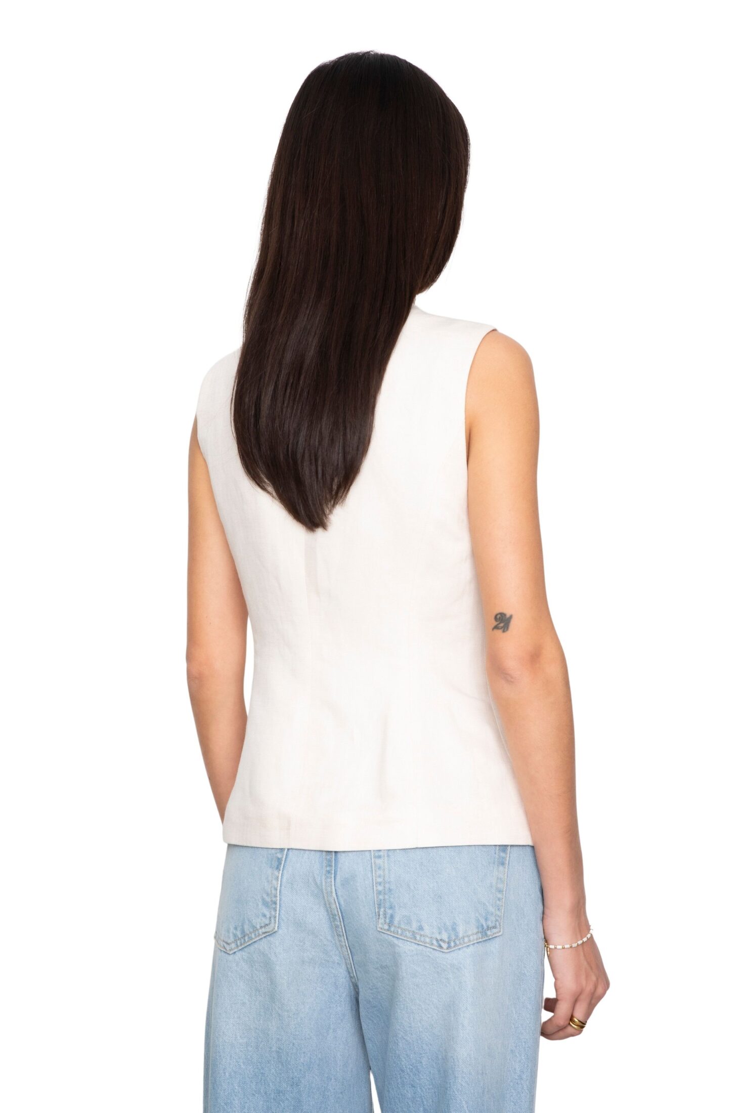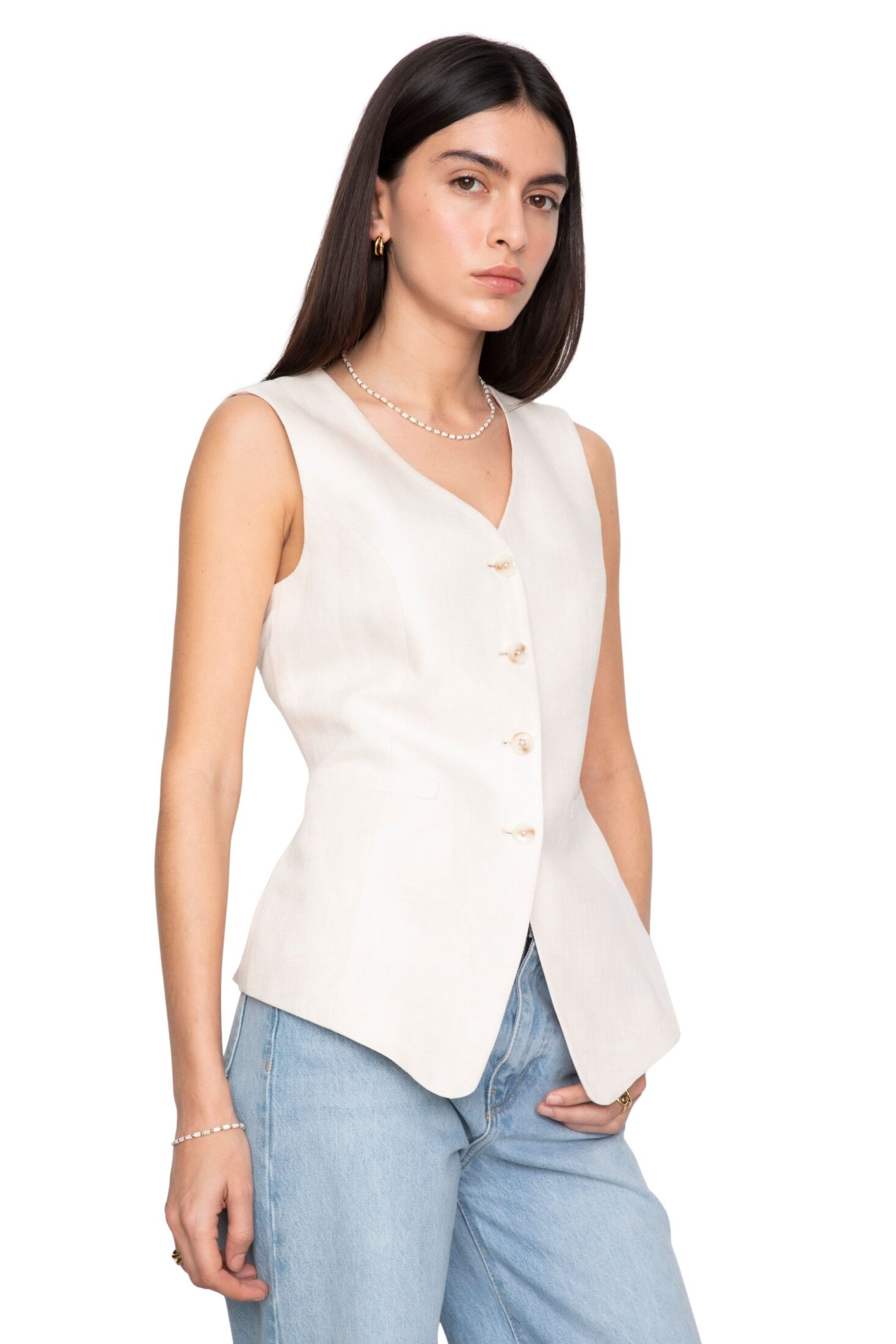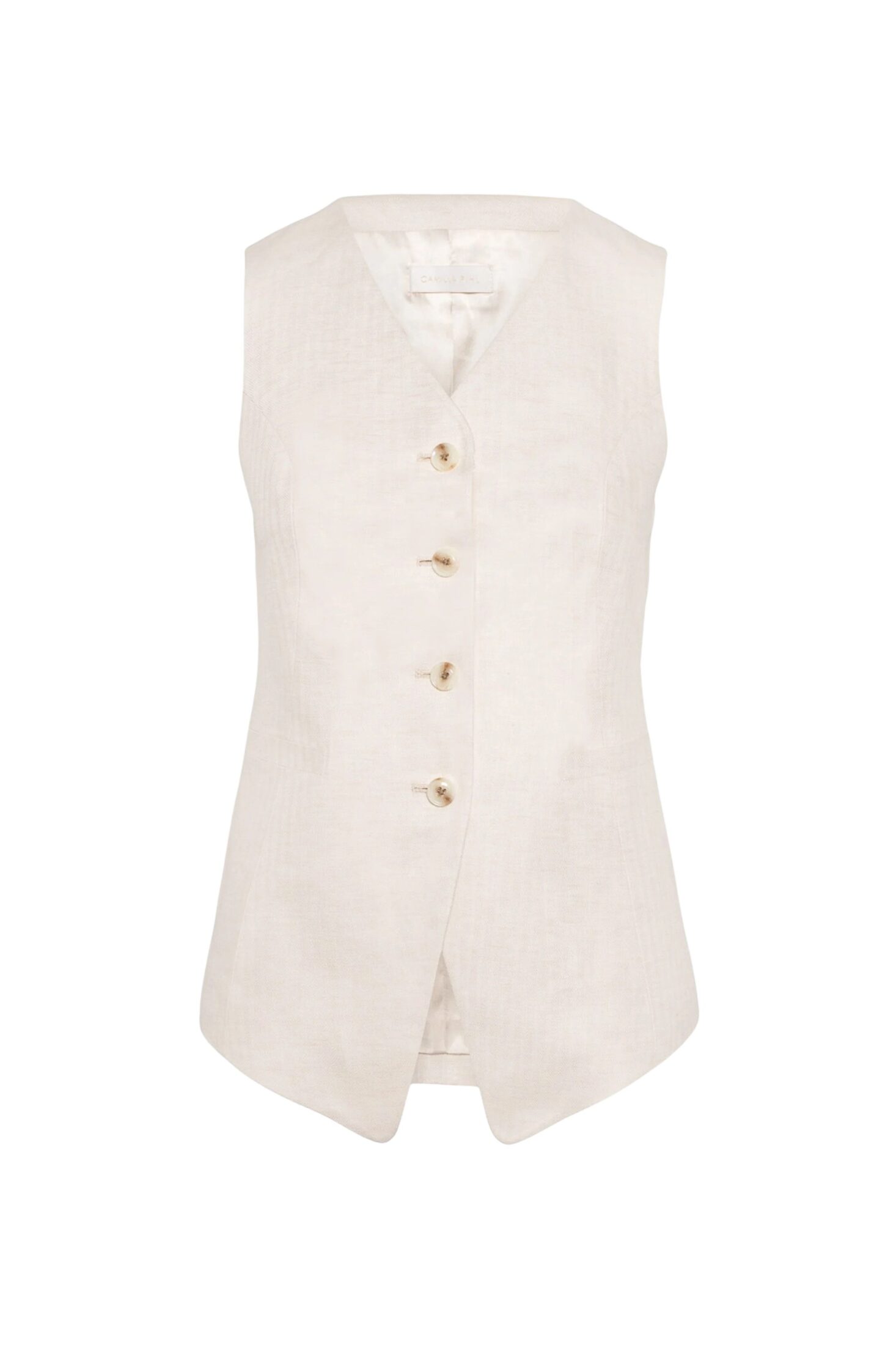 Angel Vest fra Camilla Pihl. Laget i en eksklusiv lin- og viskoseblanding med subtil fiskebensstruktur som gir et sofistikert uttrykk. Den lange silhuetten og den smale passformen skaper et moderne, skreddersydd preg. Perfekt alene eller stylet lag-på-lag for en elegant og gjennomført look.