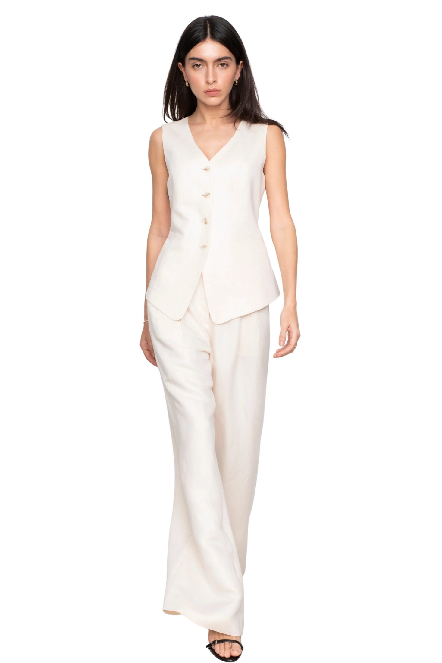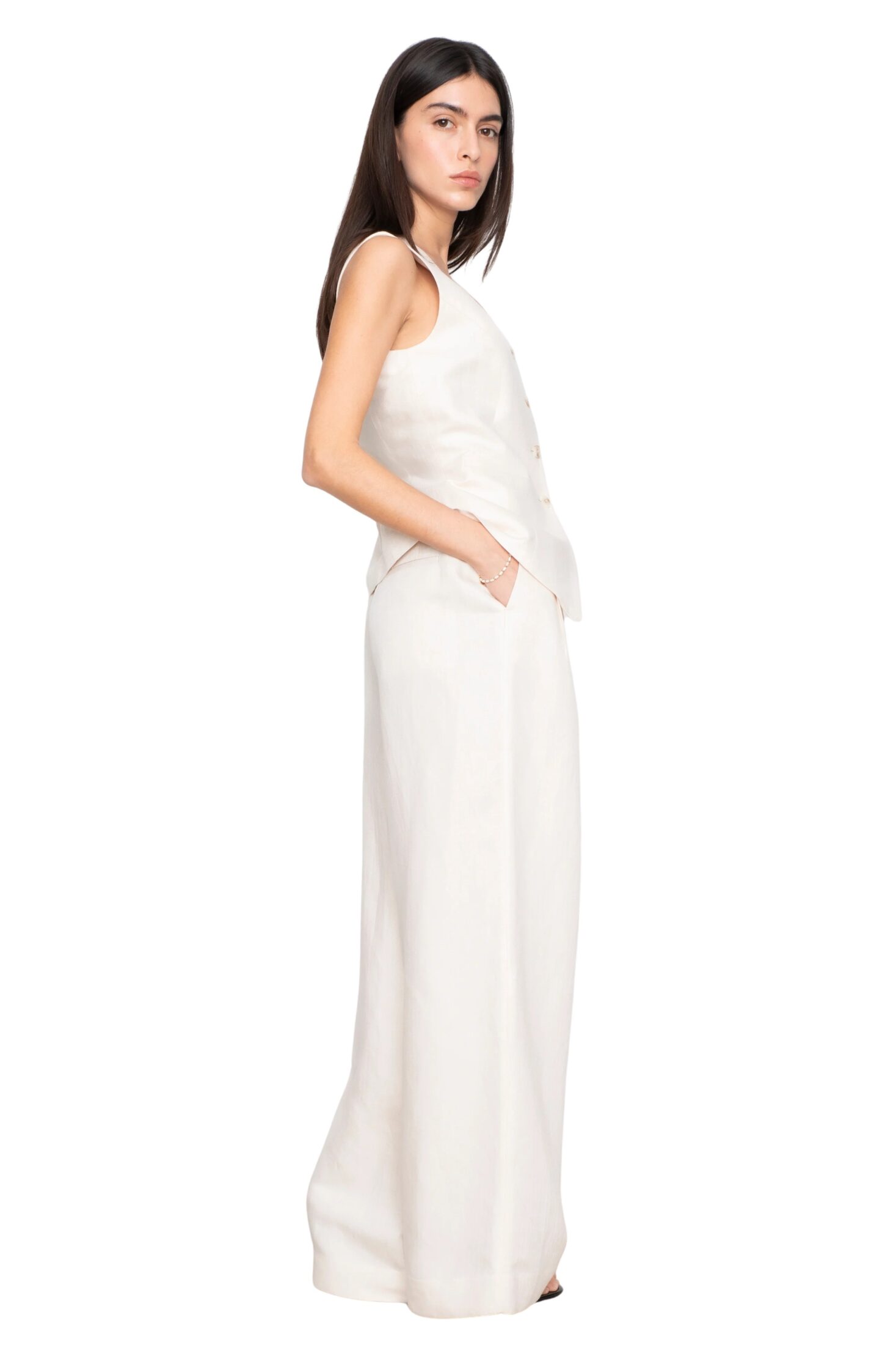Angie Trouser fra Camilla Pihl. En elegant dressbukse i en linblanding med subtil fiskebensstruktur. Den har høy midje, frontfolder og ekstra vide ben som skaper en moderne og forlenget silhuett. Et sofistikert plagg som gir et skreddersydd uttrykk til både hverdags- og festantrekk.