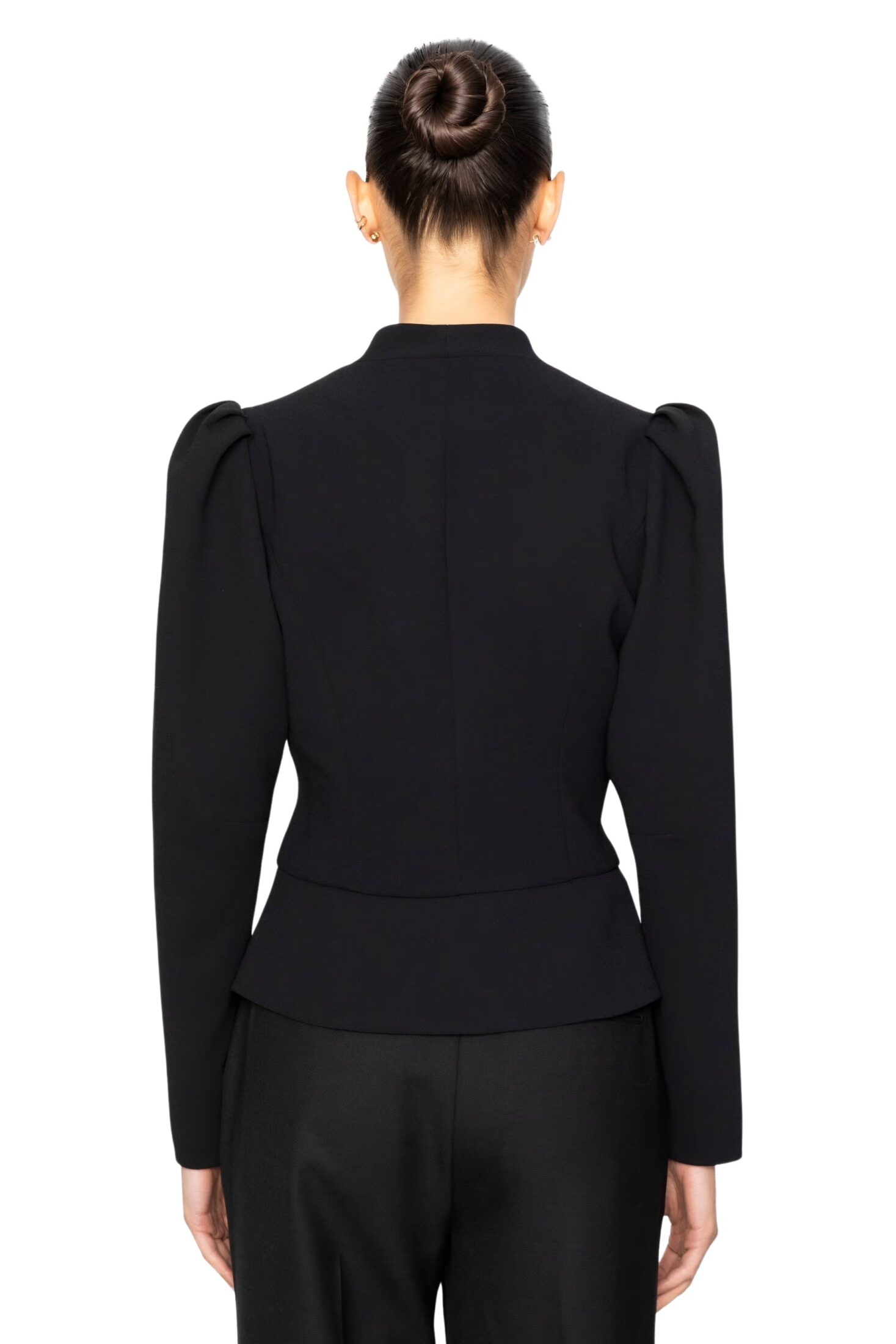 Jakke til dame fra Camilla Pihl. Designet med en flatterende peplum-midje som skaper en myk og feminin silhuett. Prydet med delikate perleknapper langs fronten, som gir et elegant preg til ethvert antrekk. Perfekt for både elegant hverdagsbruk og spesielle anledninger.