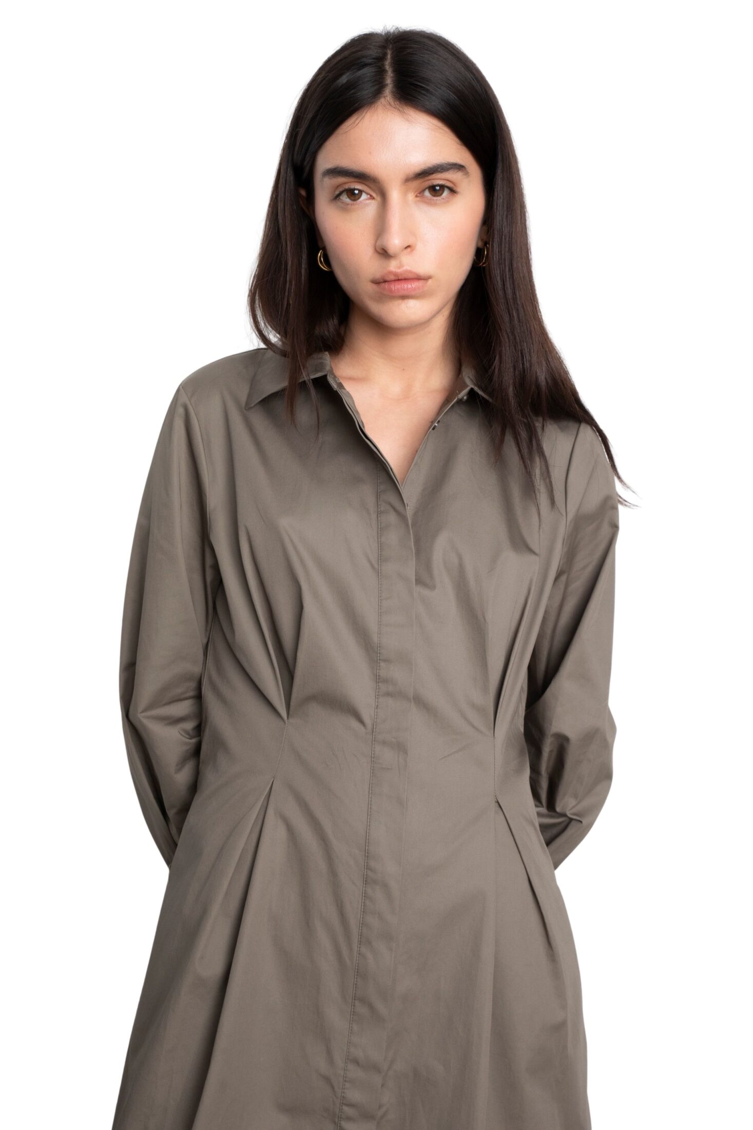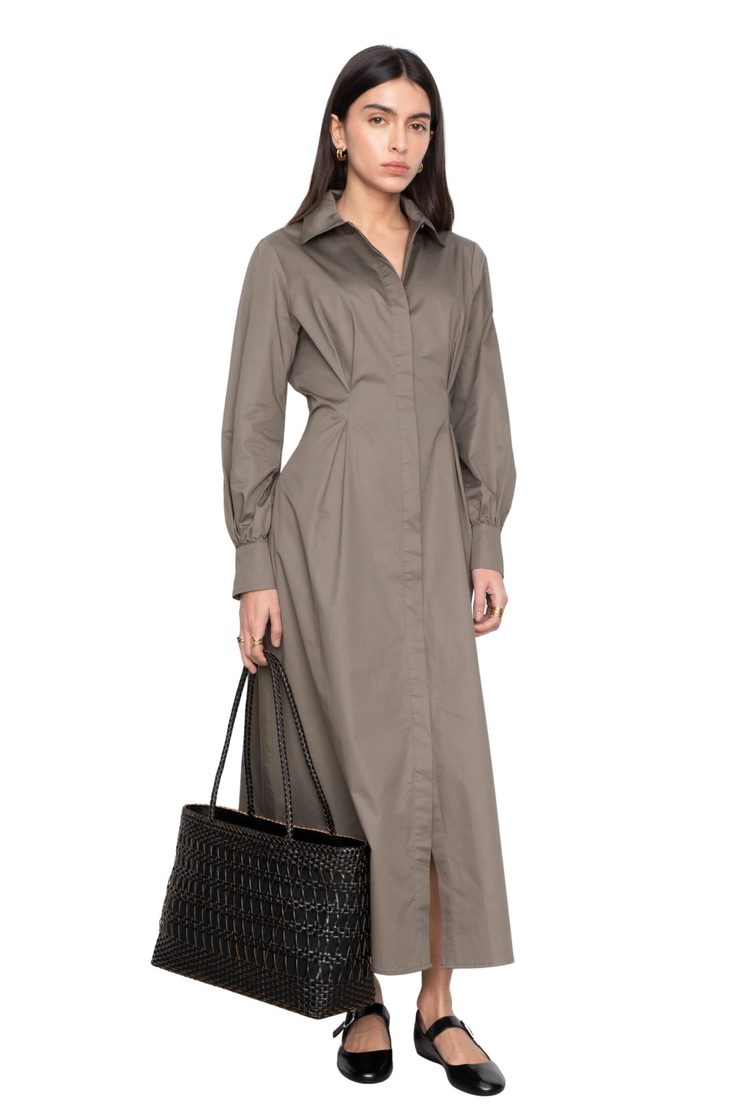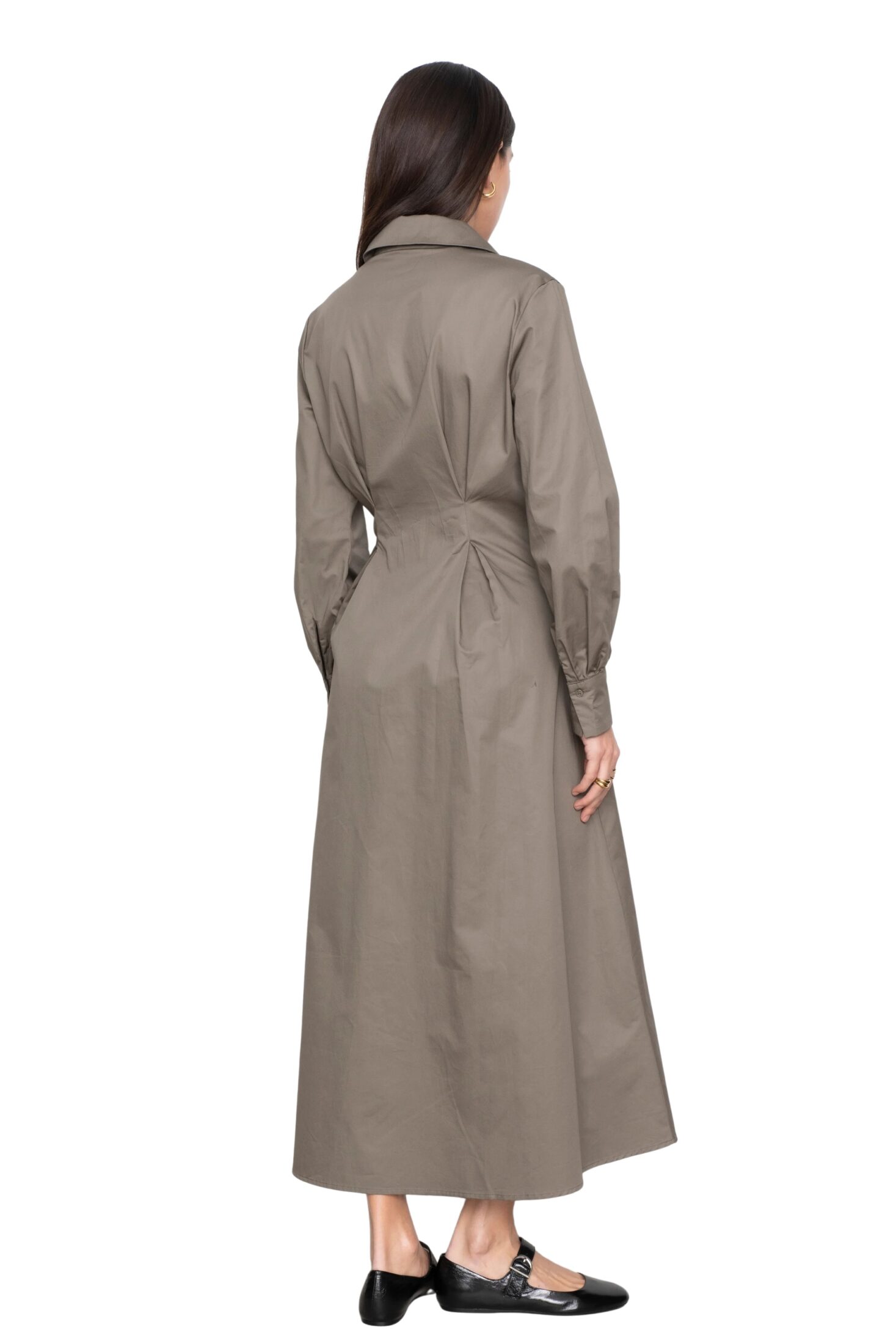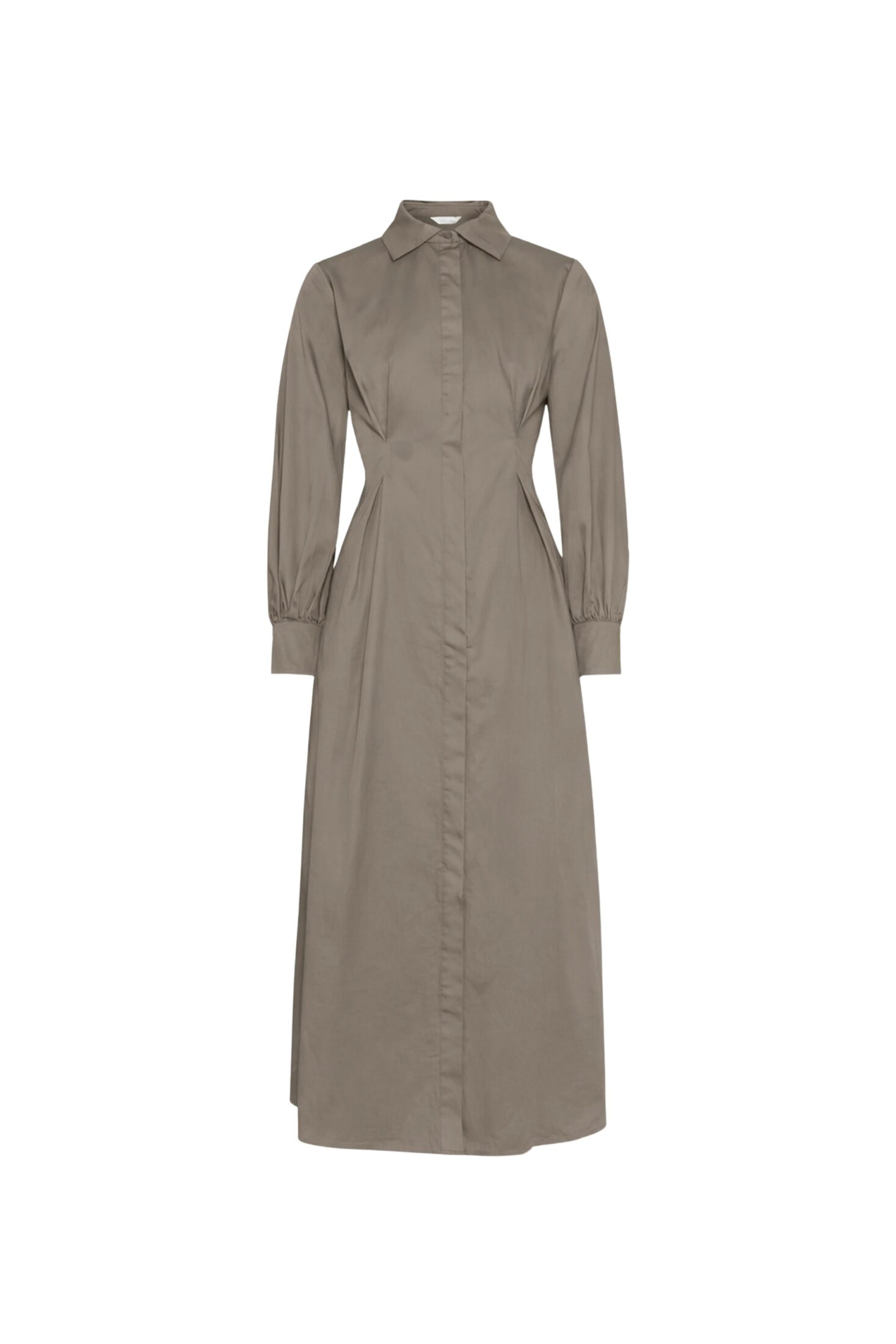 Leandra Dress fra Camilla Pihl. En elegant maxikjole i bomullssateng som gir et sofistikert uttrykk. Den har folder i midjen som fremhever silhuetten, kombinert med et utsvingt skjørt for en feminin fasong. Lange ermer med mansjetter og skjortekrage fullfører det tidløse designet.