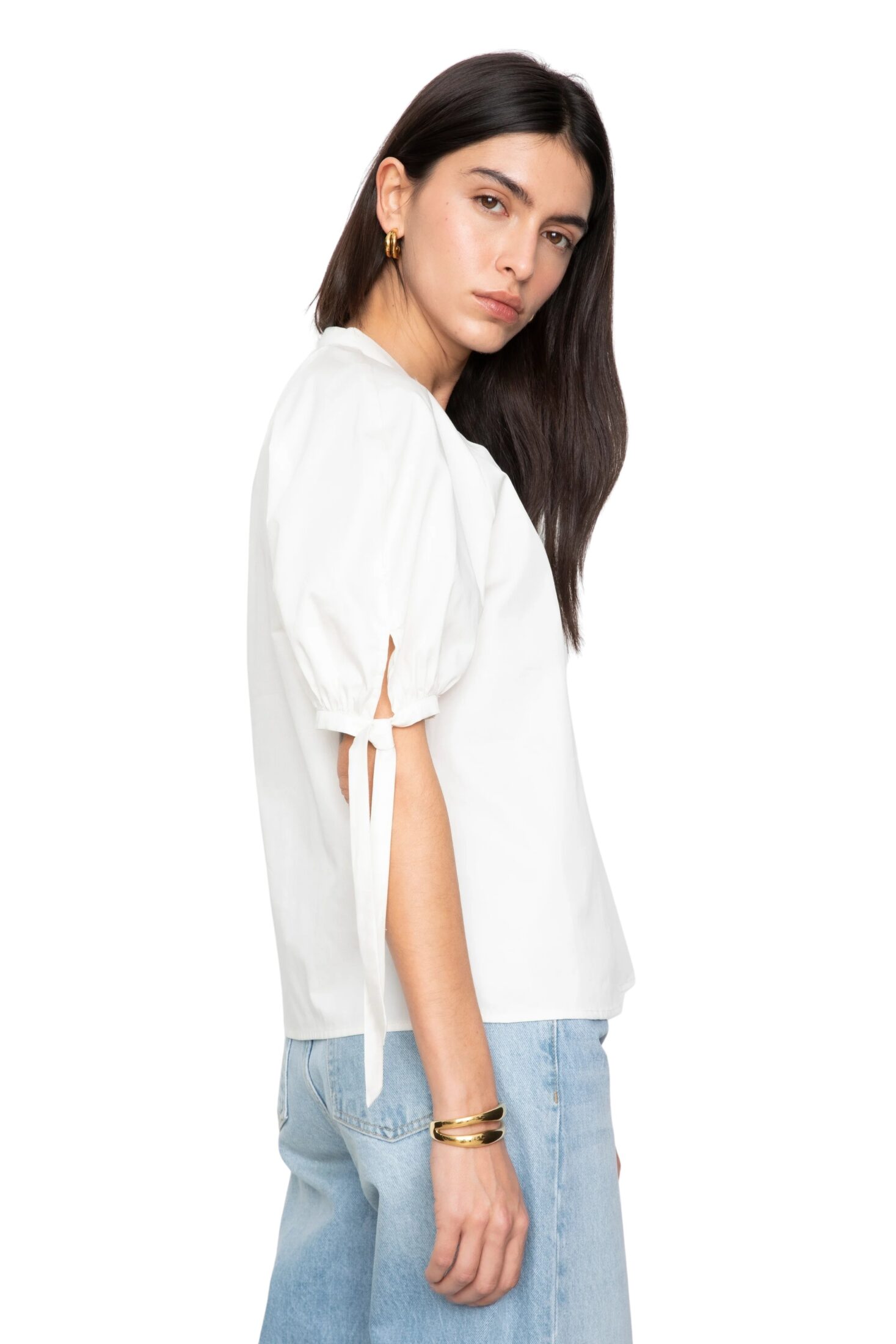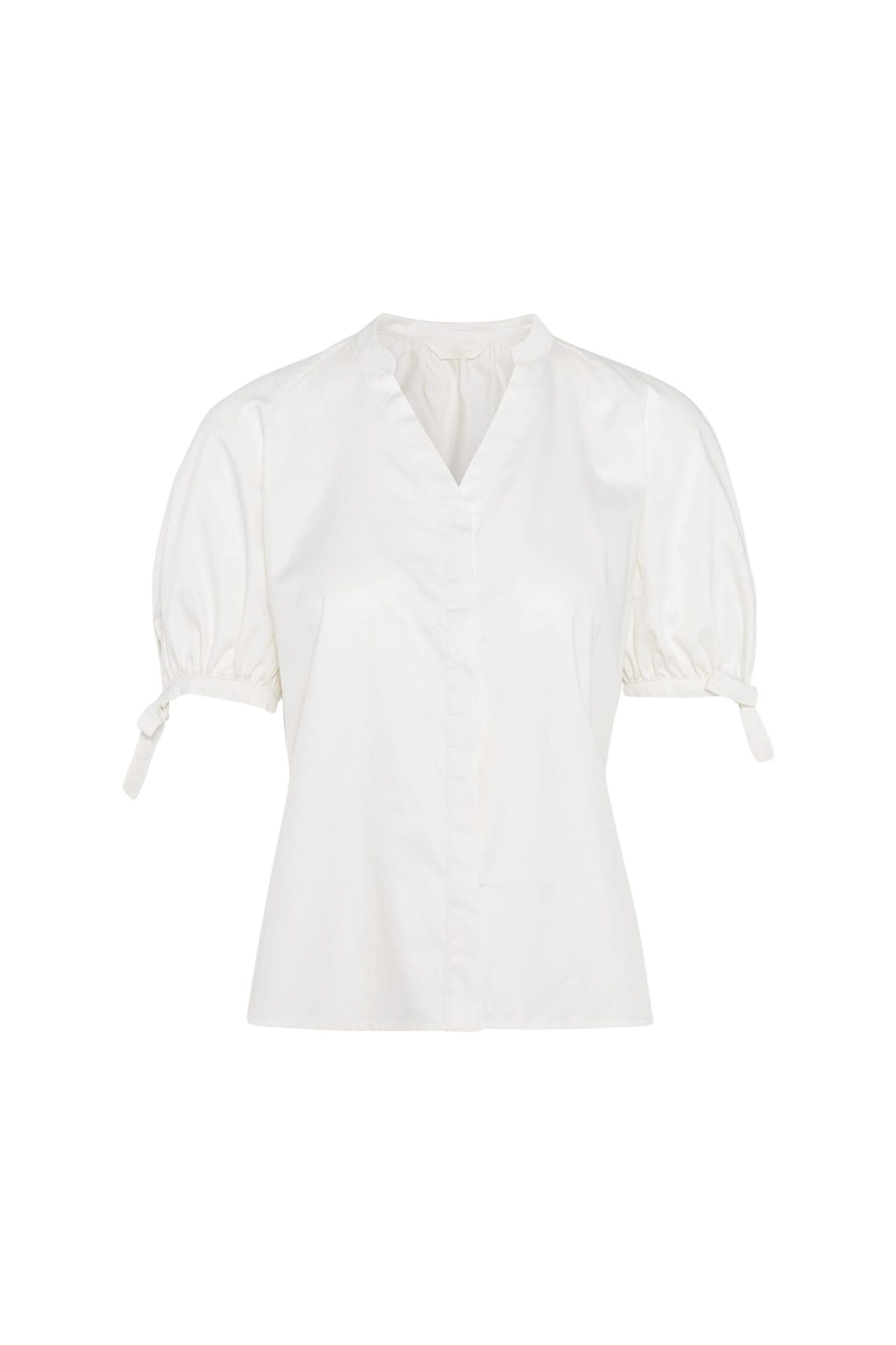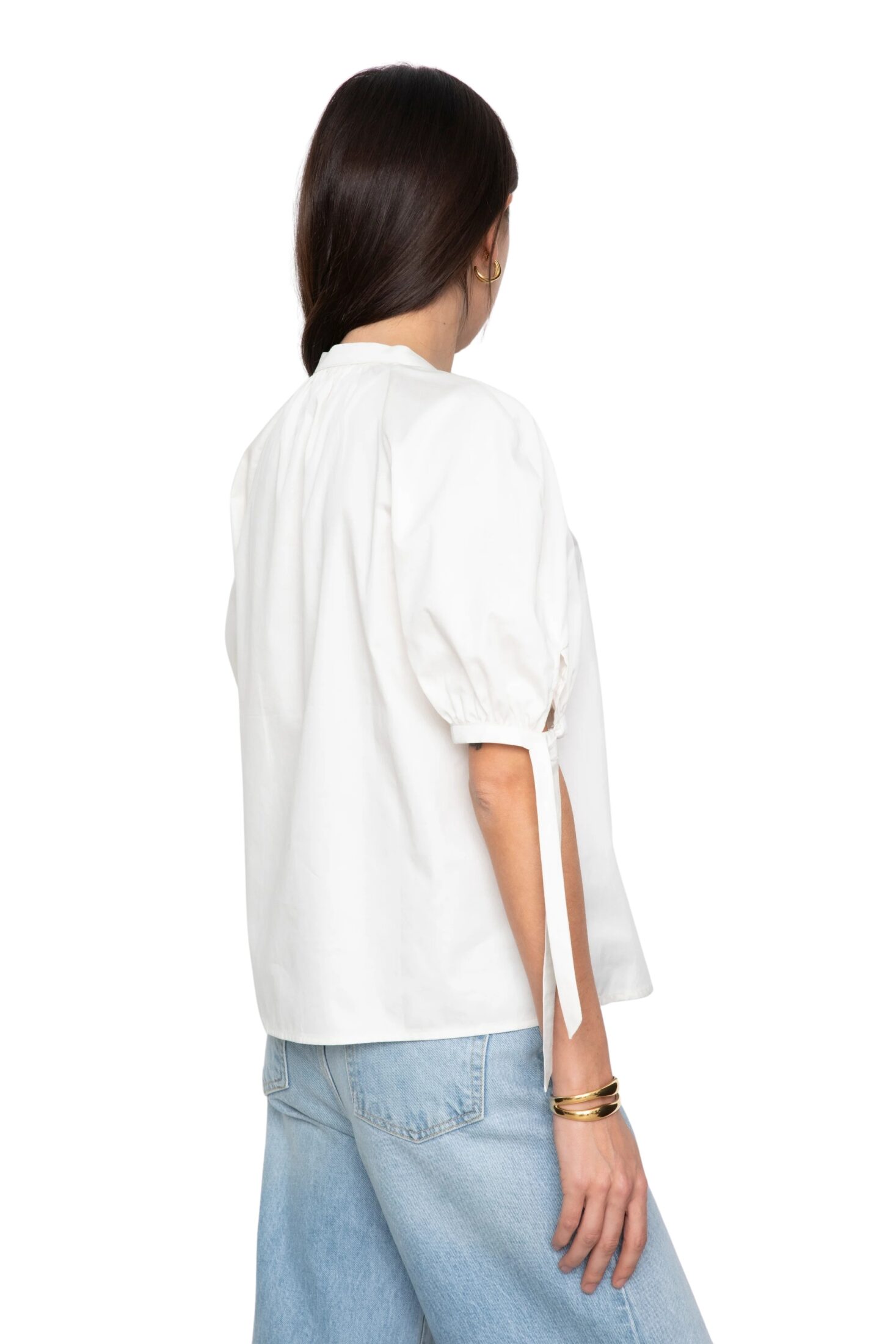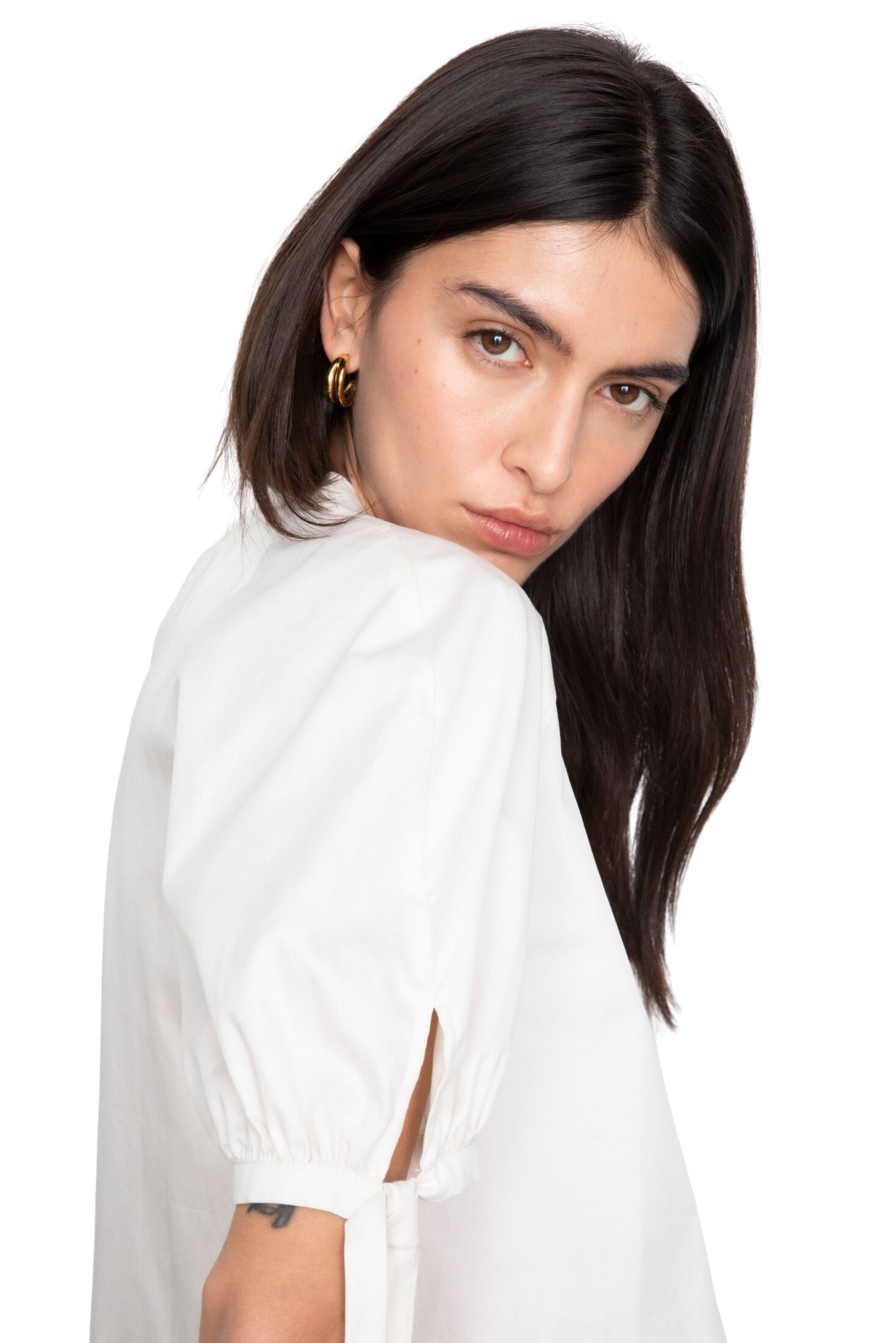 Liza Blouse fra Camilla Pihl. Laget i bomullssateng og har korte puffede ermer med justerbare knytebånd. Designet med en avslappet passform og V-hals, samt skjult knappelukking i front som gir et rent og feminint uttrykk.
