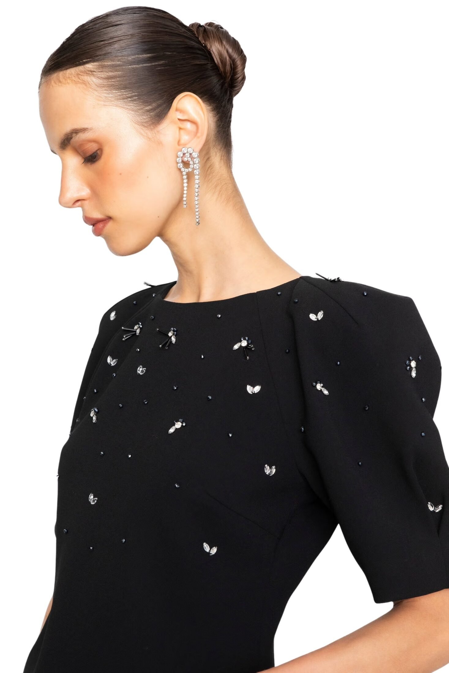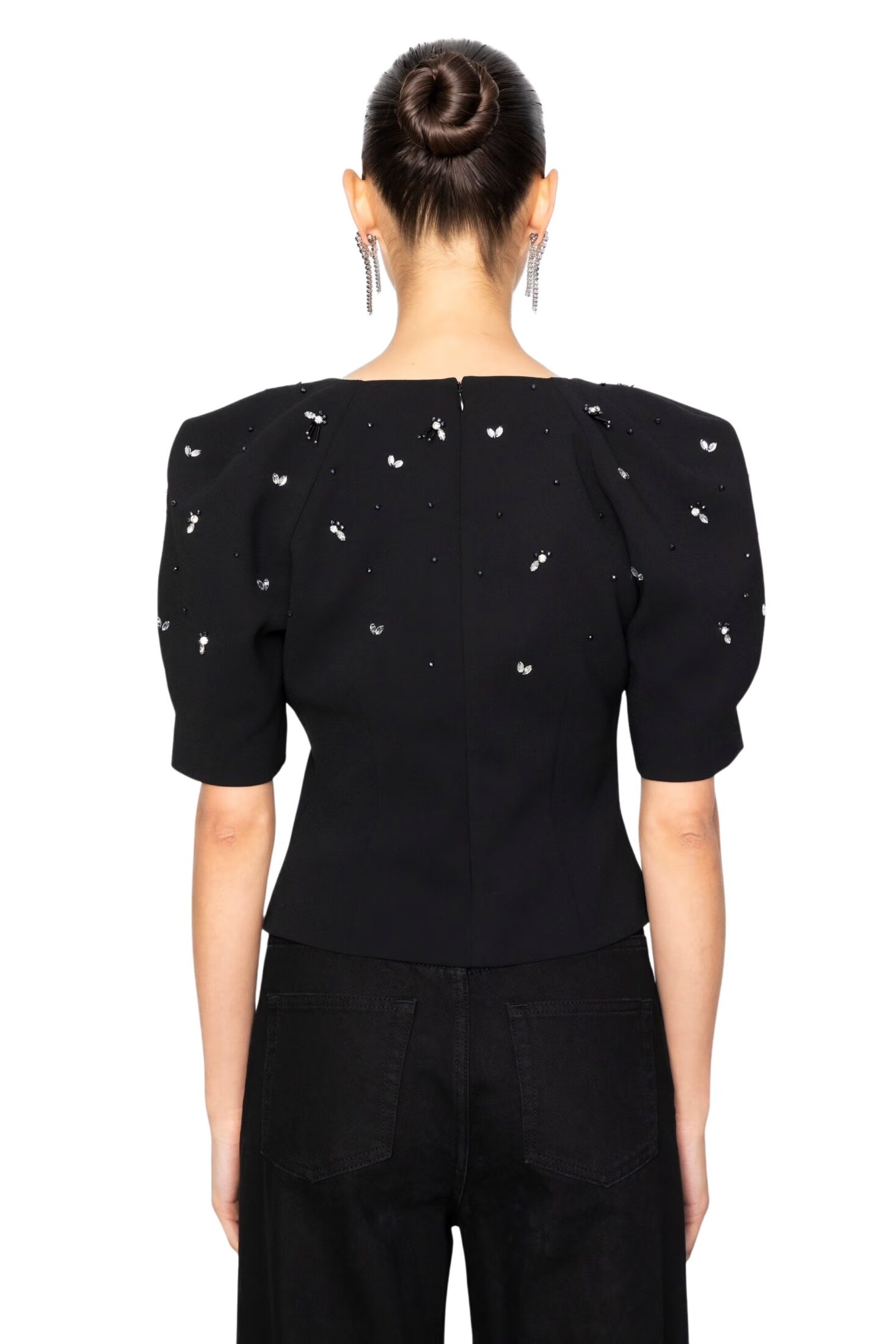 Topp til dame fra Camilla Pihl. Kortermet topp med glitrende utsmykninger øverst foran. Toppen har raglanermer og diskré skulderputer for ekstra struktur.