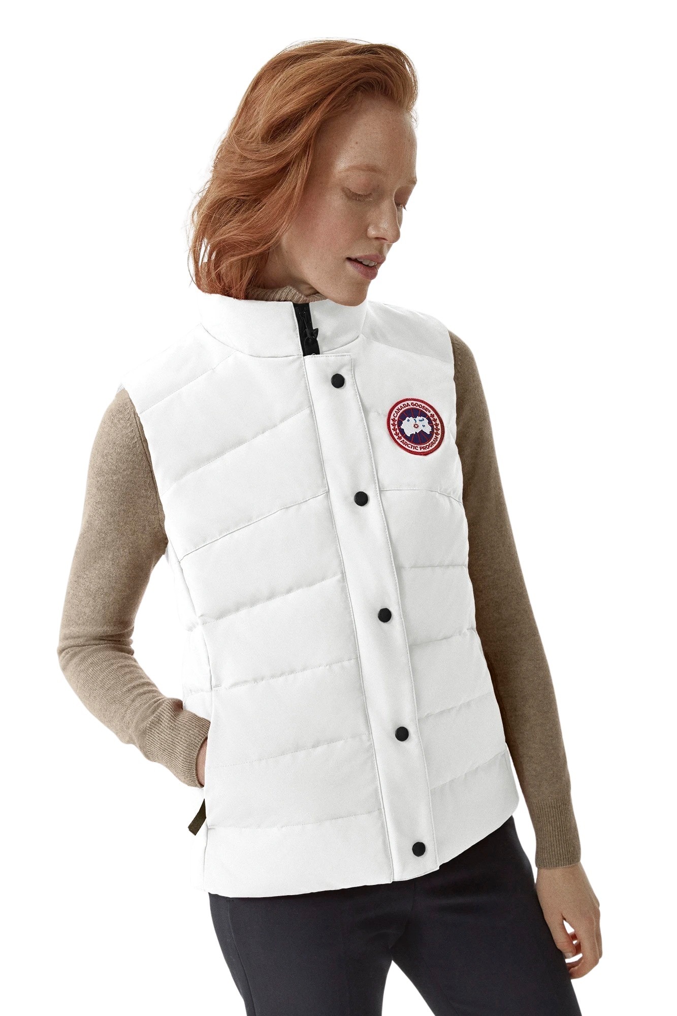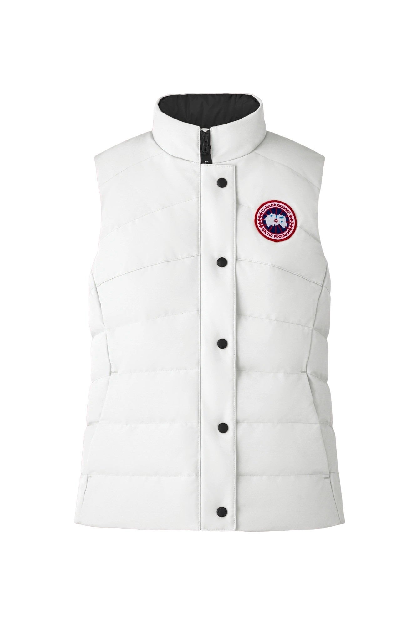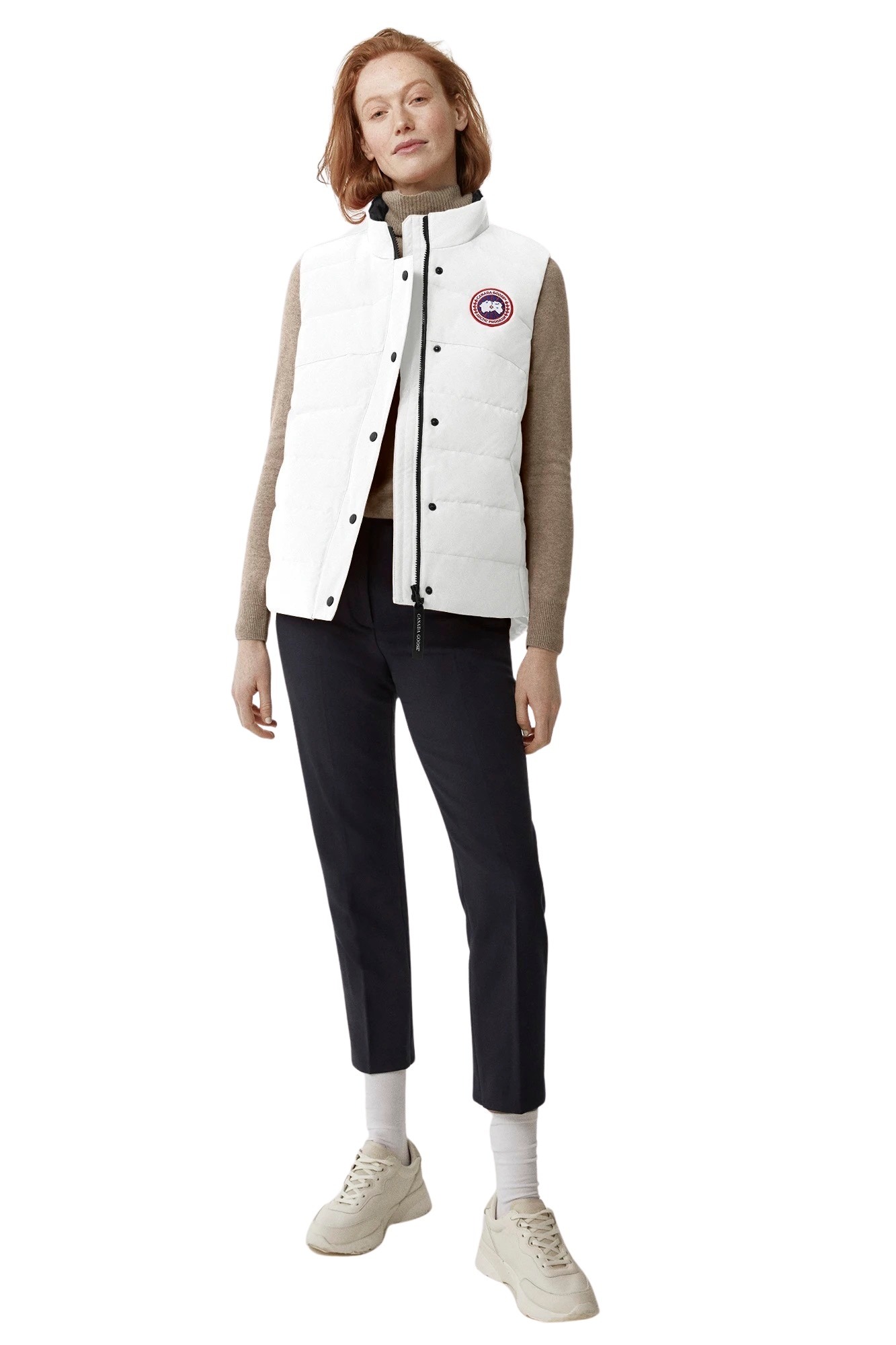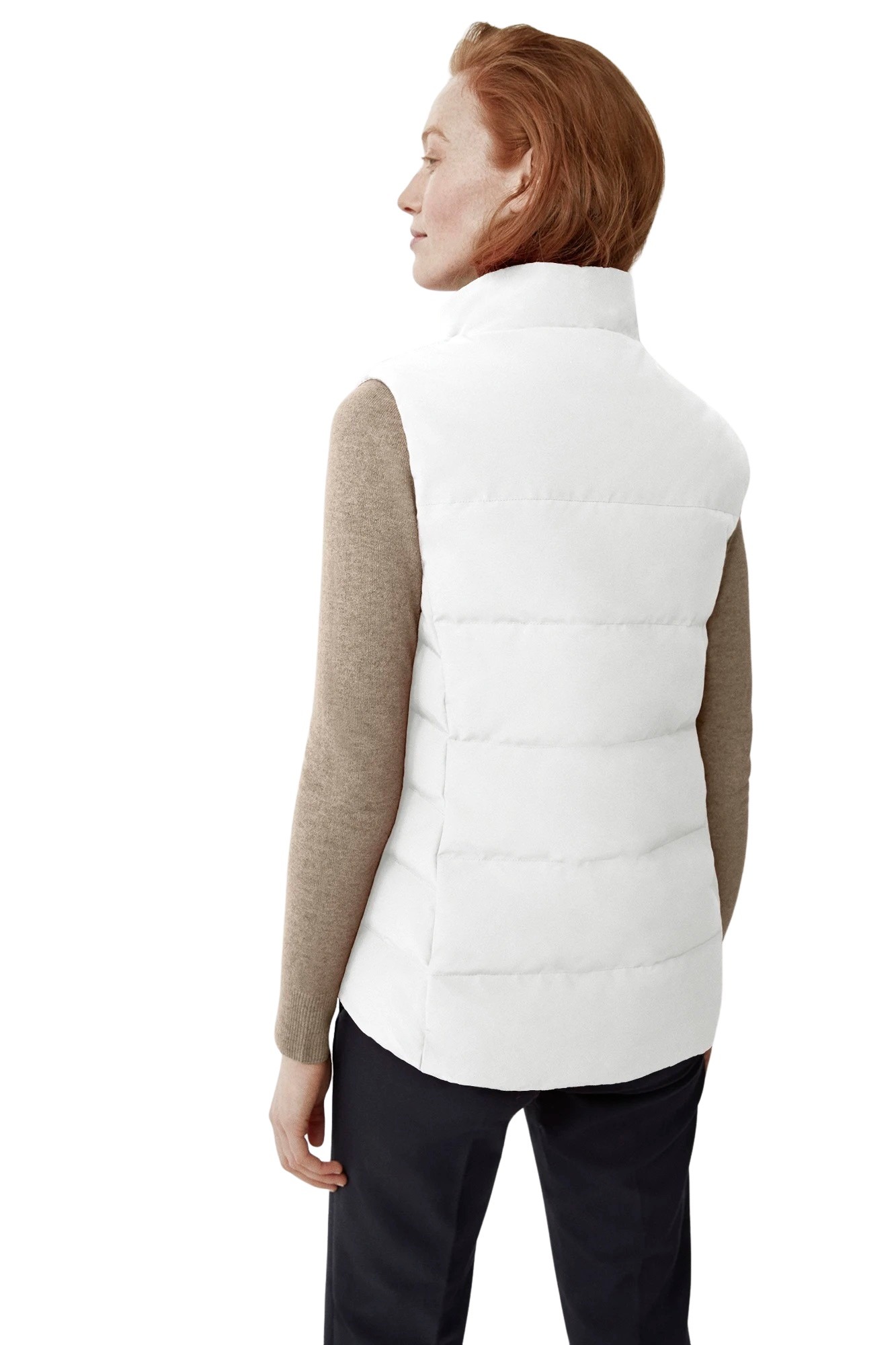Vest til dame fra Canada Goose. Denne dunfylte vesten er et allsidig plagg som kan brukes som et lag under en jakke eller alene når været tillater det. Reflekterende detaljer på baksiden av kragen og brodert logo på venstre bryst.