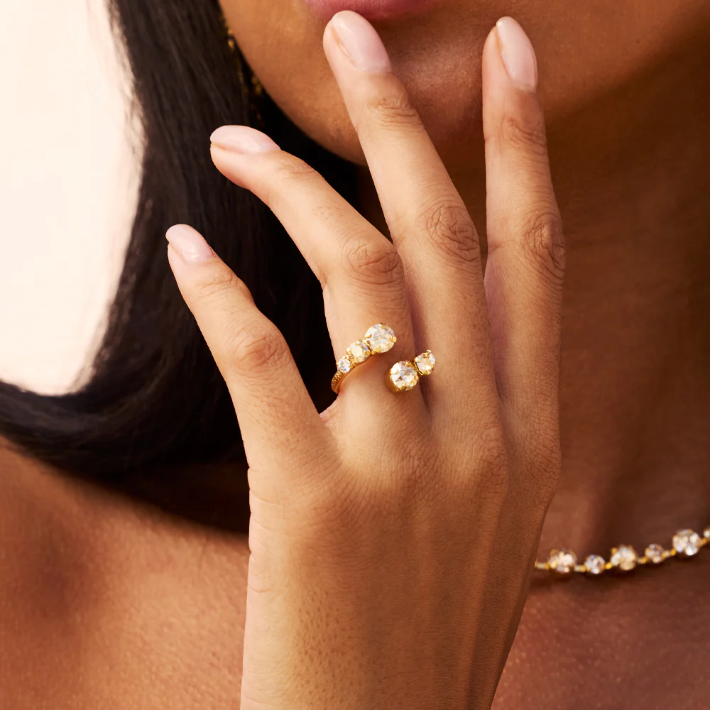Halo Ring fra Caroline Svedbom. En elegant ring med et åpent design, prydet med glitrende krystaller som smyger seg vakkert rundt fingeren. Den gir et moderne og sofistikert uttrykk. Perfekt både alene og i kombinasjon med andre ringer.