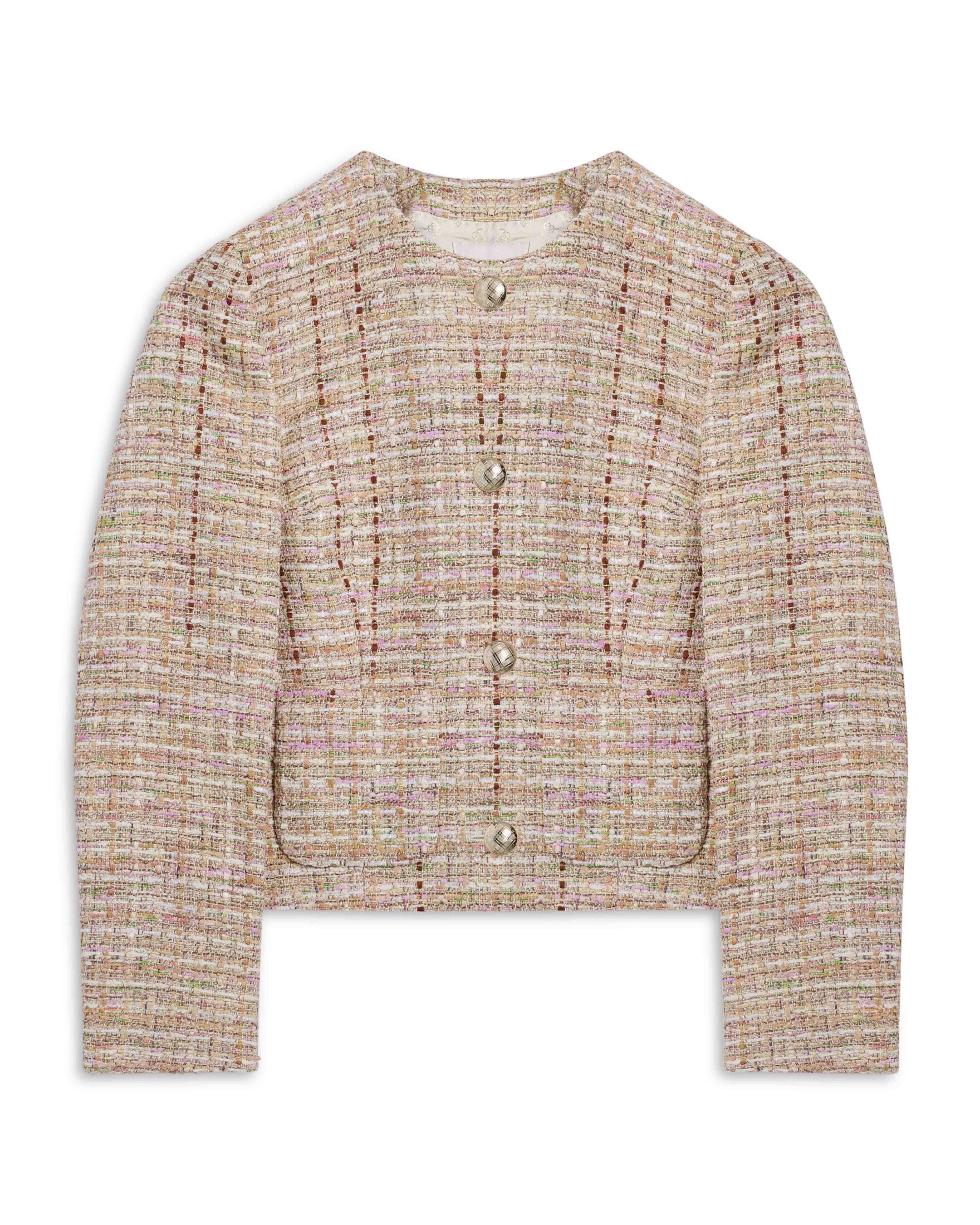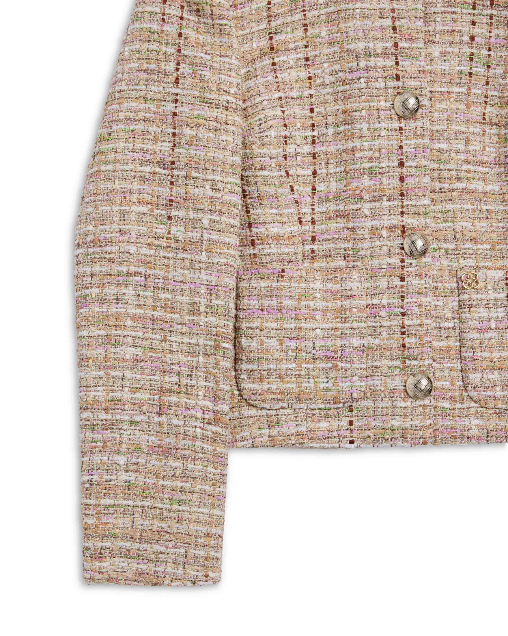 Ofelia fra Cavaliere. En elegant og feminin jakke med strukturert tweed som gir et eksklusivt uttrykk. De delikate fargetonene og dekorative knappene tilfører et sofistikert preg, perfekt til både selskap og stilfulle hverdagsantrekk. En tidløs statement-jakke som løfter ethvert antrekk.