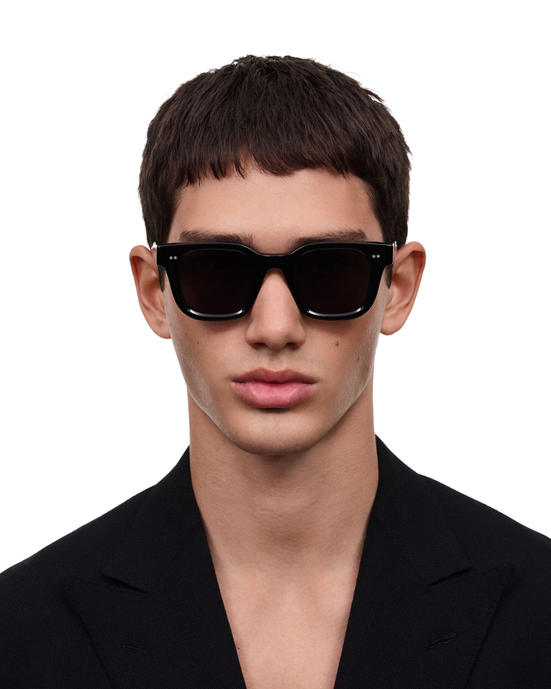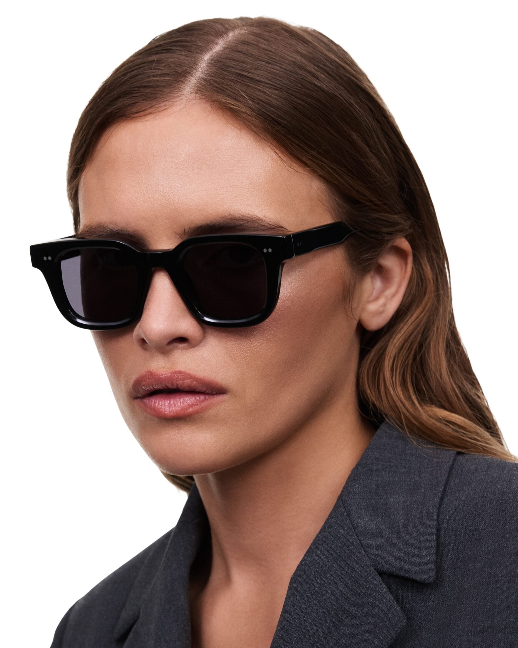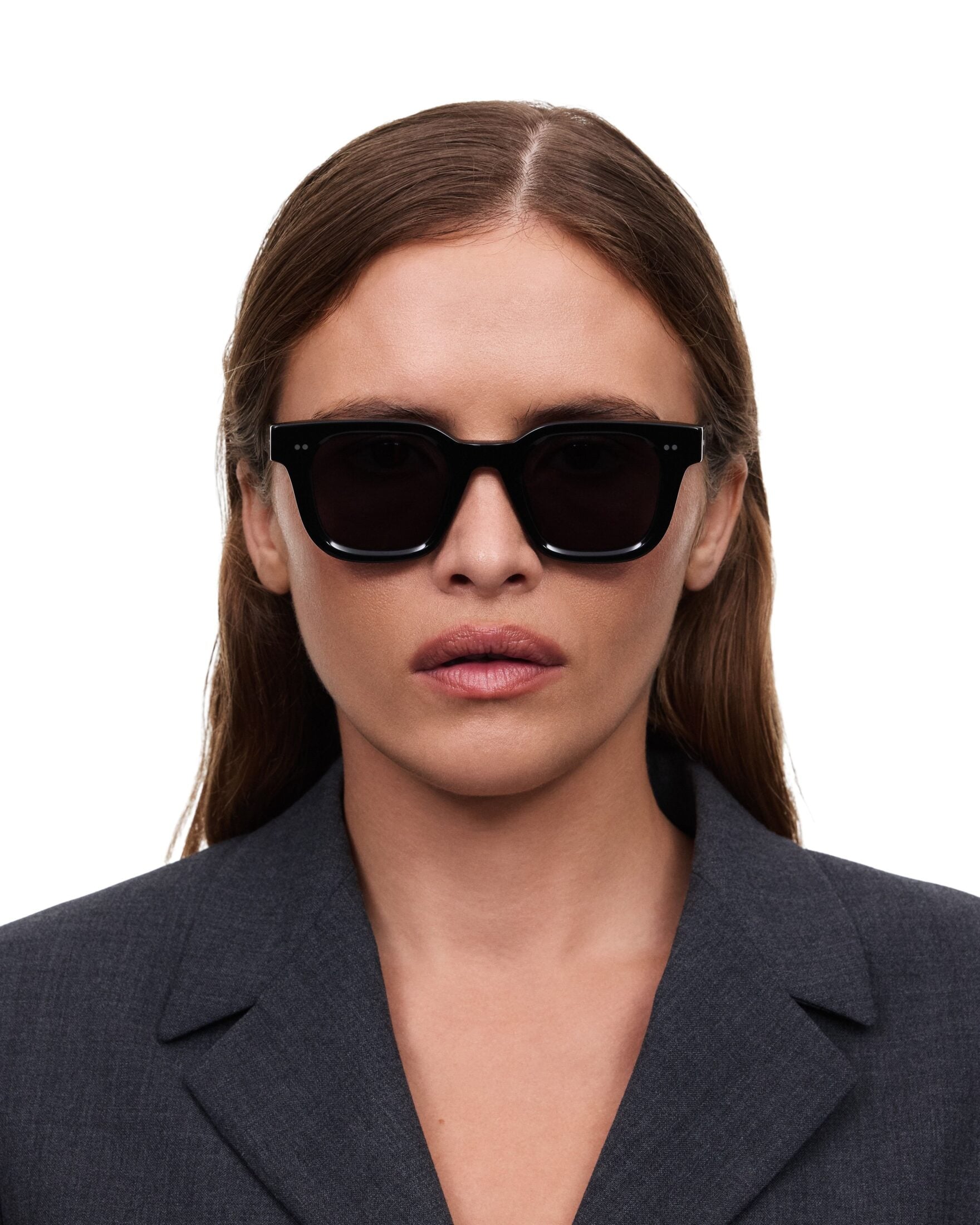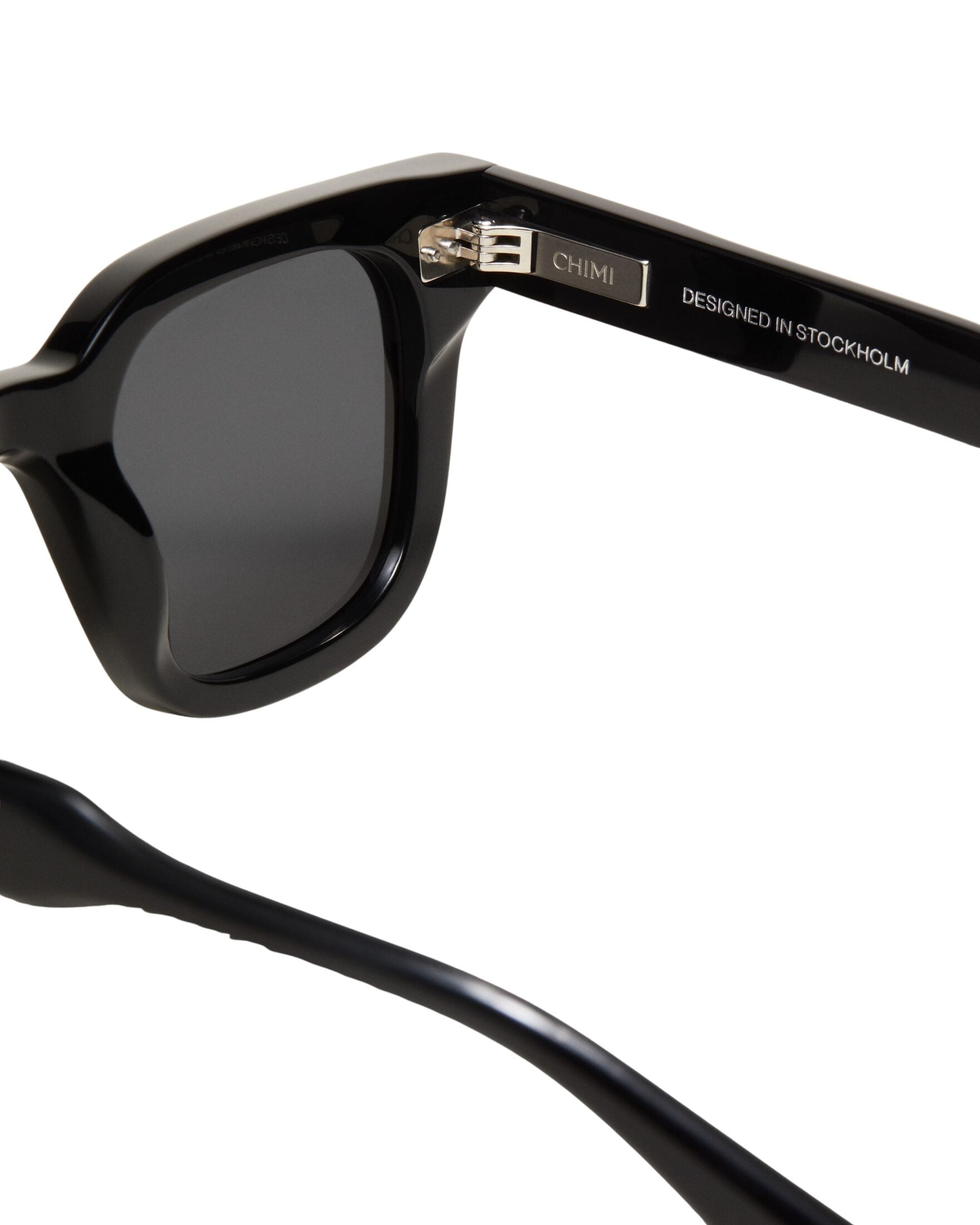 04 fra CHIMI. En moderne solbrille med markert, firkantet fasong som gir et tidløst og selvsikkert uttrykk. Sort innfatning kombinert med tonede glass gjør modellen både stilren og anvendelig til hverdagsbruk.