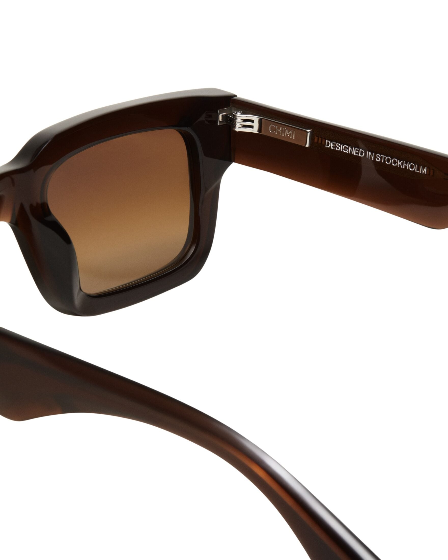 05 fra CHIMI. En markert, rektangulær fasong som gir et moderne og selvsikkert uttrykk. Den brune innfatningen med mørke glass gjør modellen enkel å style til både hverdag og mer dressed antrekk.