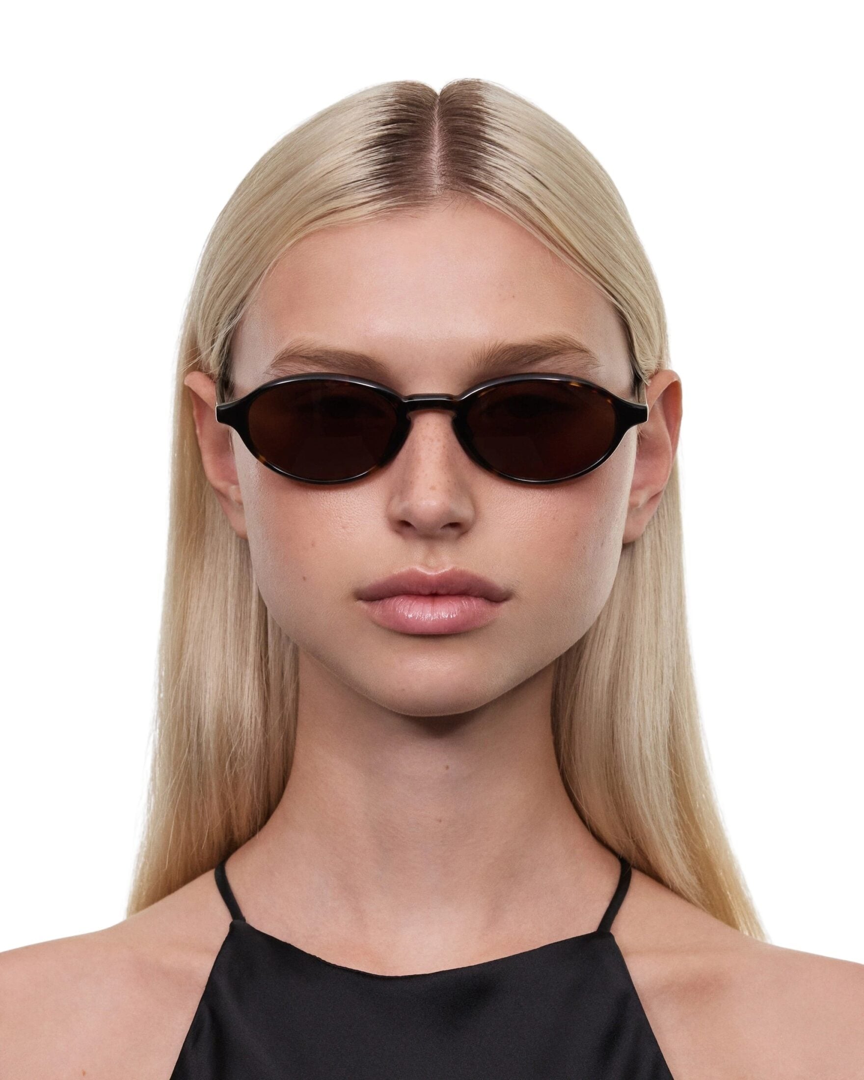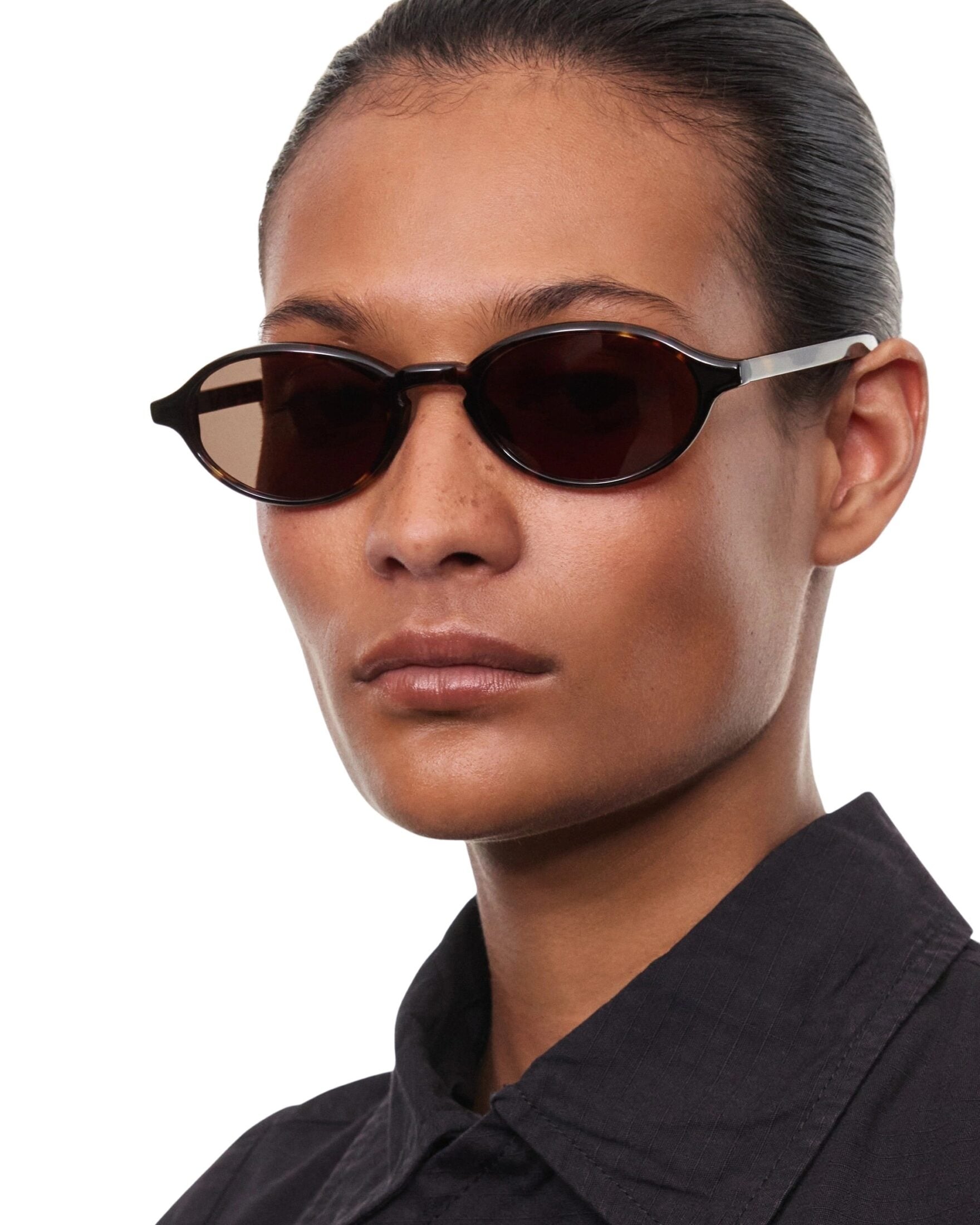 Lex fra CHIMI. En smal solbrille med oval fasong som gir et minimalistisk og edgy uttrykk. Den brune innfatningen og mørke glassene gjør modellen til et stilrent valg med tydelig karakter.