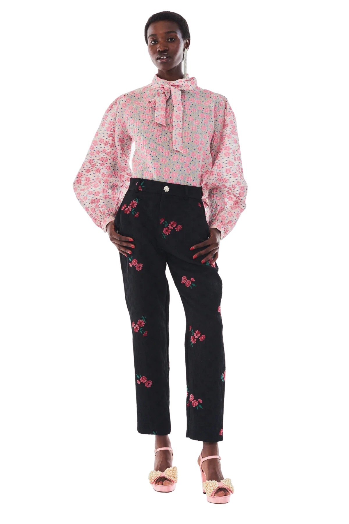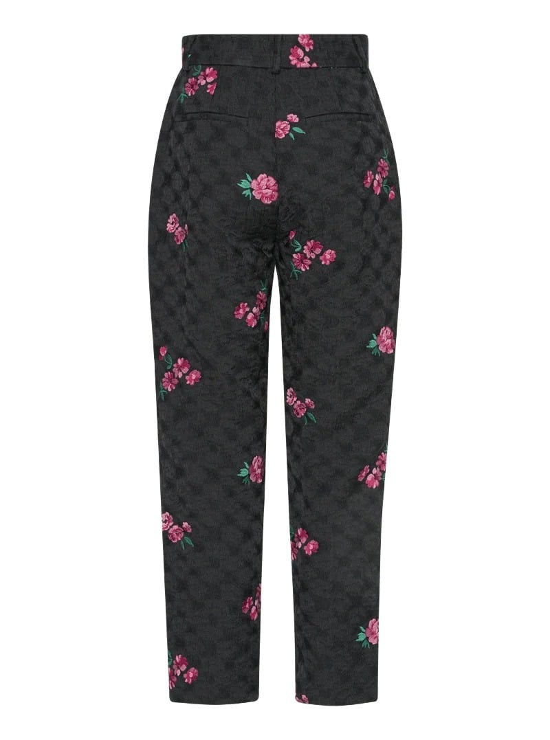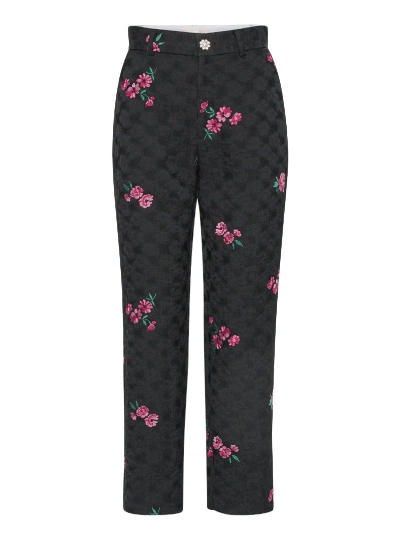 Fin dressbukse fra Custommade med svart med et elegant blomstertrykk og en krystallknapp. Fin å kombinere med en sort silkebluse og høye hæler
