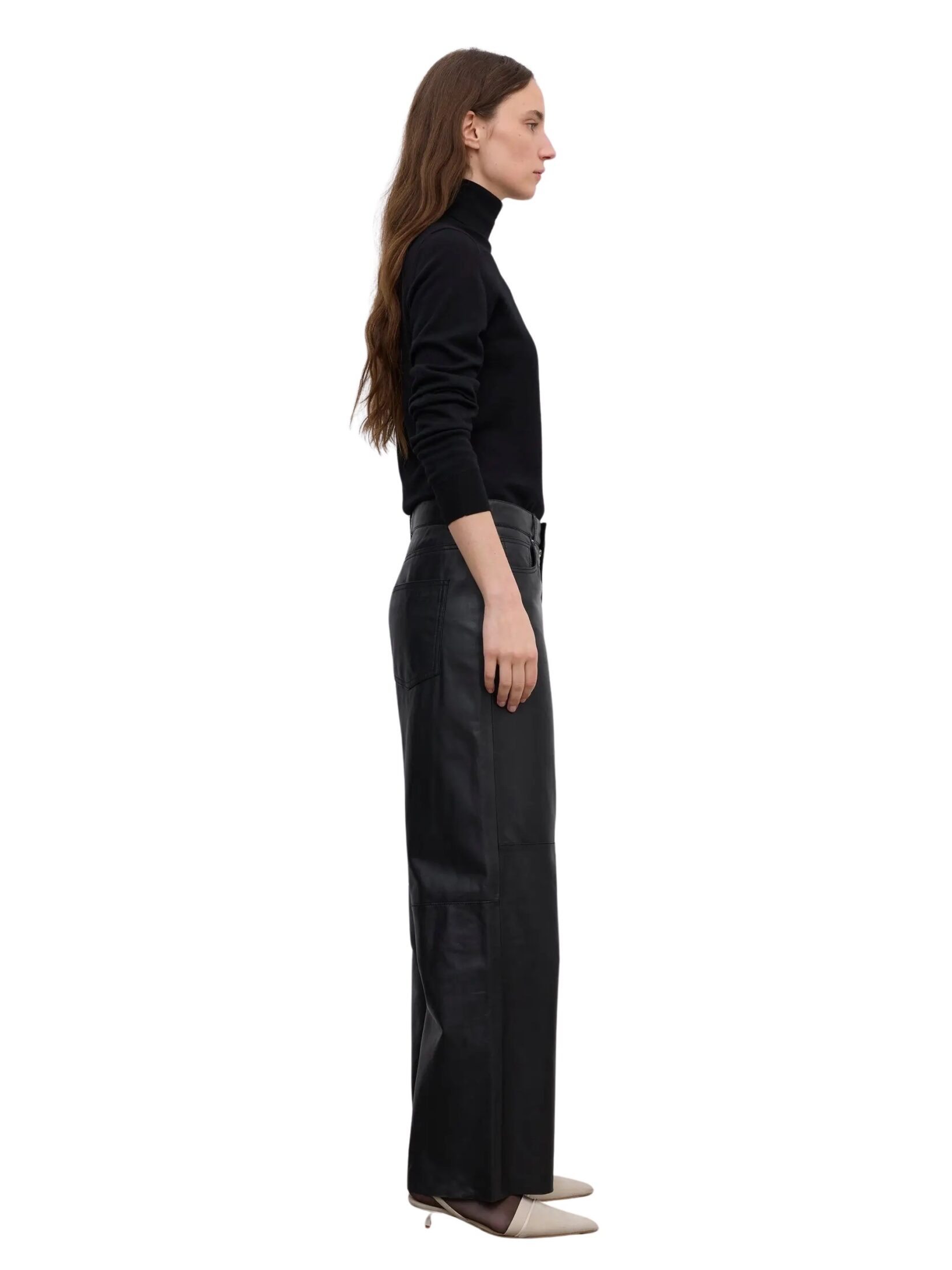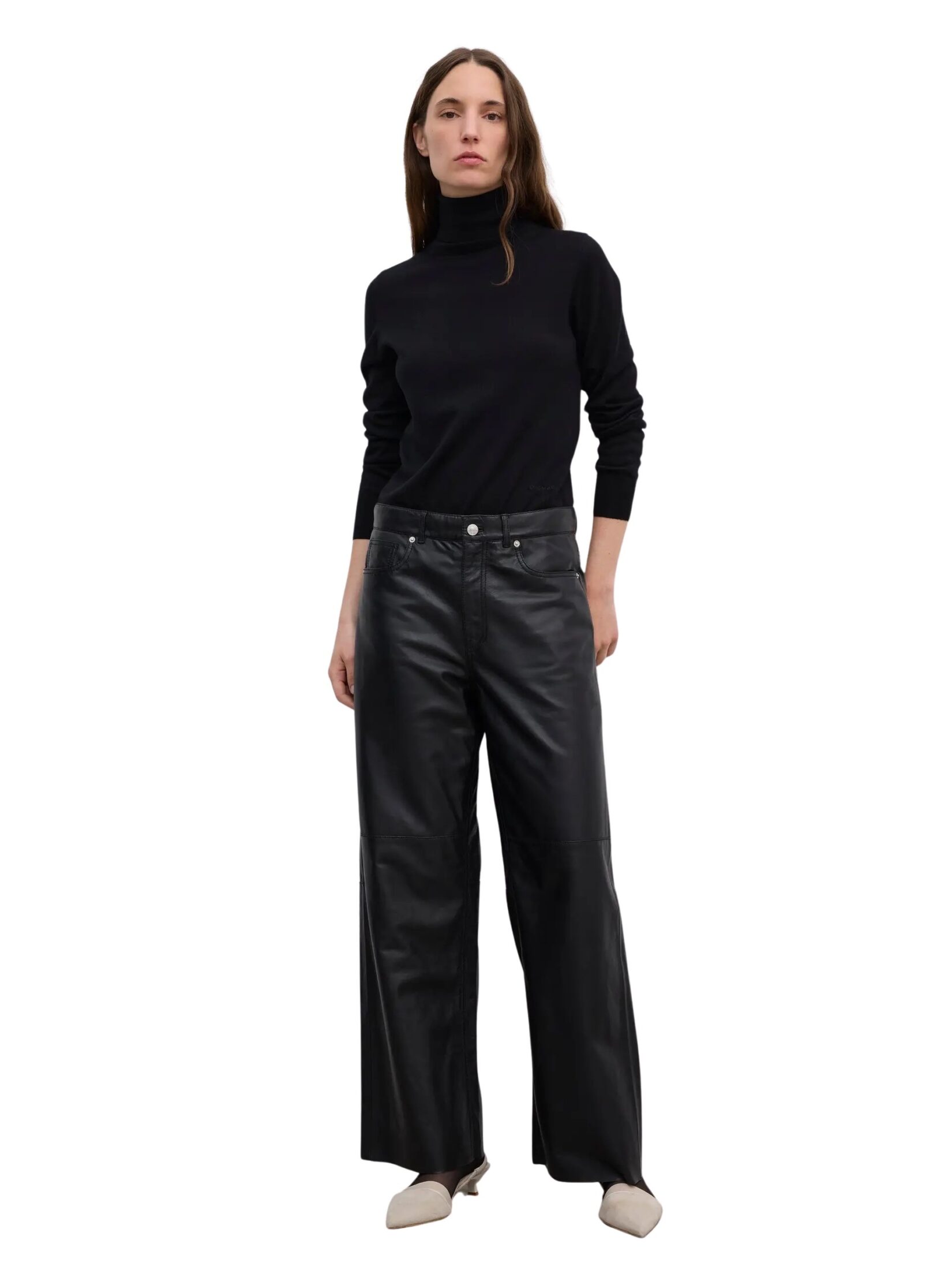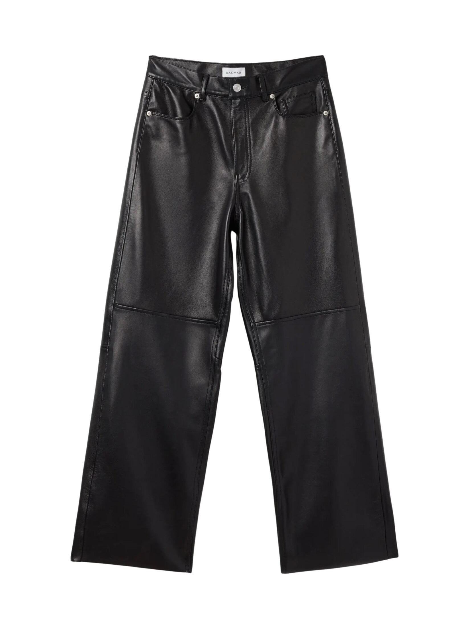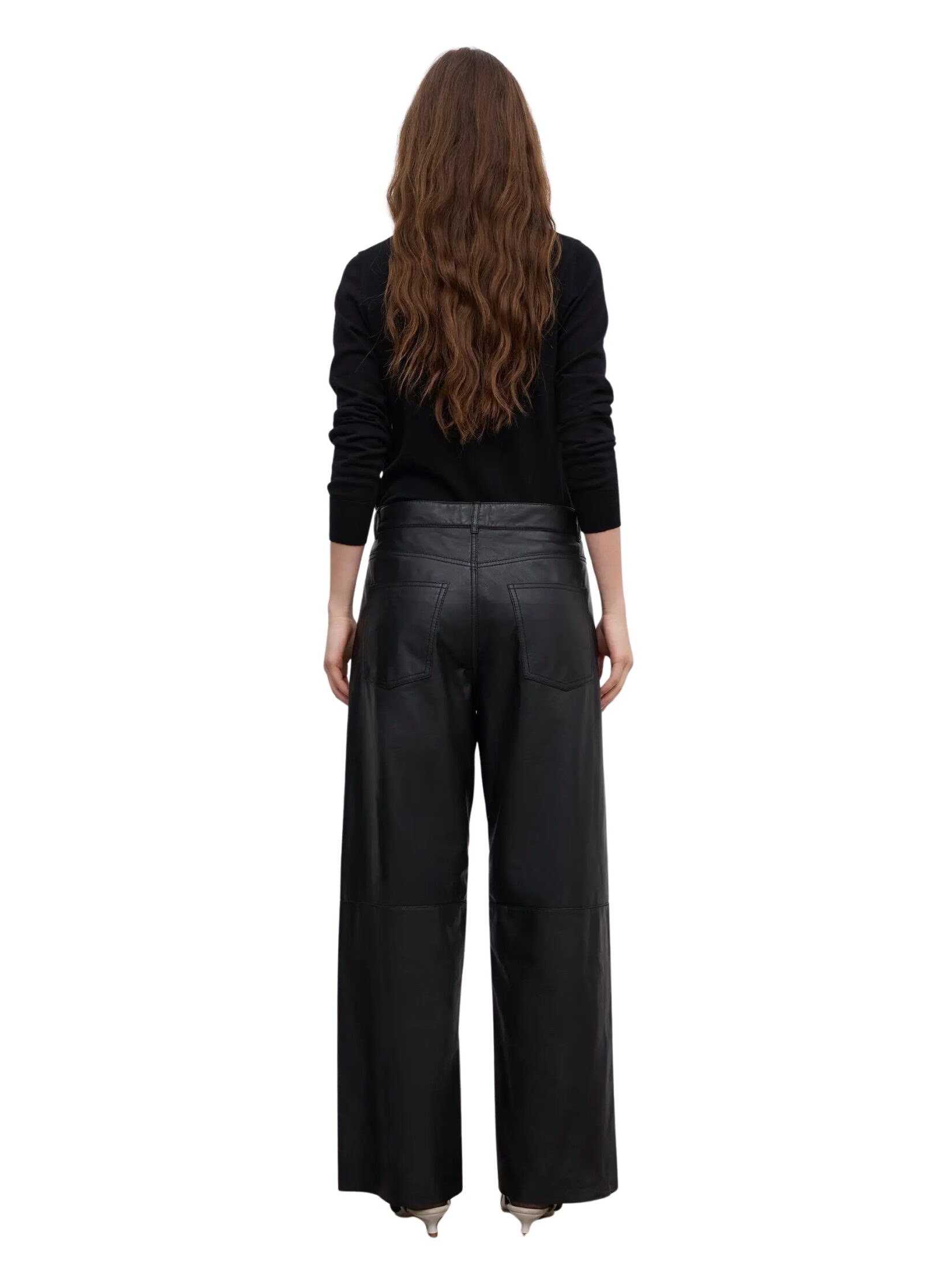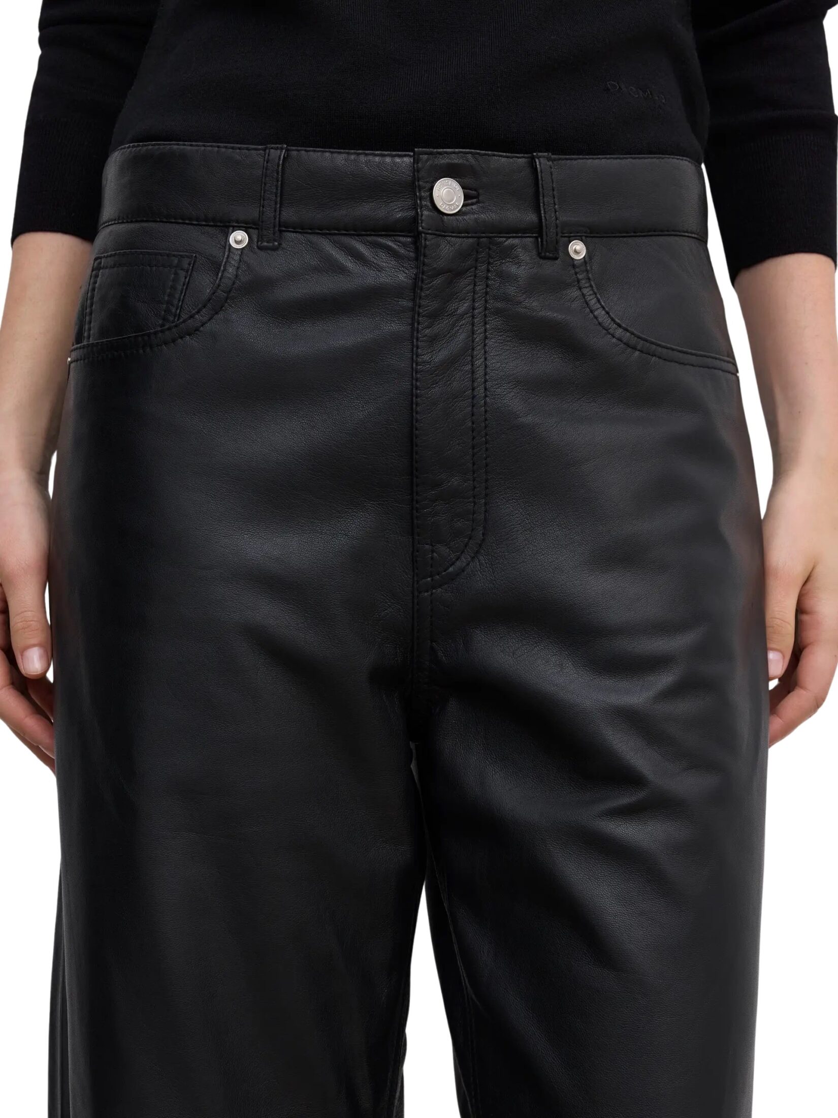 Skinnbukse til dame fra Dagmar. Buksen har mellomhøy midje og lange ben. Laget av elegant, mykt lammeskinn med avslappet passform, vide ben og klassisk 5-lommer.
